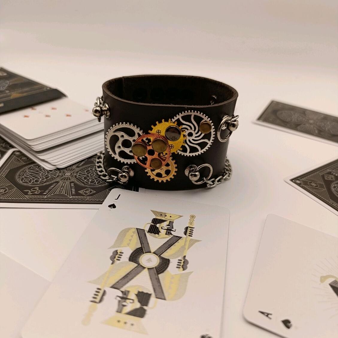 Браслет выполнен из натуральной кожи с металлическими элементами в эстетике steampunk.