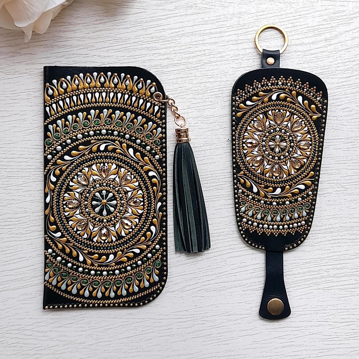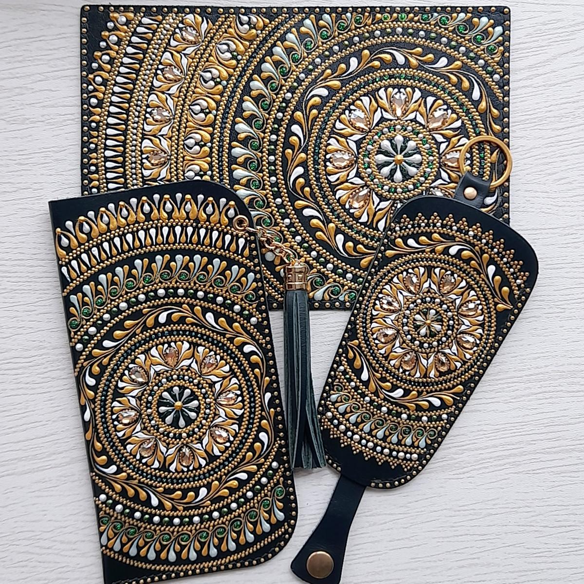 Комплект состоит из трех предметов: обложка для паспорта, чехол для очков, чехол для ключей.