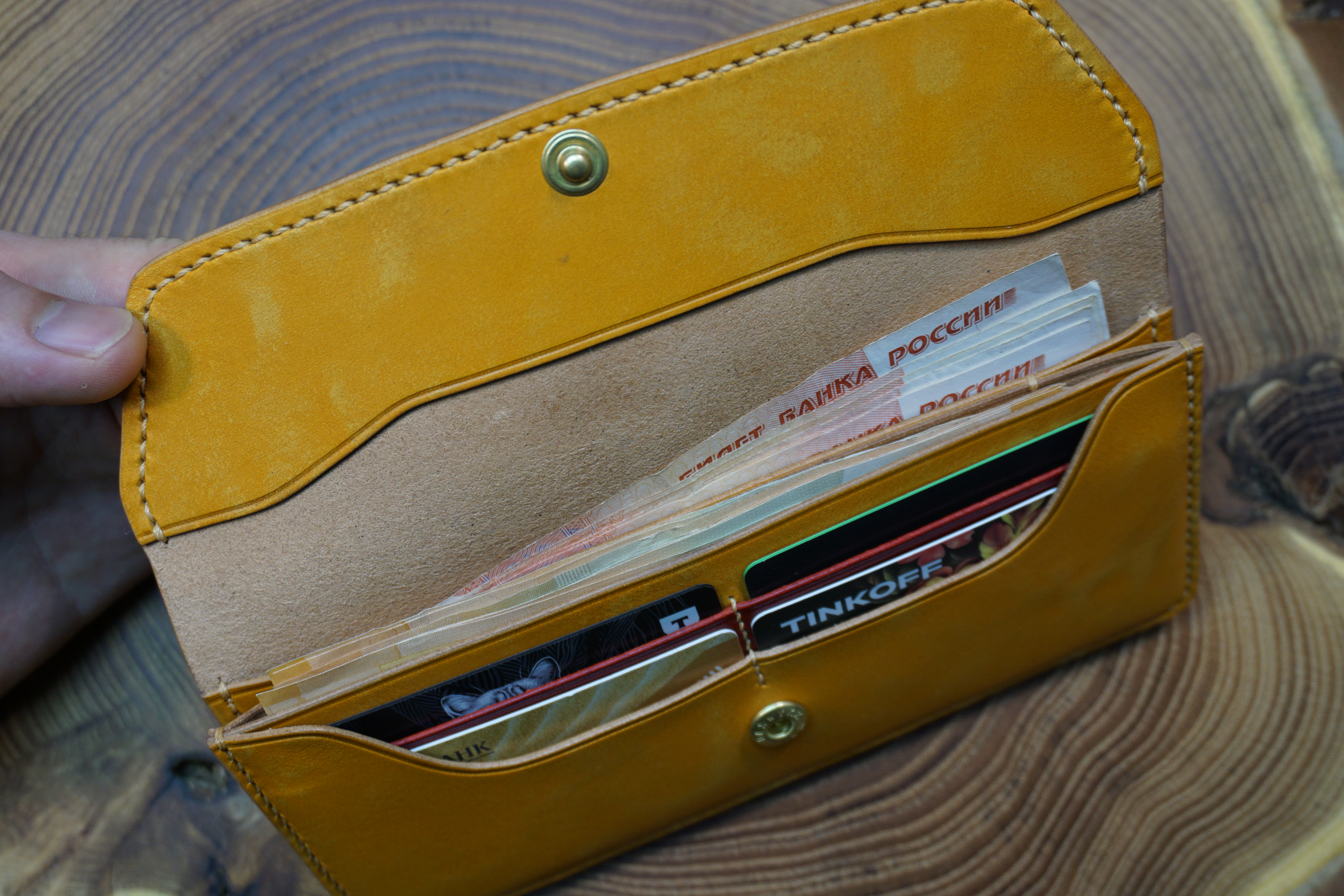 - Практичность: продуманная внутренняя организация позволяет держать всё необходимое под рукой. Два отделения для купюр помогают сортировать наличные по номиналу или назначению, а отдельный слот для мелочёвки избавляет от необходимости носить дополнительную монетницу.