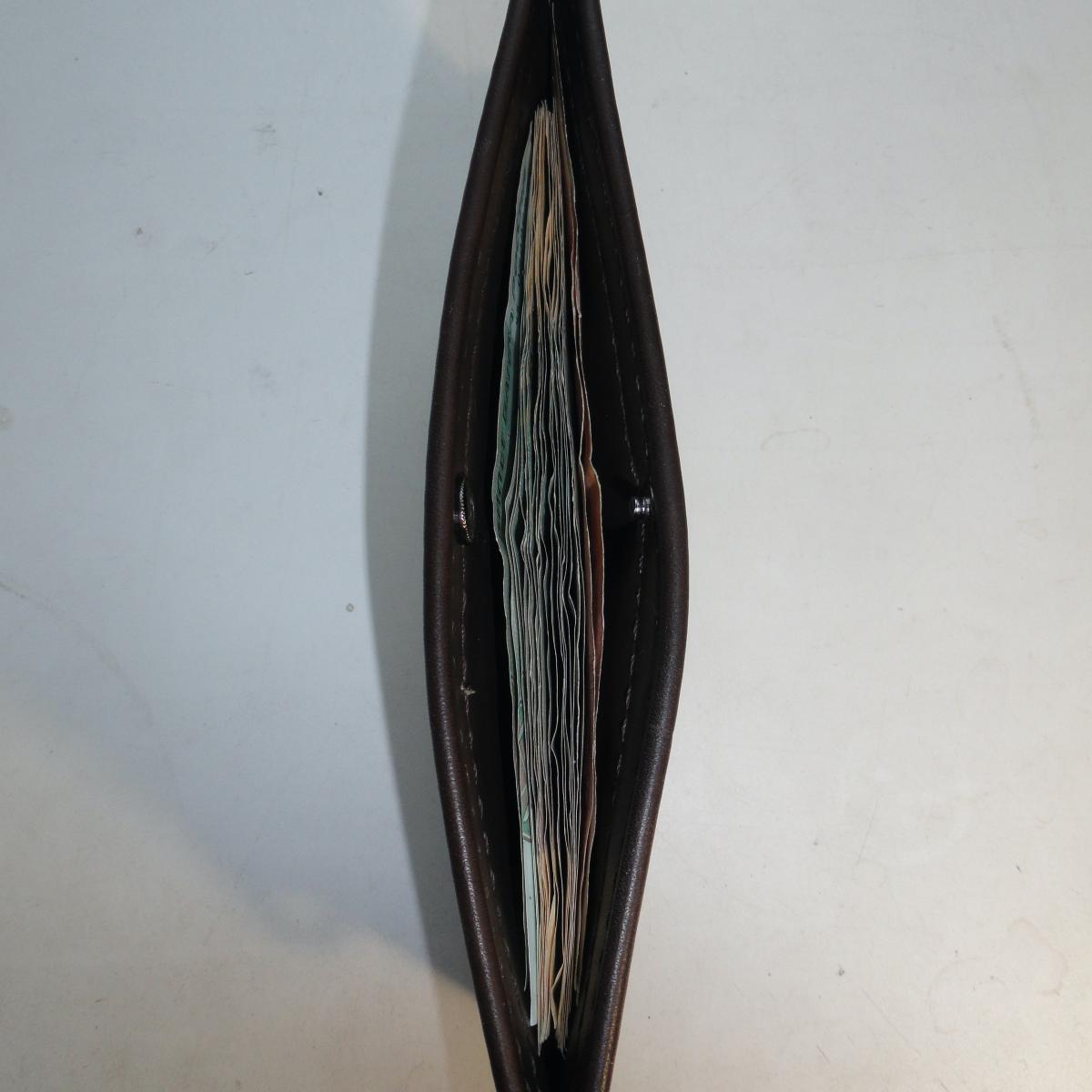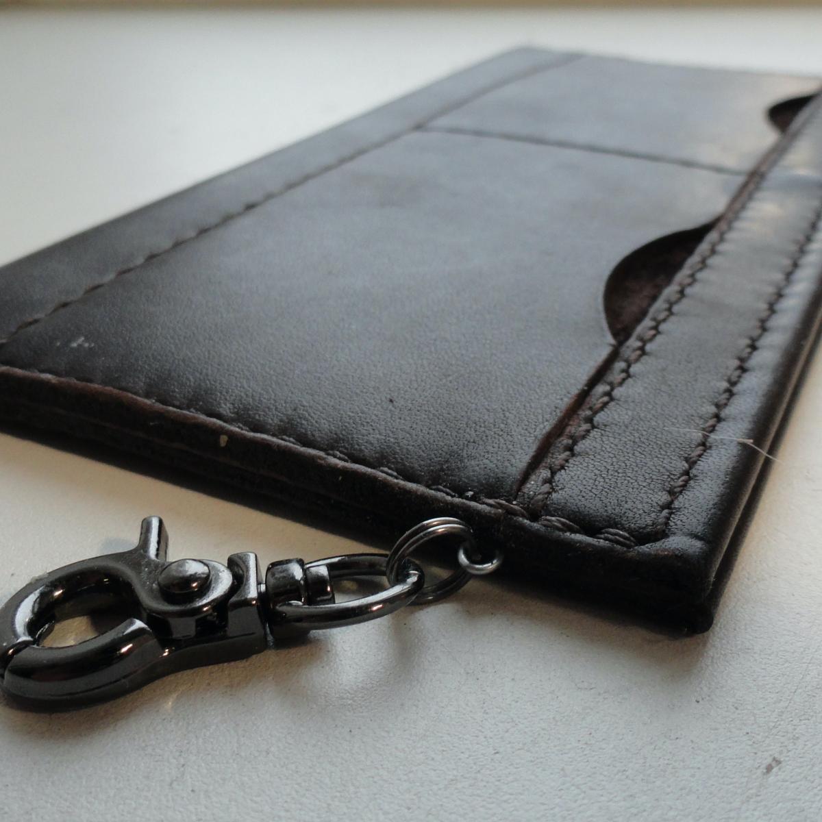 Кошелек для хранения и ношения значительного количества наличных денежных купюр и банковских карт. Одно отделение для купюр, надежно закрывающееся на кнопки, 4 отделения для банковских карт. Для предотвращения потери или кражи предусмотрена возможность пристегивать кошелёк к одежде или сумке. Изготовлен полностью вручную из качественной кожи итальянского производства.