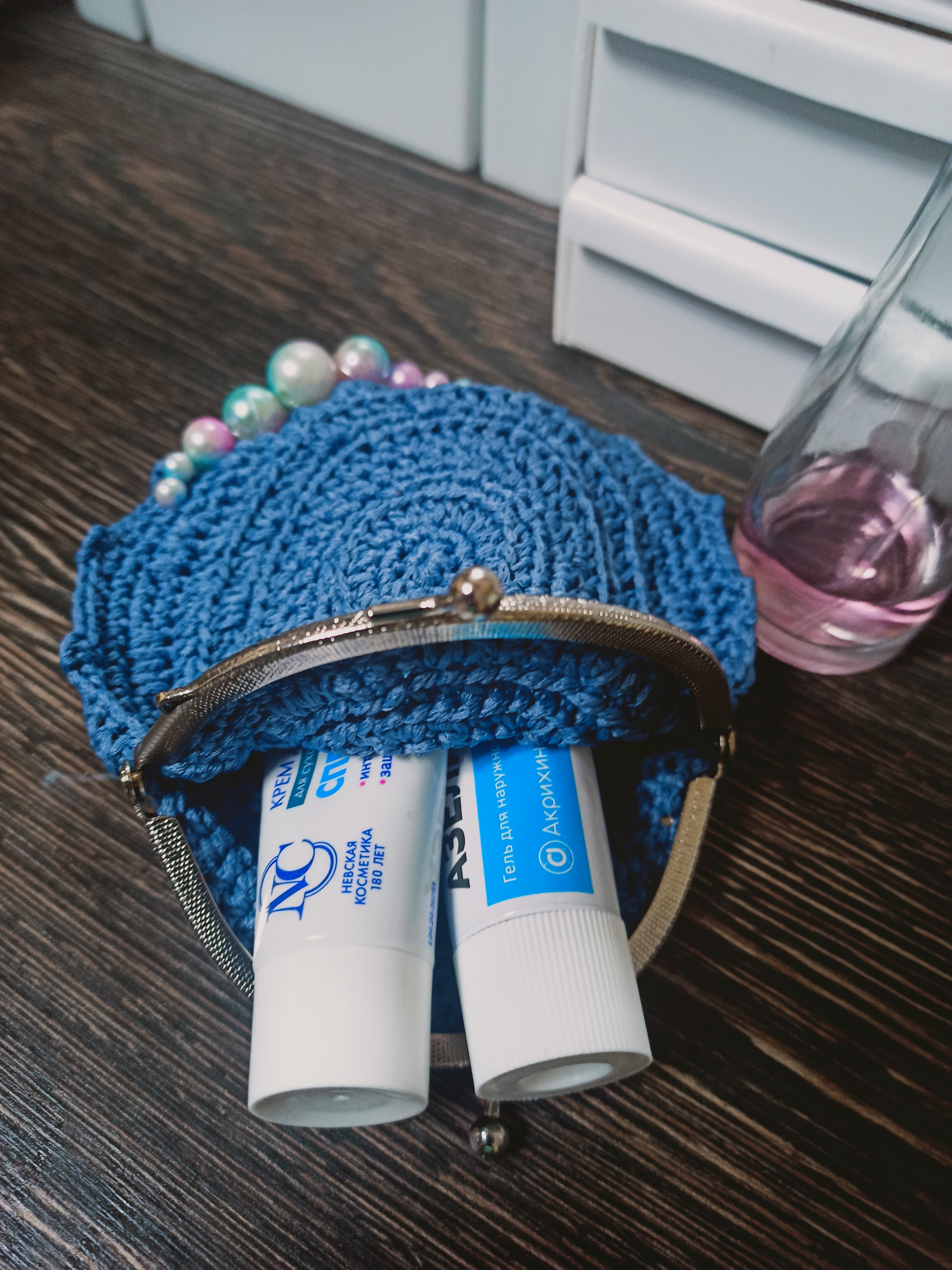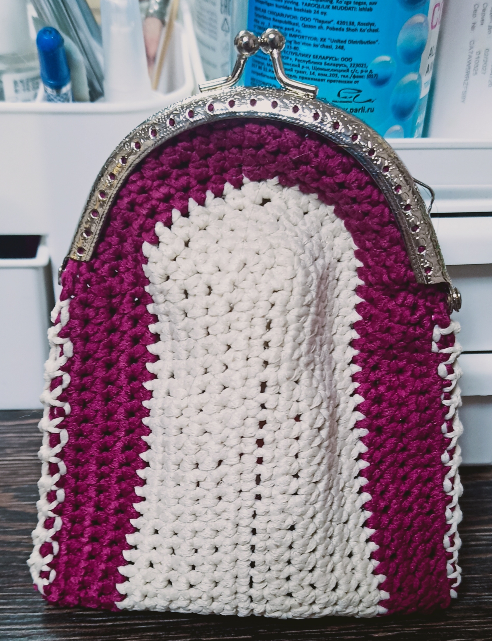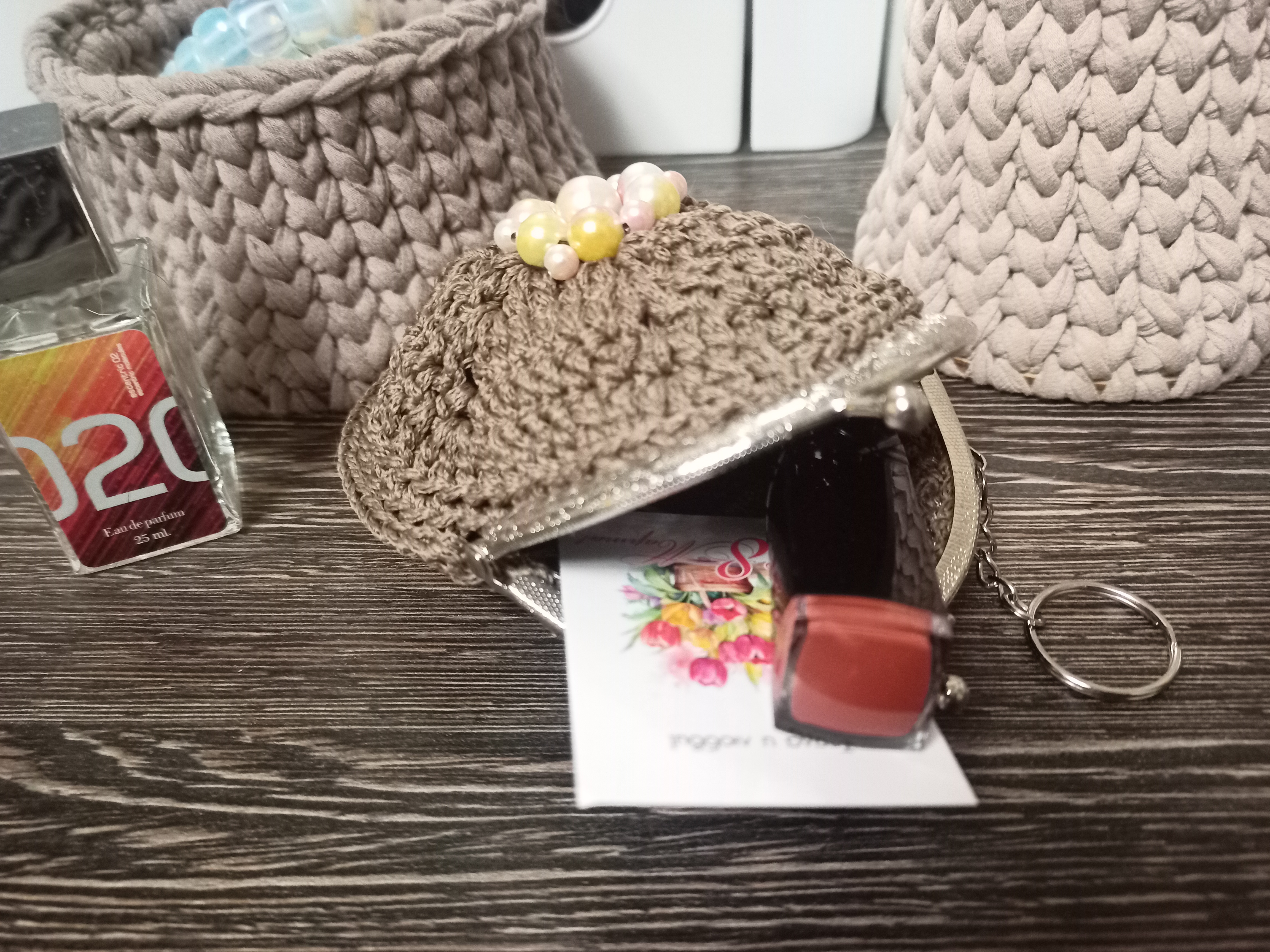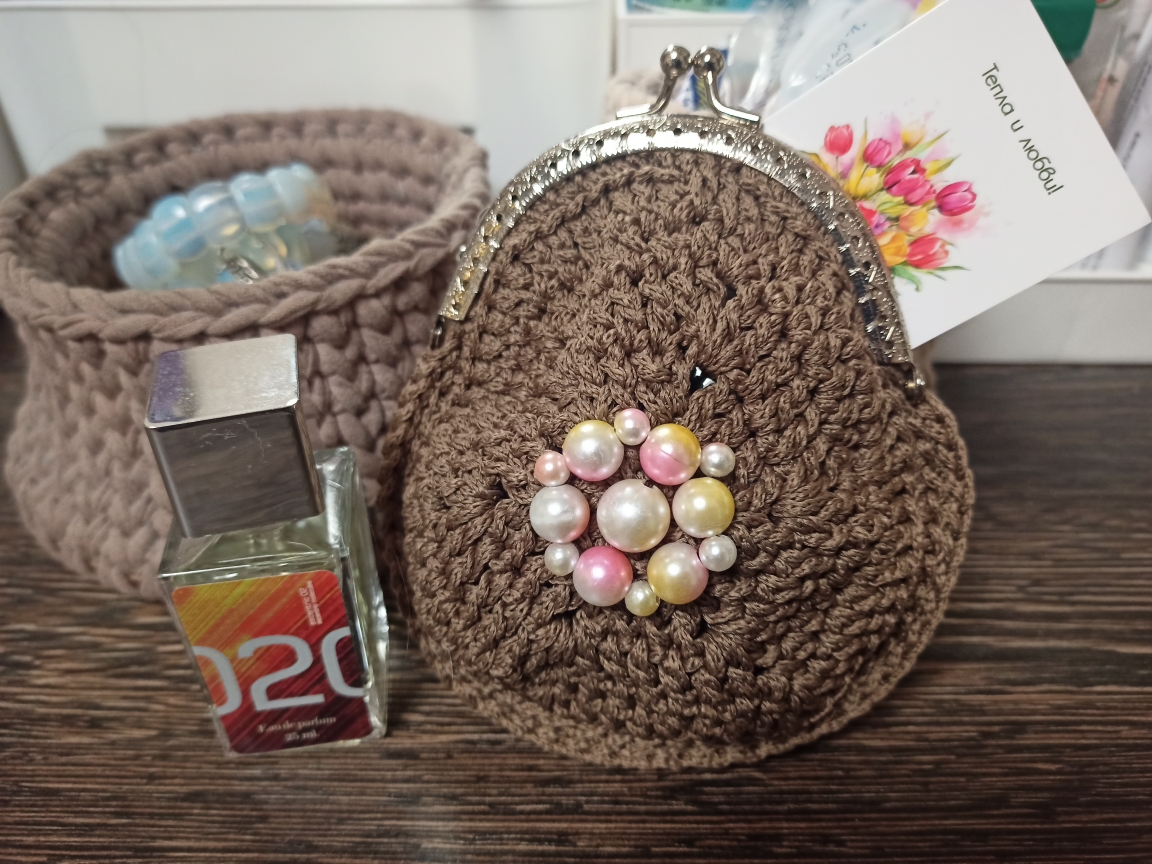 Косметички связаны из полиэфирного шнура, крепление - фермуар овальный. В ассортименте цвет, оформление, форма. Упакованы в прозрачный пакет с открыткой.