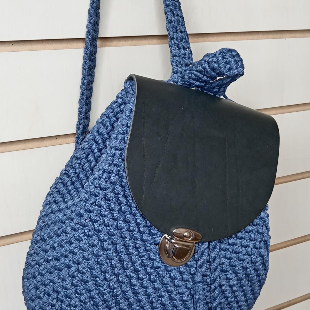 Рюкзак выполнен крючком из полиэфирного шнура 3мм с элементами из натуральной кожи.