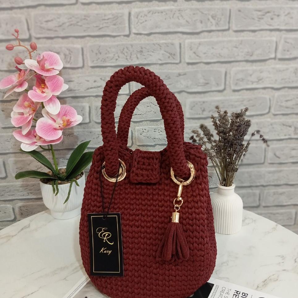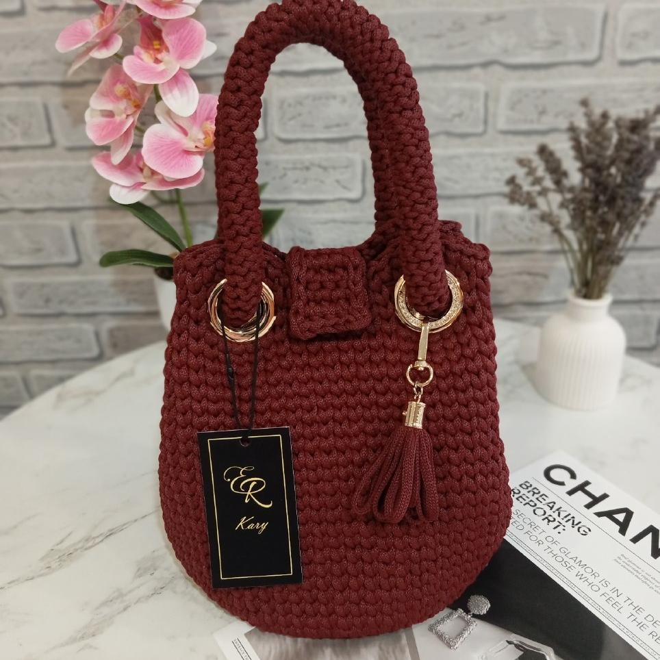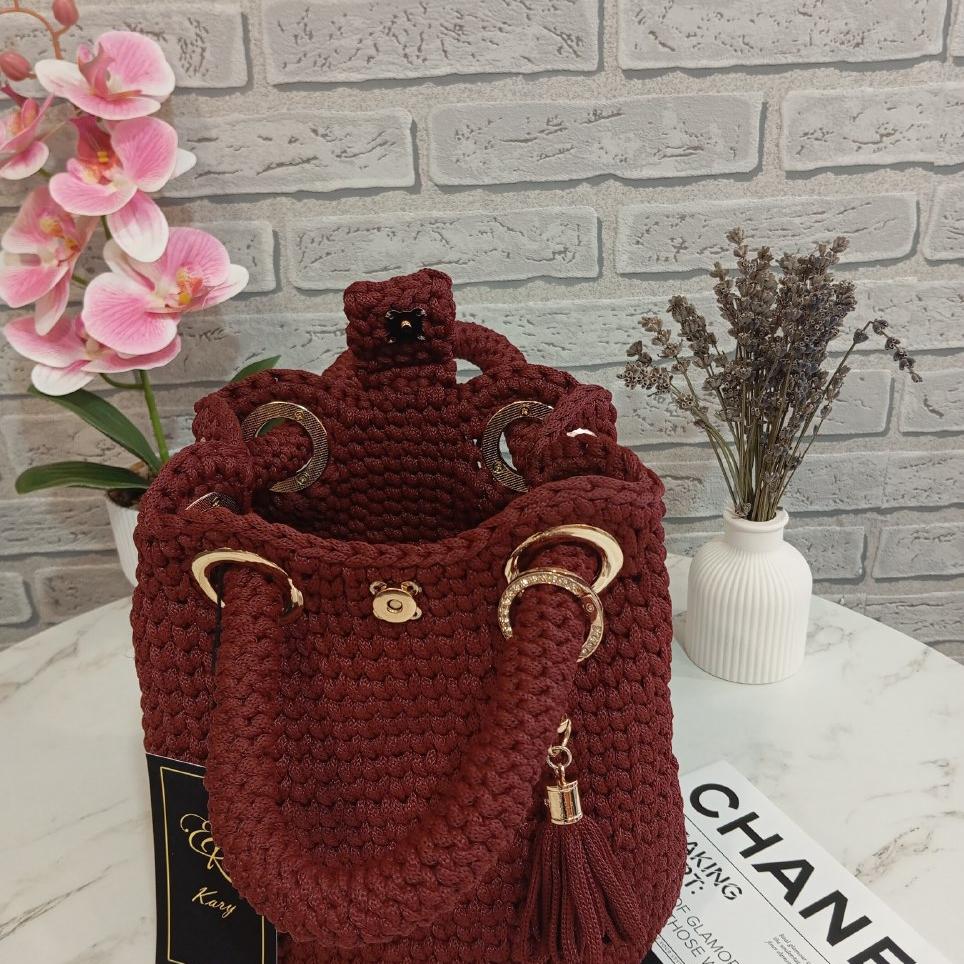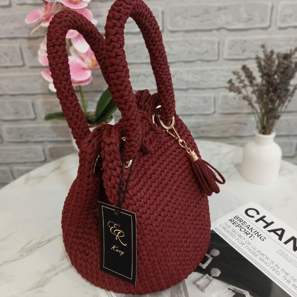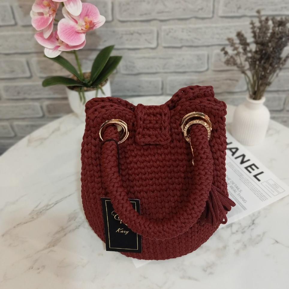 Сумка мешок ручной работы, вязаная. Выполнена из полиэфирного шнура цвета "винный", золотая фурнитура. Размер сумки: ф17см × 21см