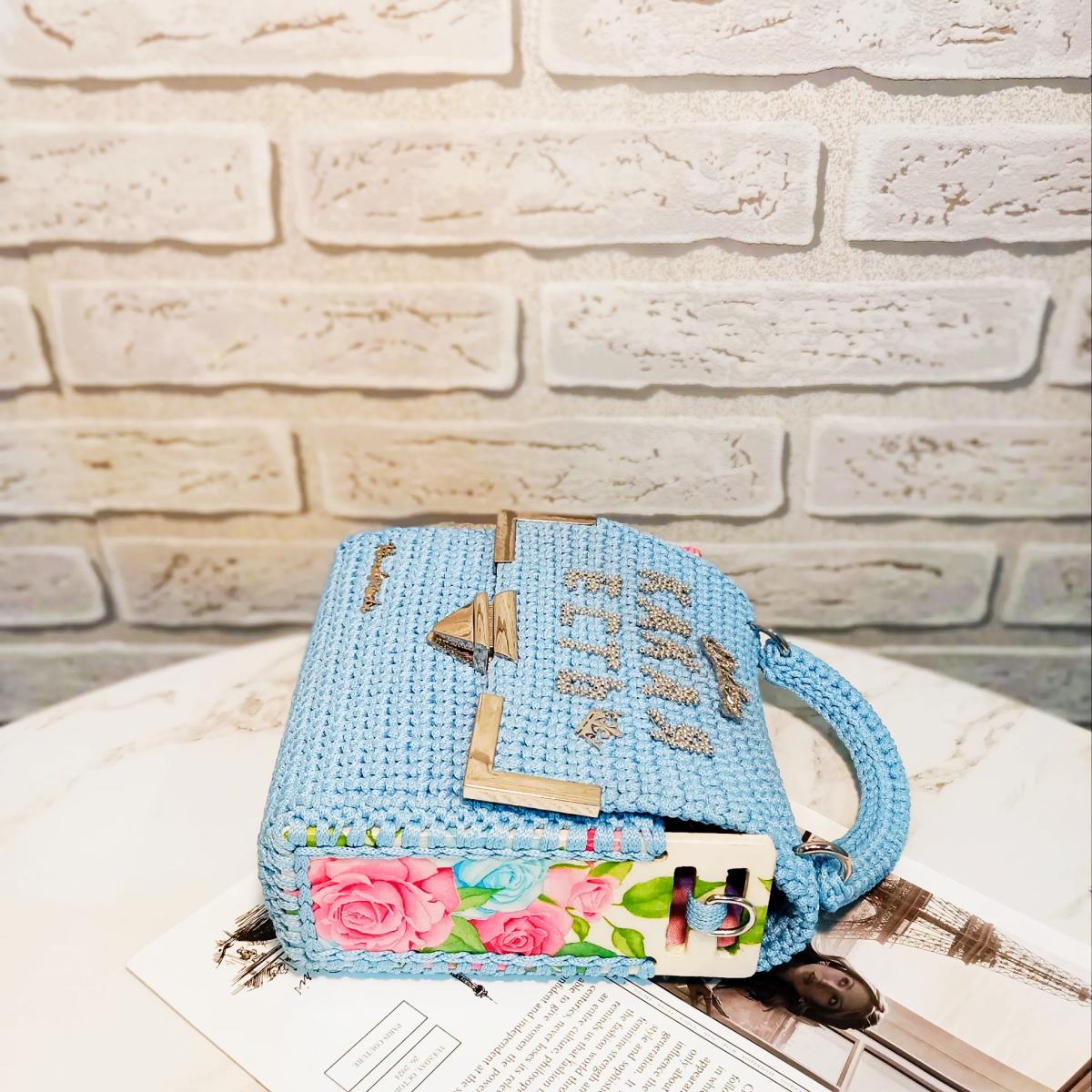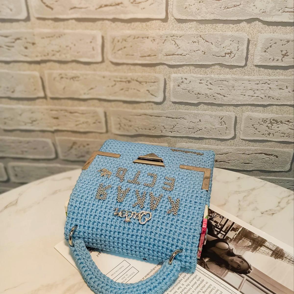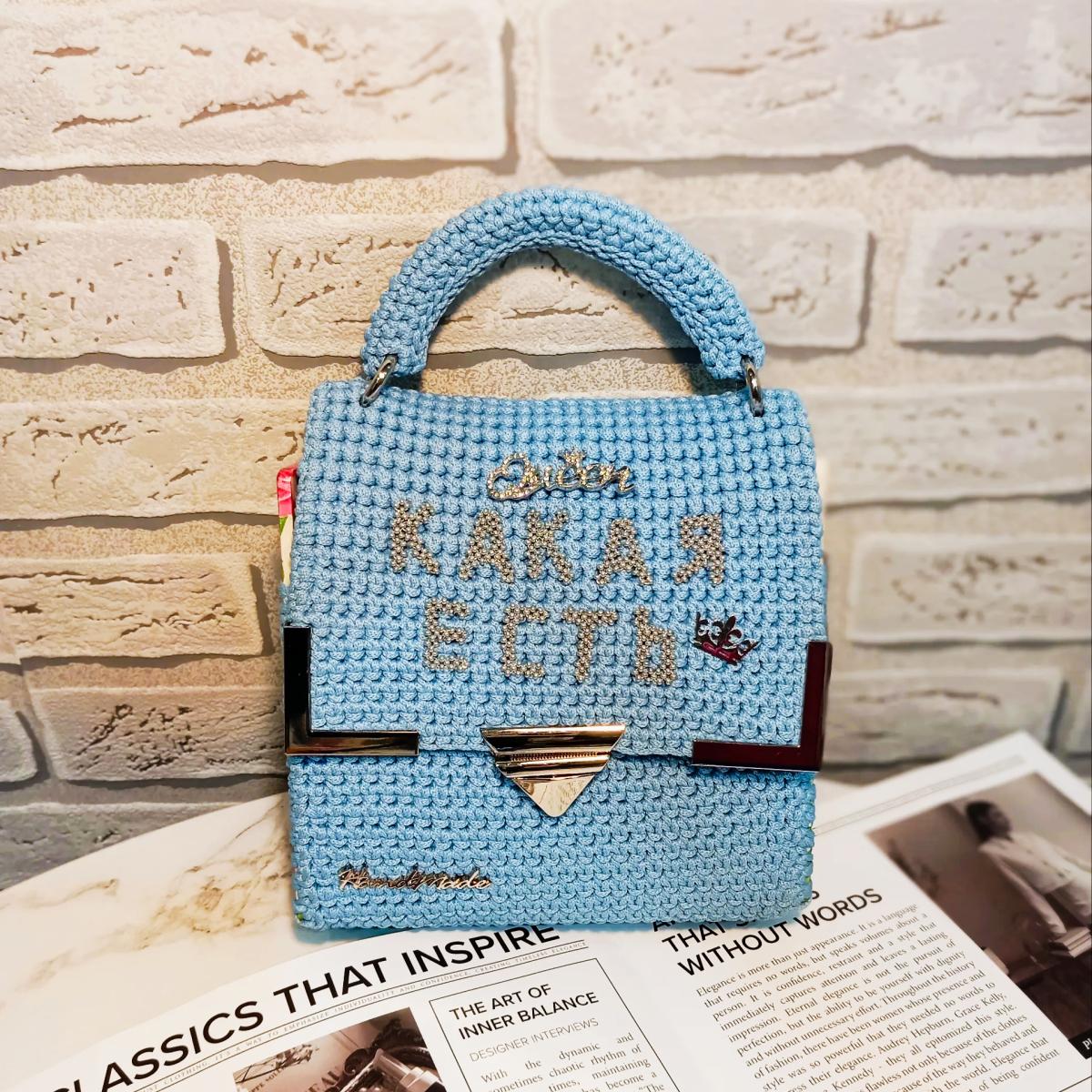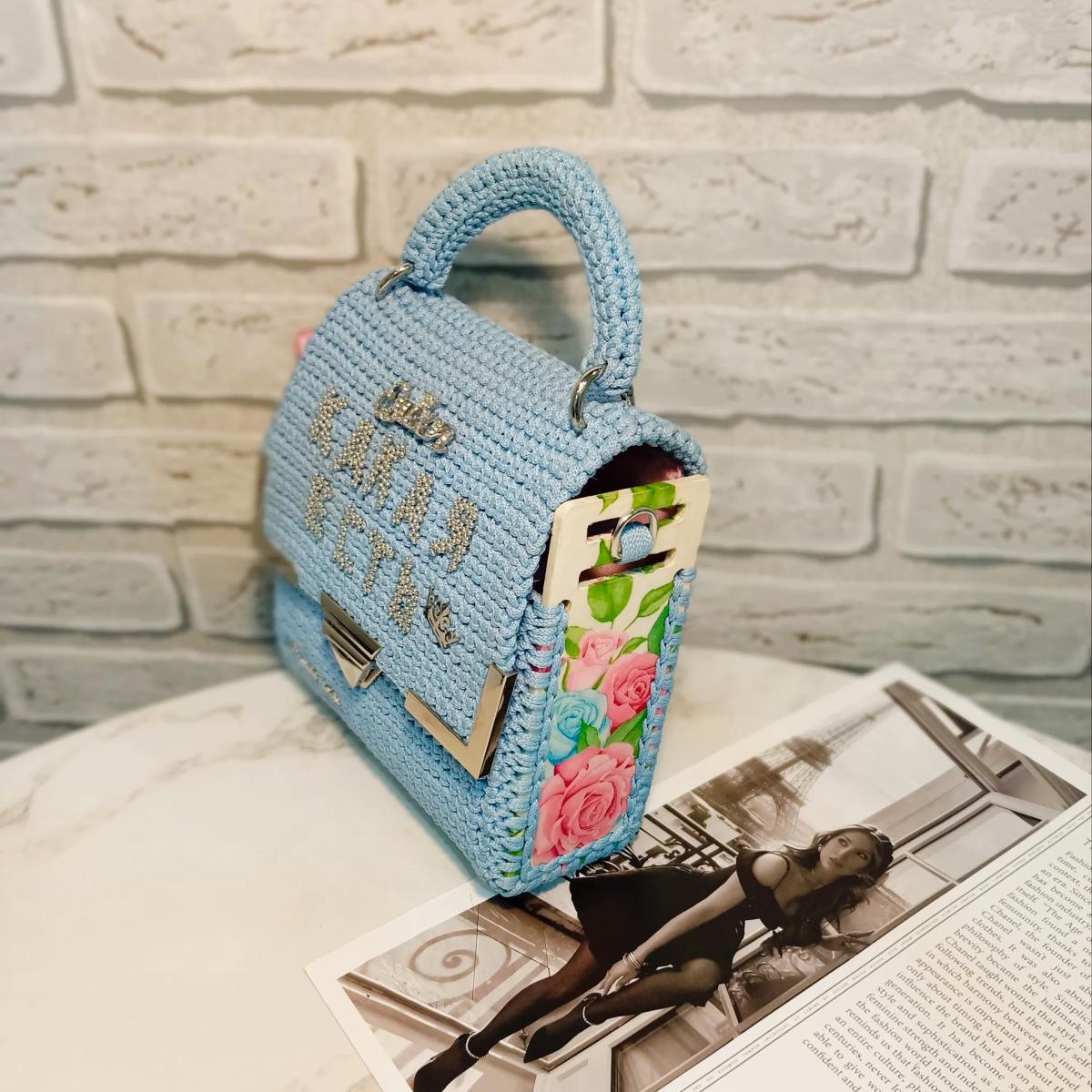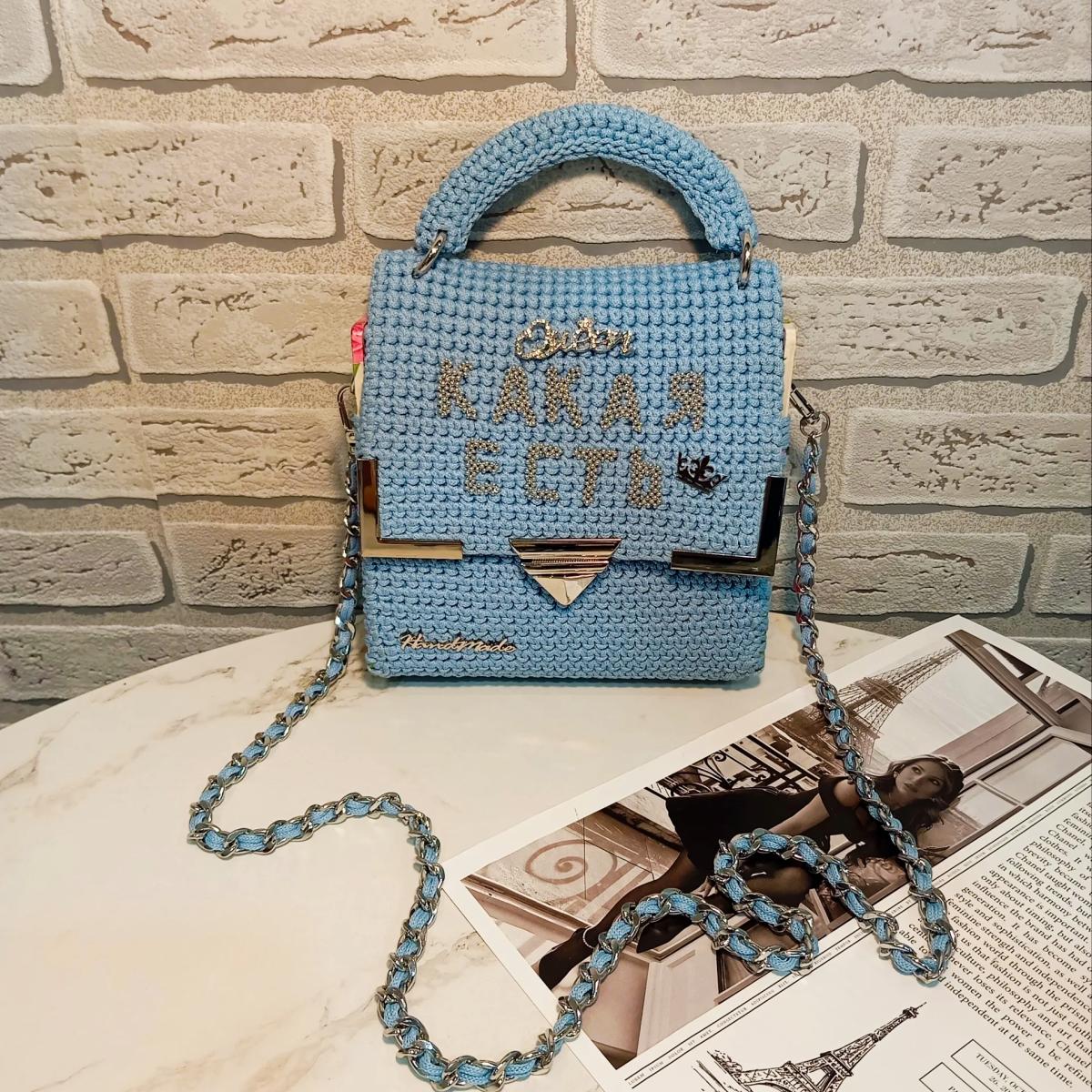 Вязаная сумка ручной работы. Изготовлена из полиэфирного шнура без сердечника цвета "голубой", серебристая фурнитура. Есть вязаные маленькая ручка и  ремешок через плечо. Ремешок через плечо съёмный 120см. Каркас сумки укреплён канвой, боковины деревянные с узором покрытые смолой, есть подкладка. Размер сумки: 17х17х6 см.