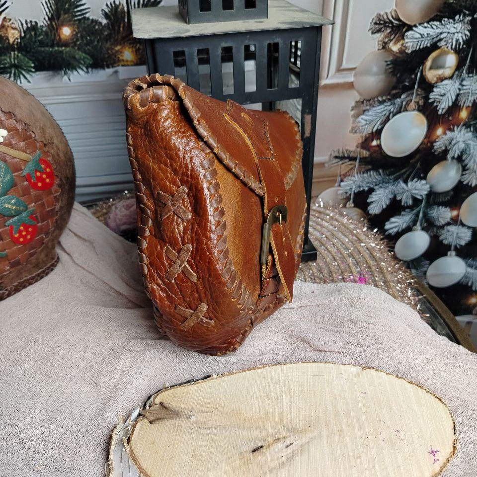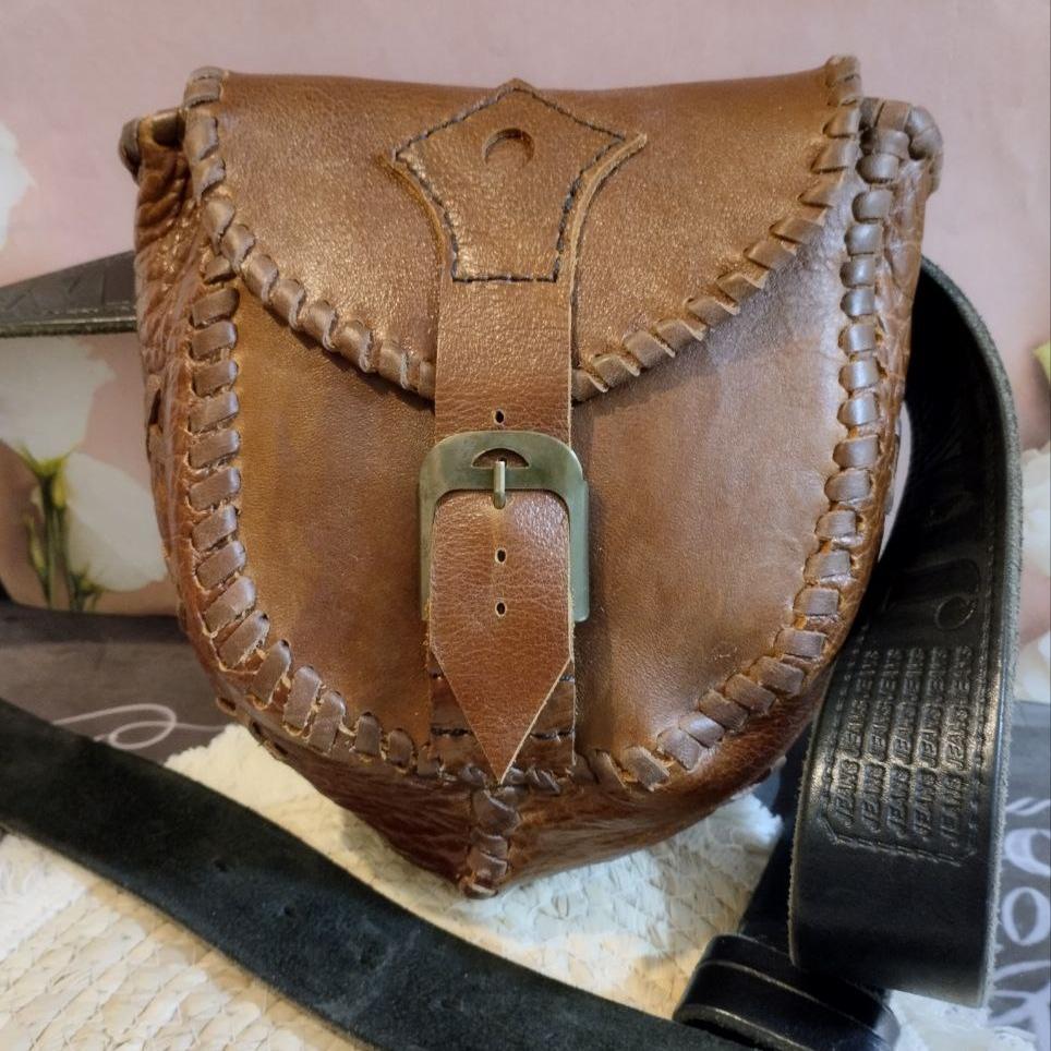 Поясная сумка стилизована под средневековье. Носится на поясе. Максимальная ширина пояса, который пролезет 6см. Пряжка 4см, цвета бронзы, но точный состав метала не известен. Кожа грубой, но современной выделки растительного дубления. Цвет коричневый, можно назвать ореховым. Сама работа выполнена 100% в ручную без использования швейной машинки. Украшена плетением кожаным шнуром.