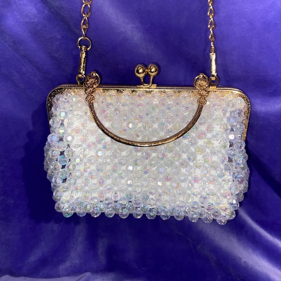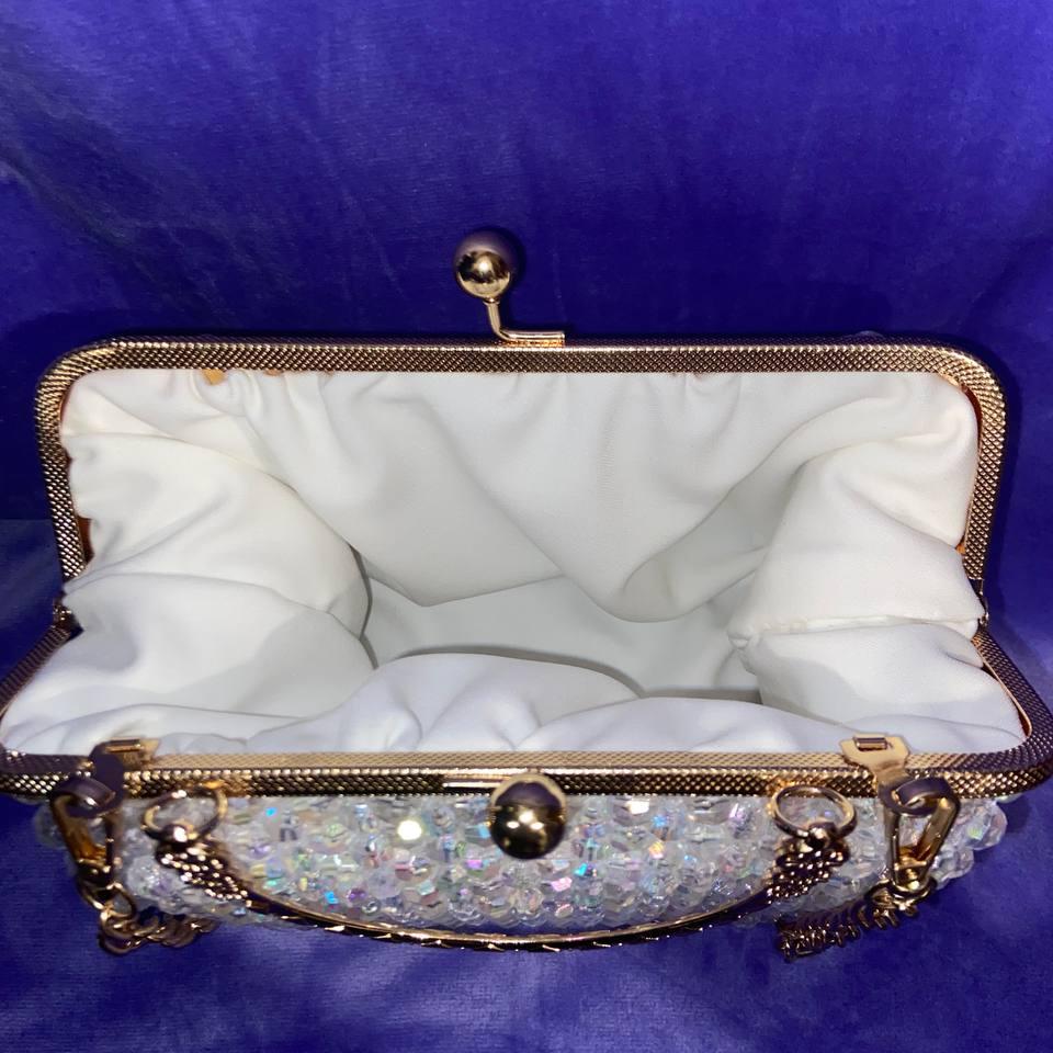 Это вечерняя сумочка-клатч ручной работы с кристальными бусинами и металлической рамкой, рассчитанная на торжественные выходы и аккуратное повседневное использование.