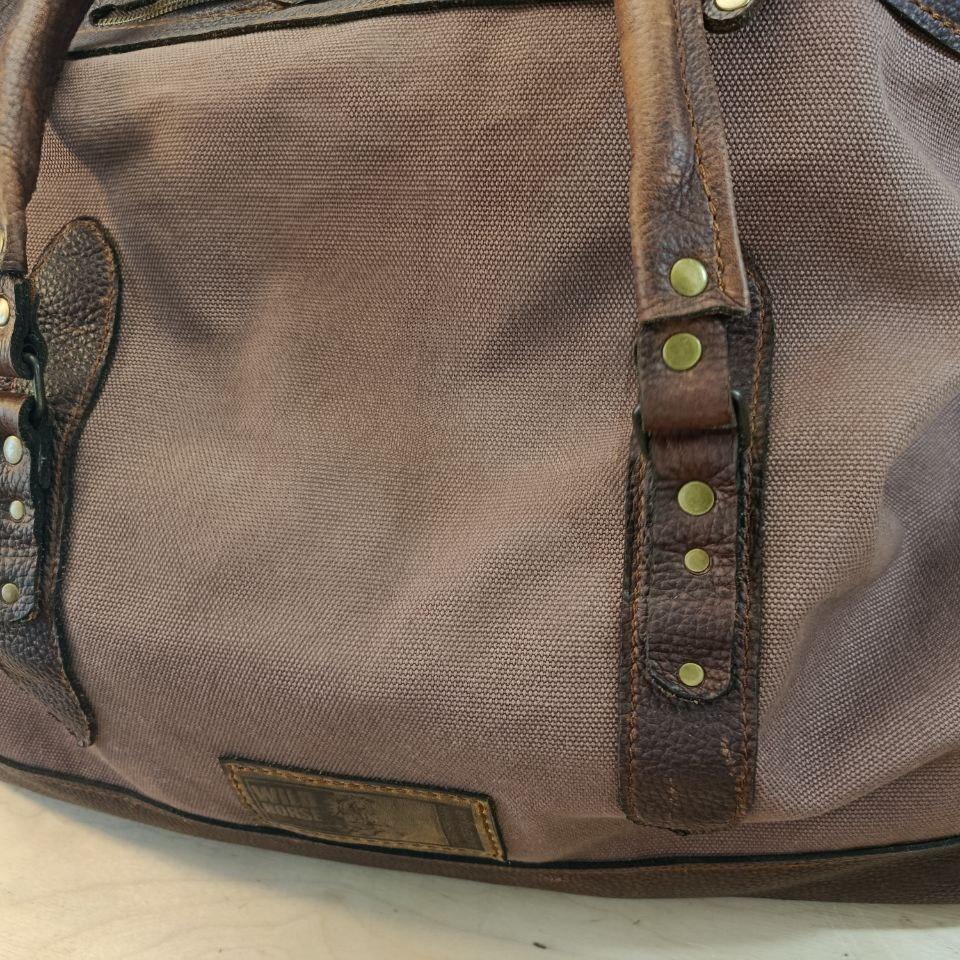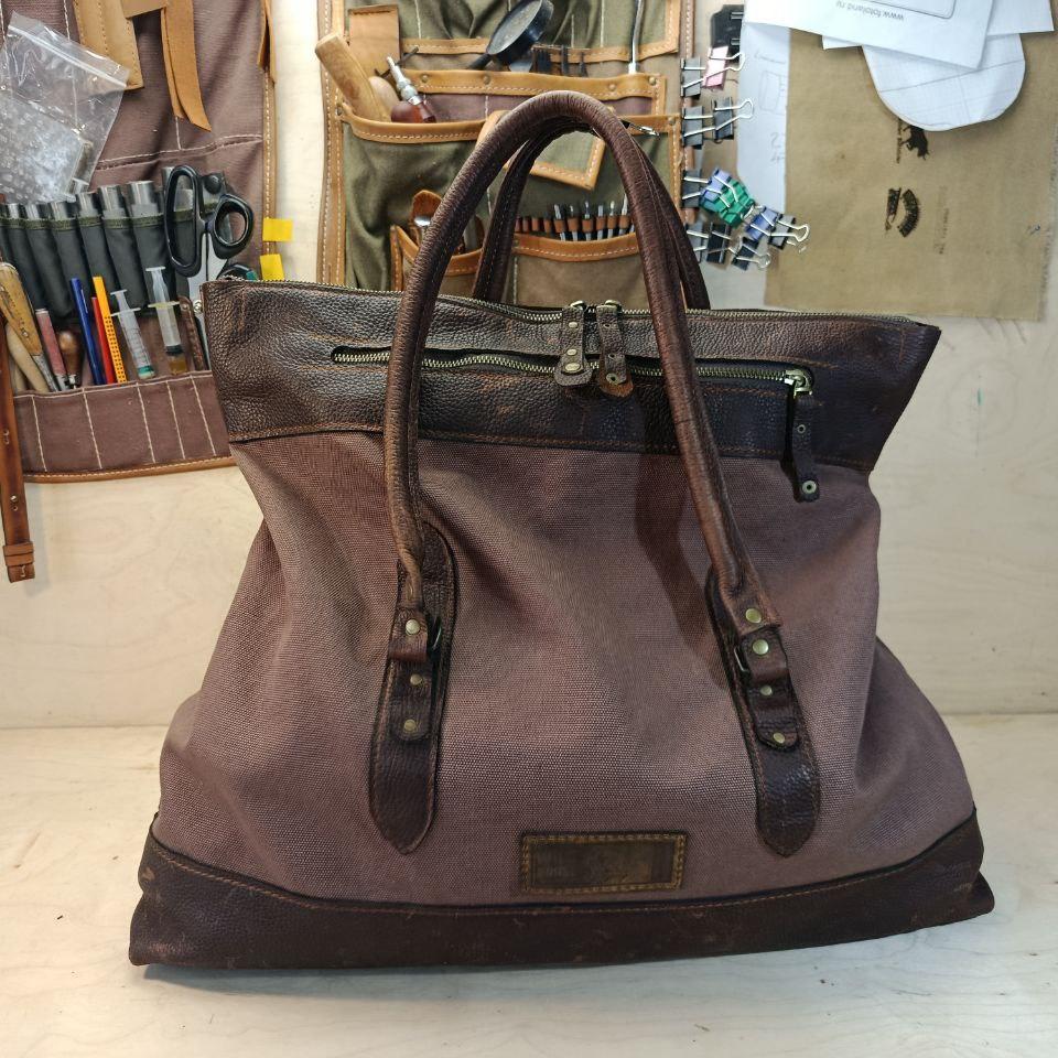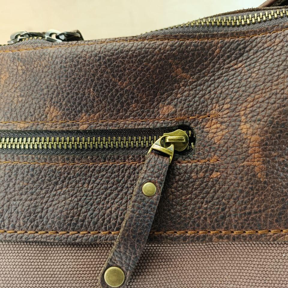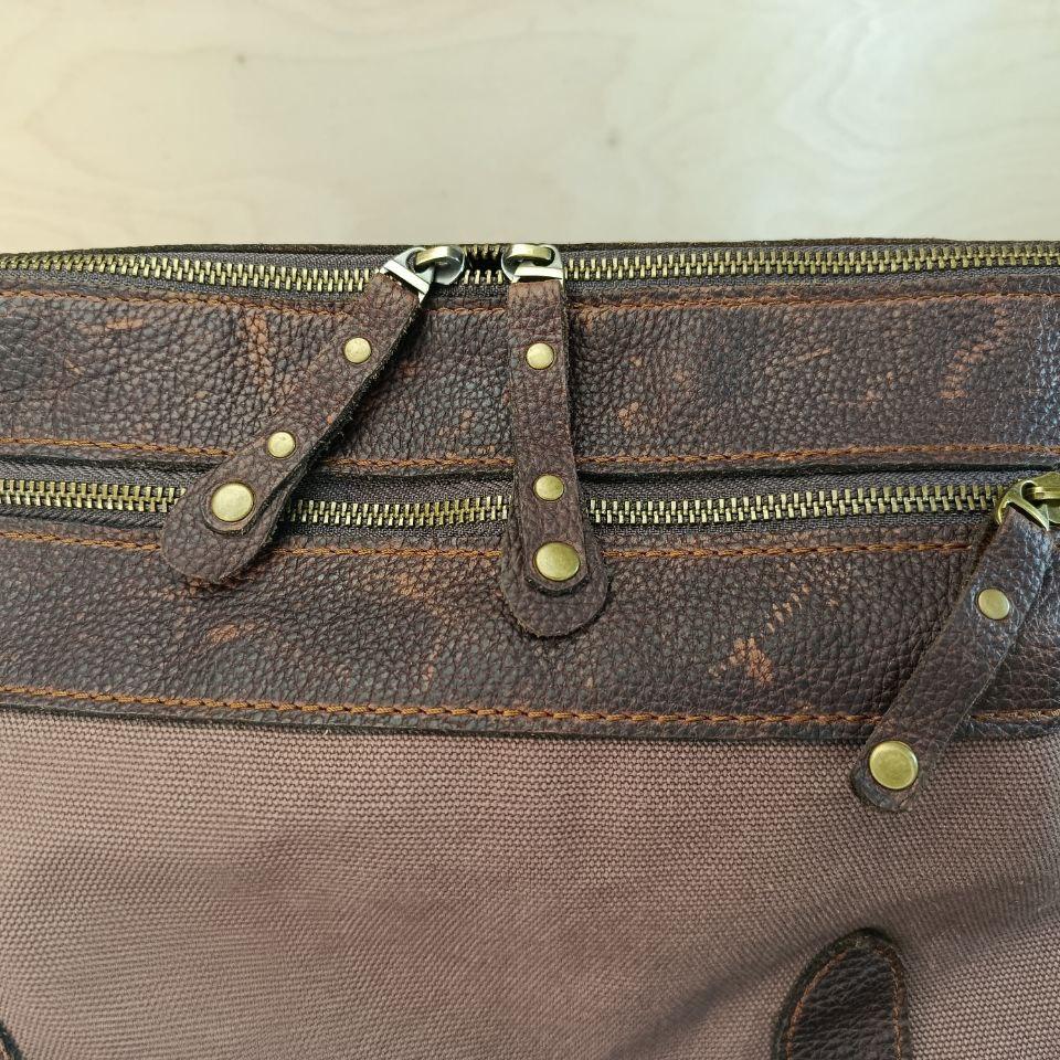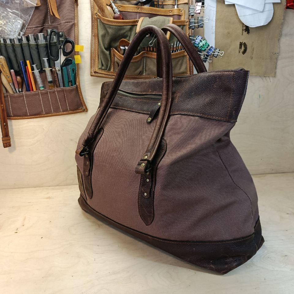 Натуральная кожа Brava Buff с эффектом Pull Up (Португалия) и полотно Canvas, цвет Cacao-Milk. Два внешних кармана на молнии. Длина ручек рассчитана на ношение "на плечо". Размер 500х160х250(350) мм.