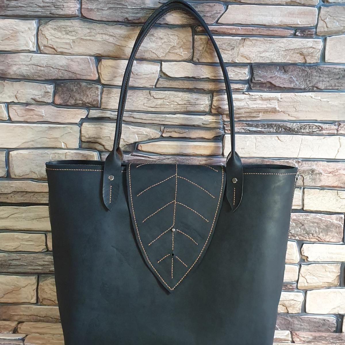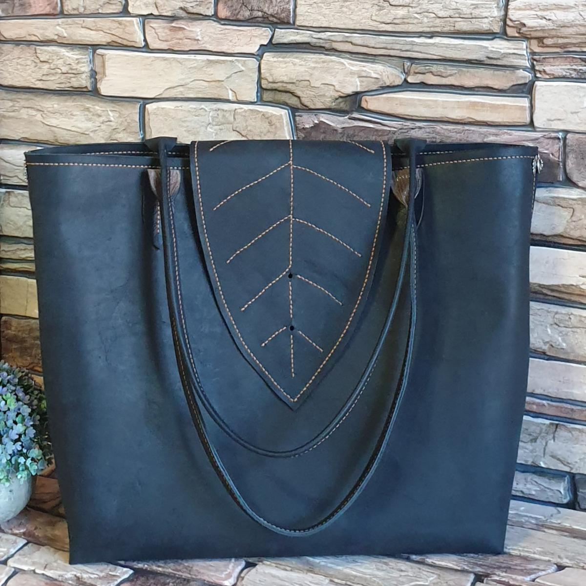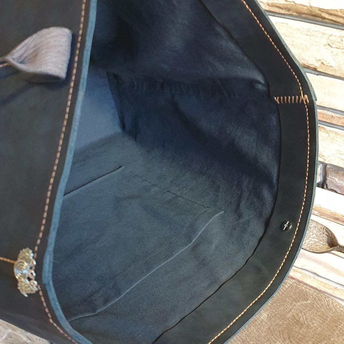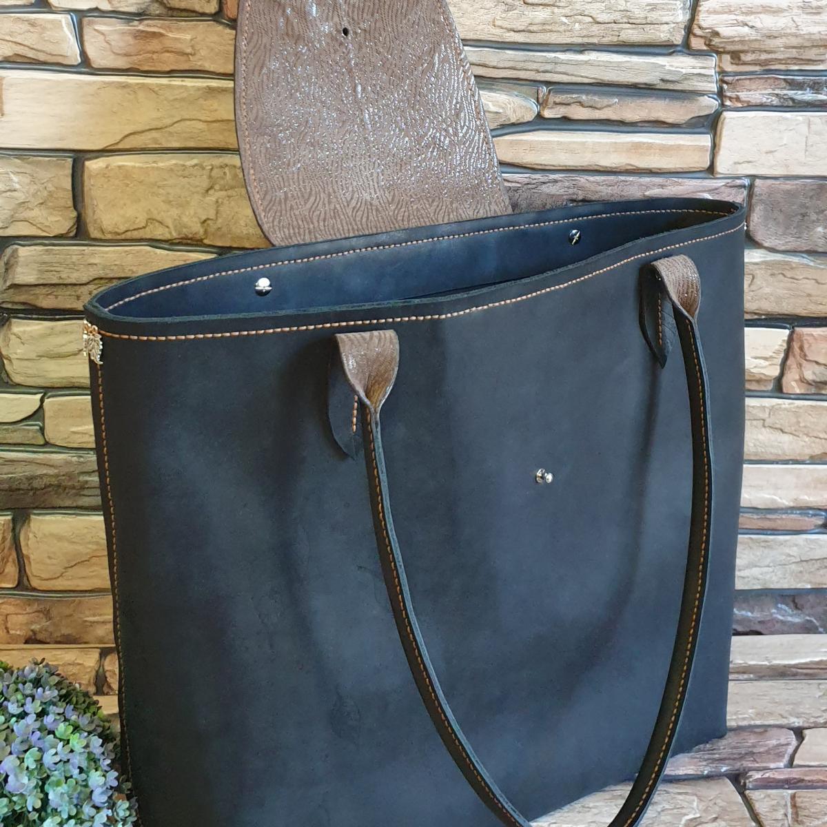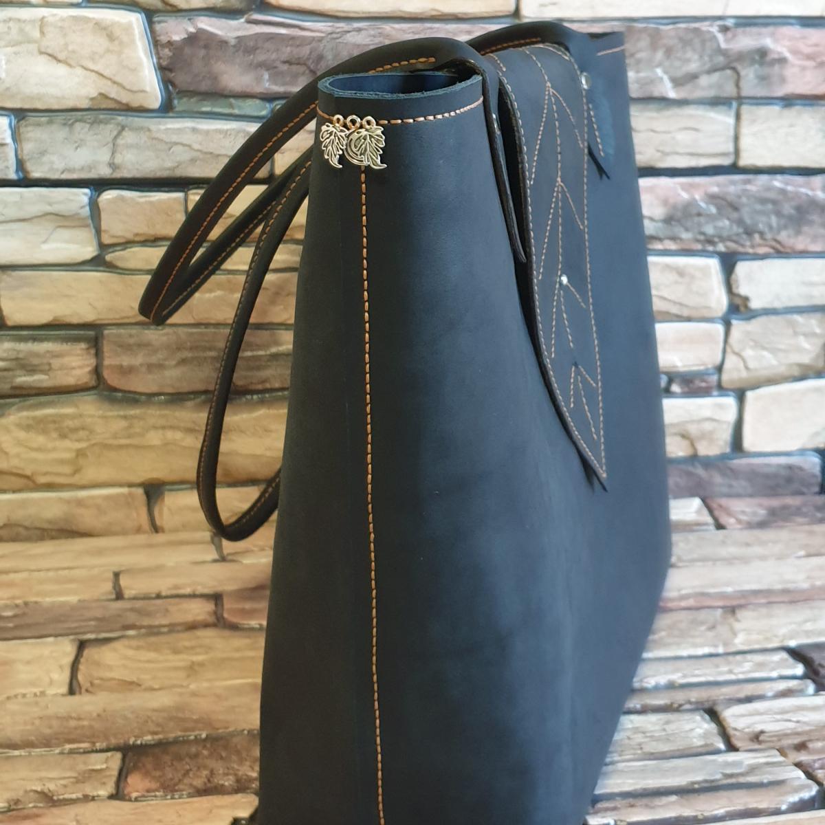 Все швы выполнены полностью вручную! Застёгивается на кобурной винт, без молнии - это упрощает шоппинг! Лёгкая, весит всего 660гр! Внутри одно отделение и один кармашек для смартфона/мелочей. Подклад - черная х/б ткань. Высота сумки 34 см, ширина в верхней части 46 см, в нижней -36 см, дно 12 см, длина ручек 66 см.