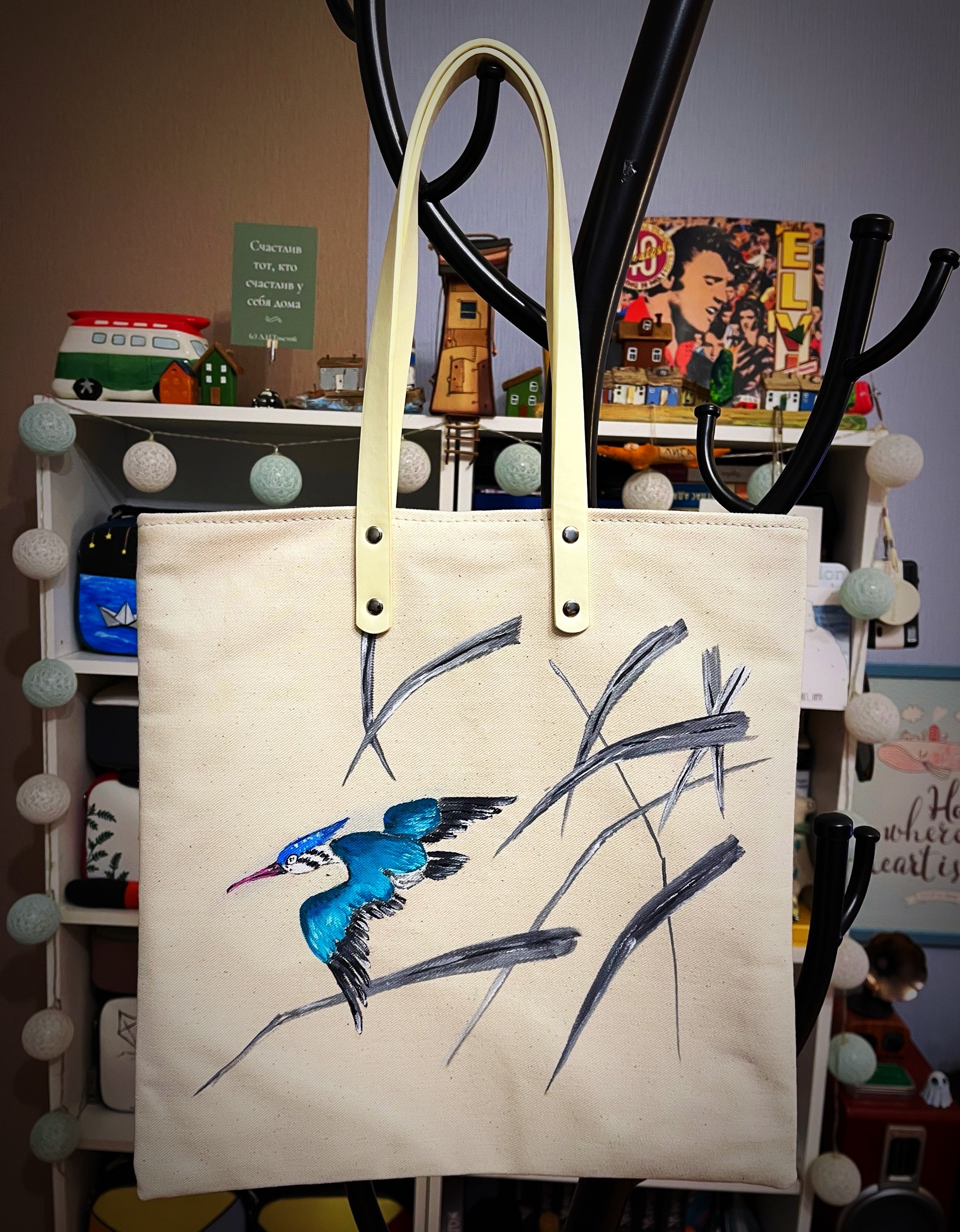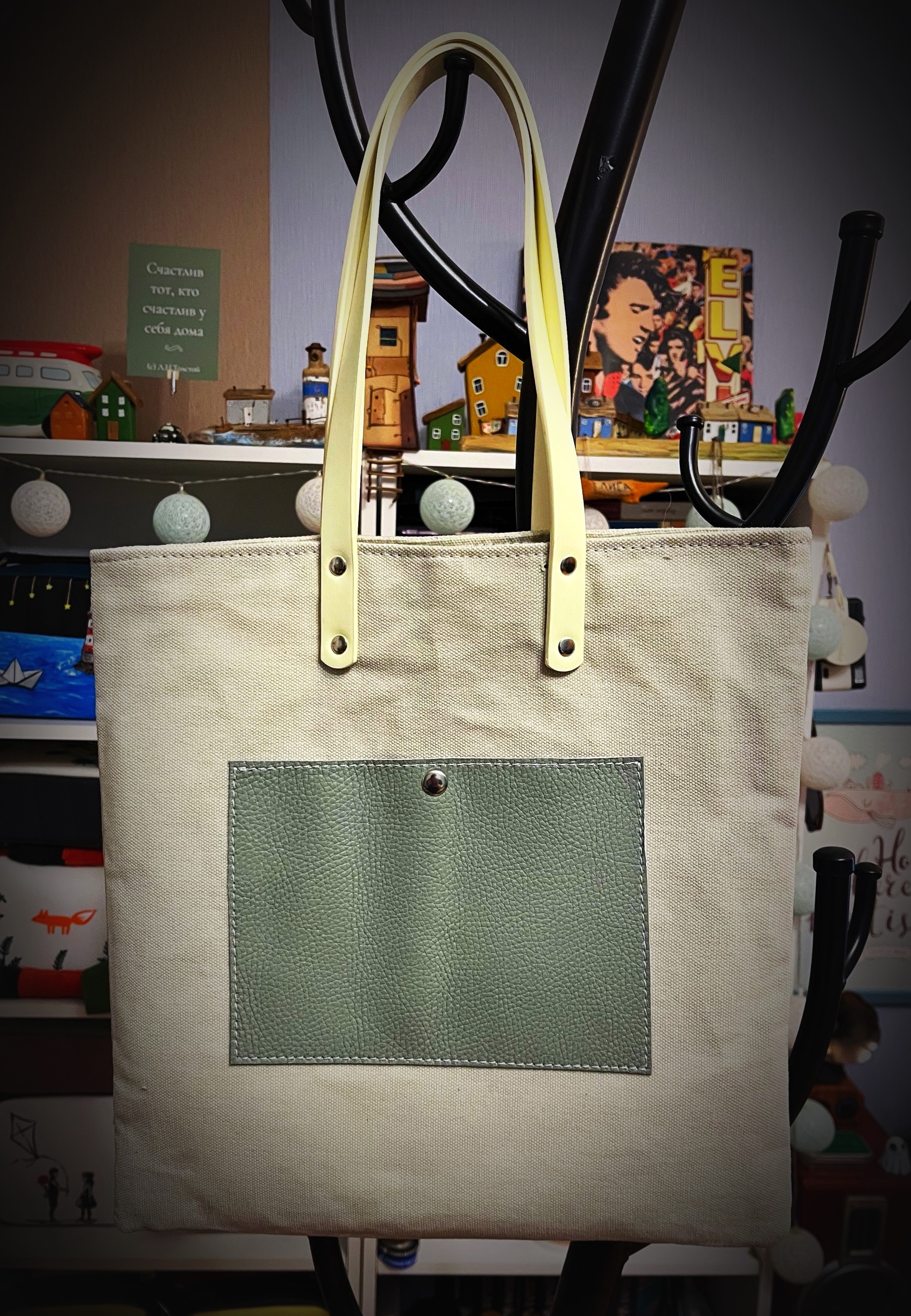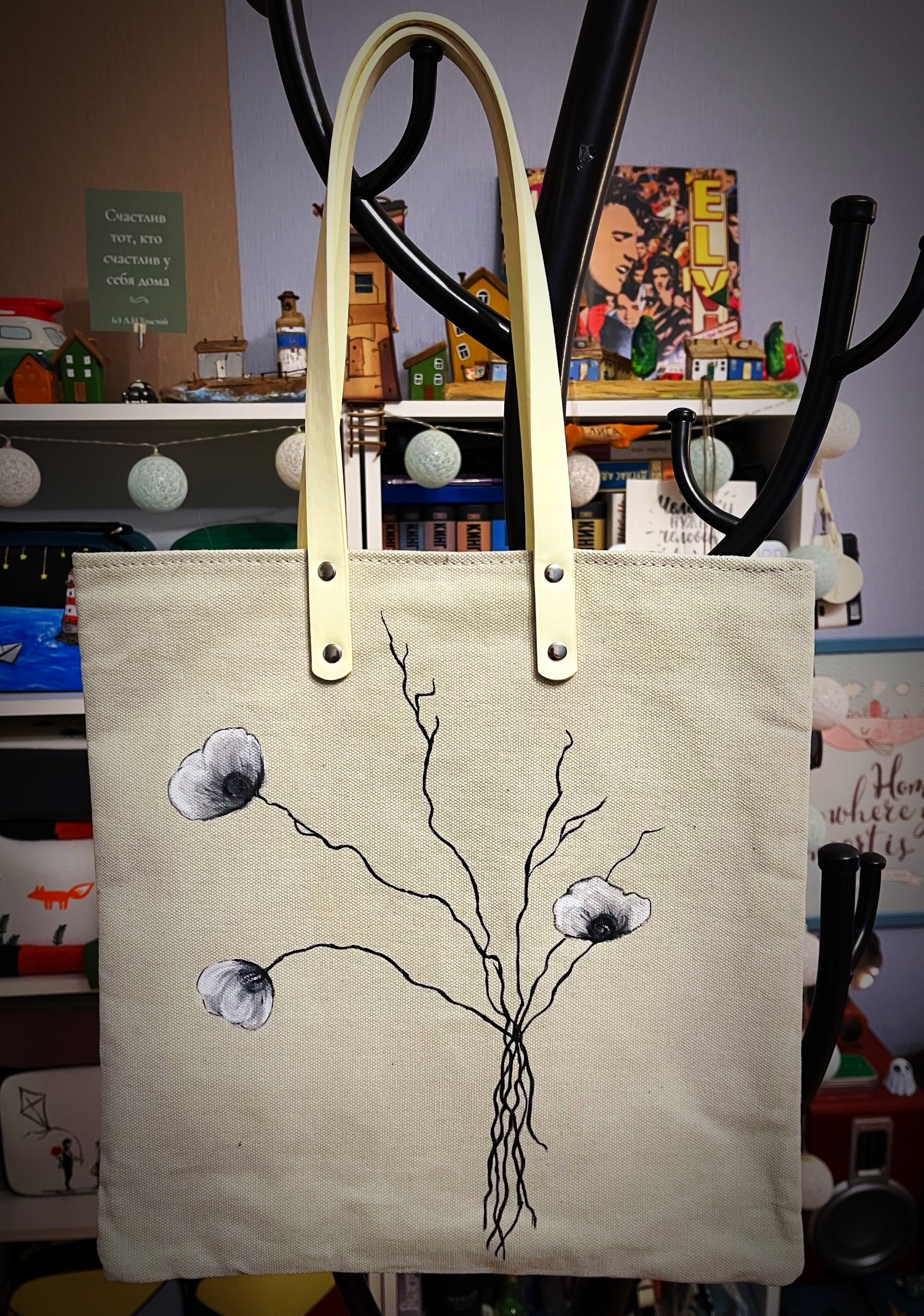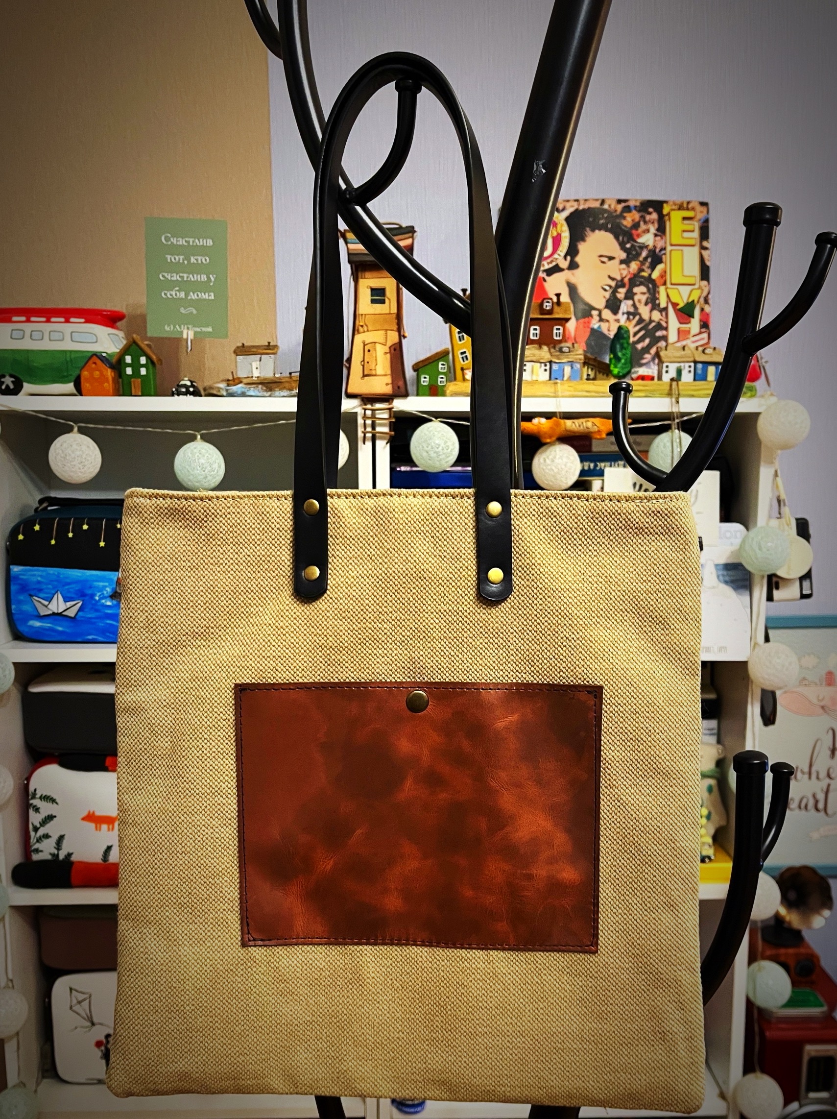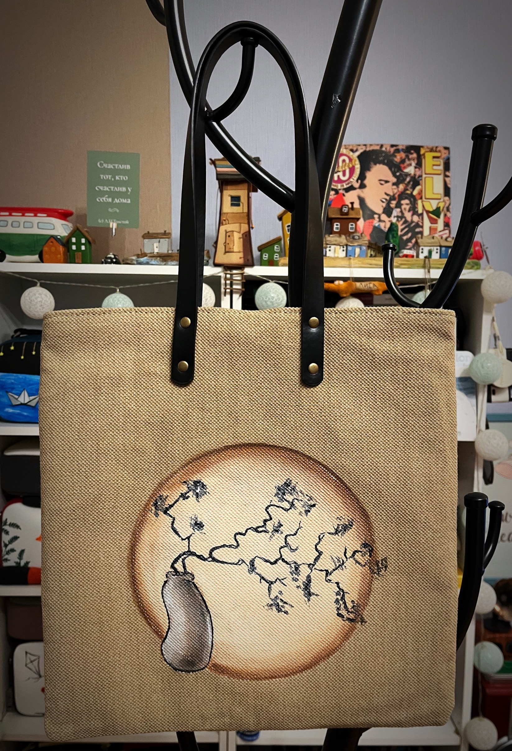 Сумки изготовлены из плотного материала(канвас) рисунок нанесен специальными красками по ткани( не стирается) внутри цветная подкладка , снаружи кожаный карман , закрывается на магнитную кнопку , не промокает так проклеена дублерином и политеном.