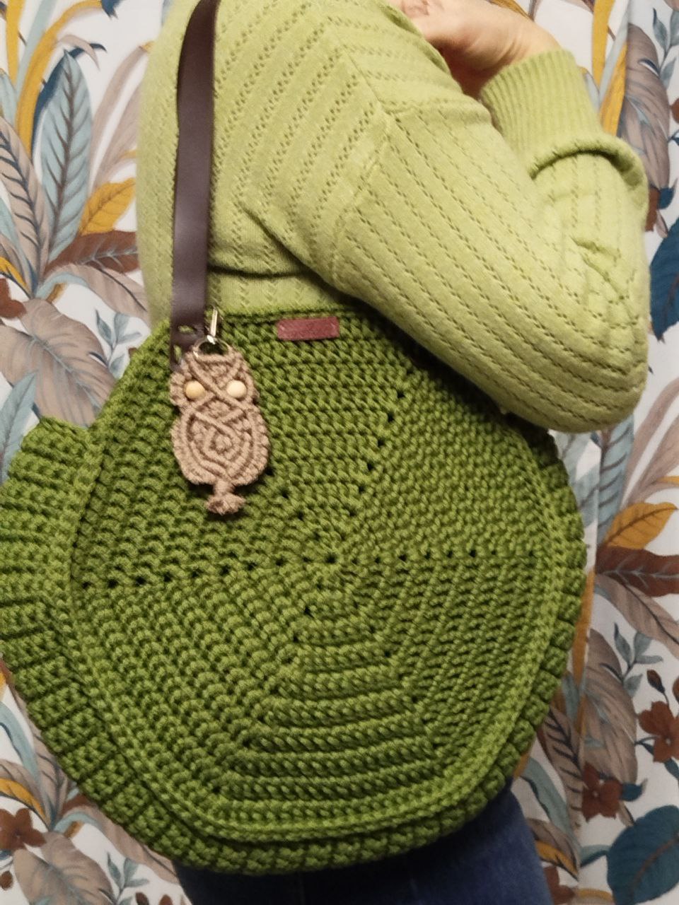 Ремень сумки выполнен из коричневой кожи, что добавляет изделию элегантности и прочности. На ремне висит декоративный элемент в виде плетеного кулона, который служит не только украшением, но и функциональным элементом, позволяющим легко открывать и закрывать сумку.