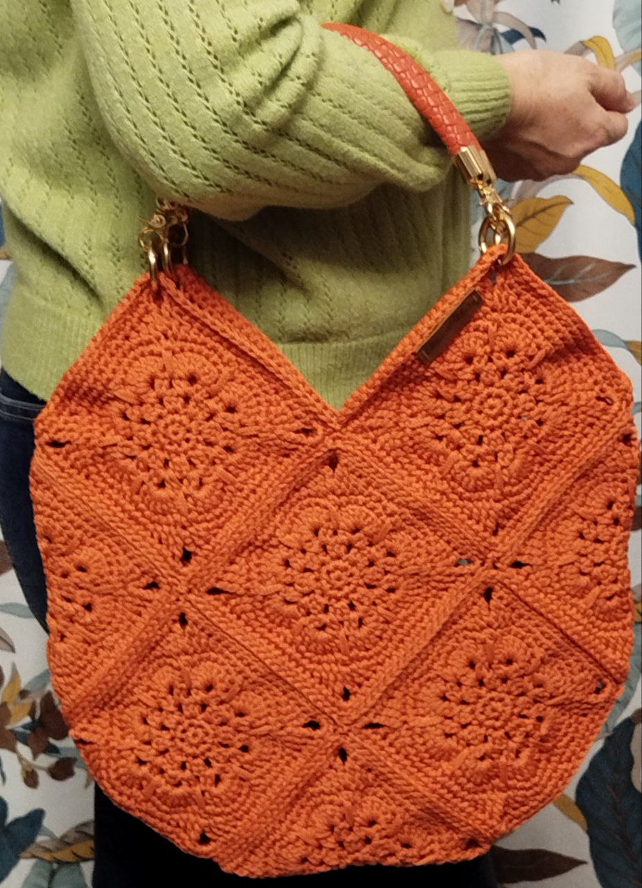 Женская сумка-авоська, выполненная из полиэфирного шнура. Сумка имеет свободный крой и объемную форму, что делает ее удобной для повседневного использования. Цвет сумки - оранжевый, что придает ей свежий и жизнерадостный вид.