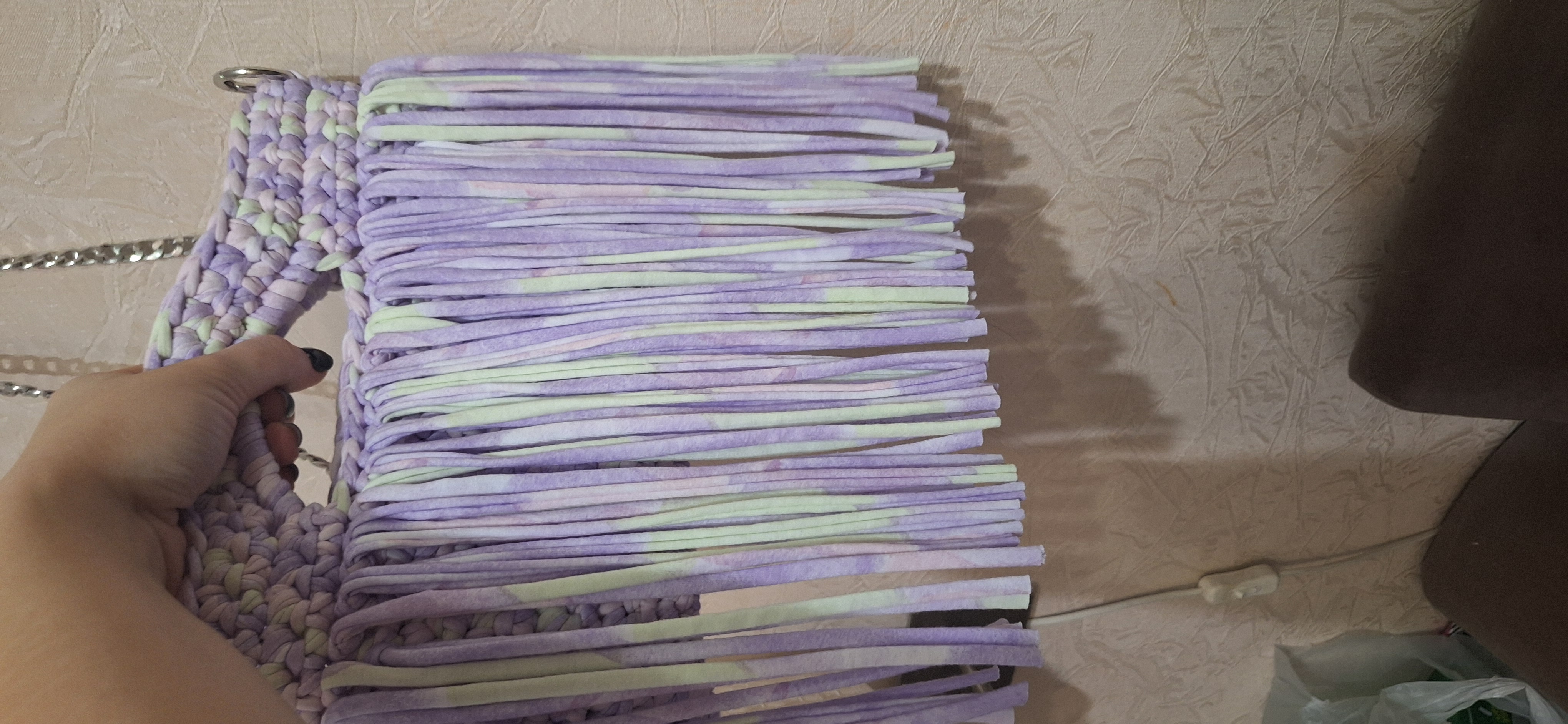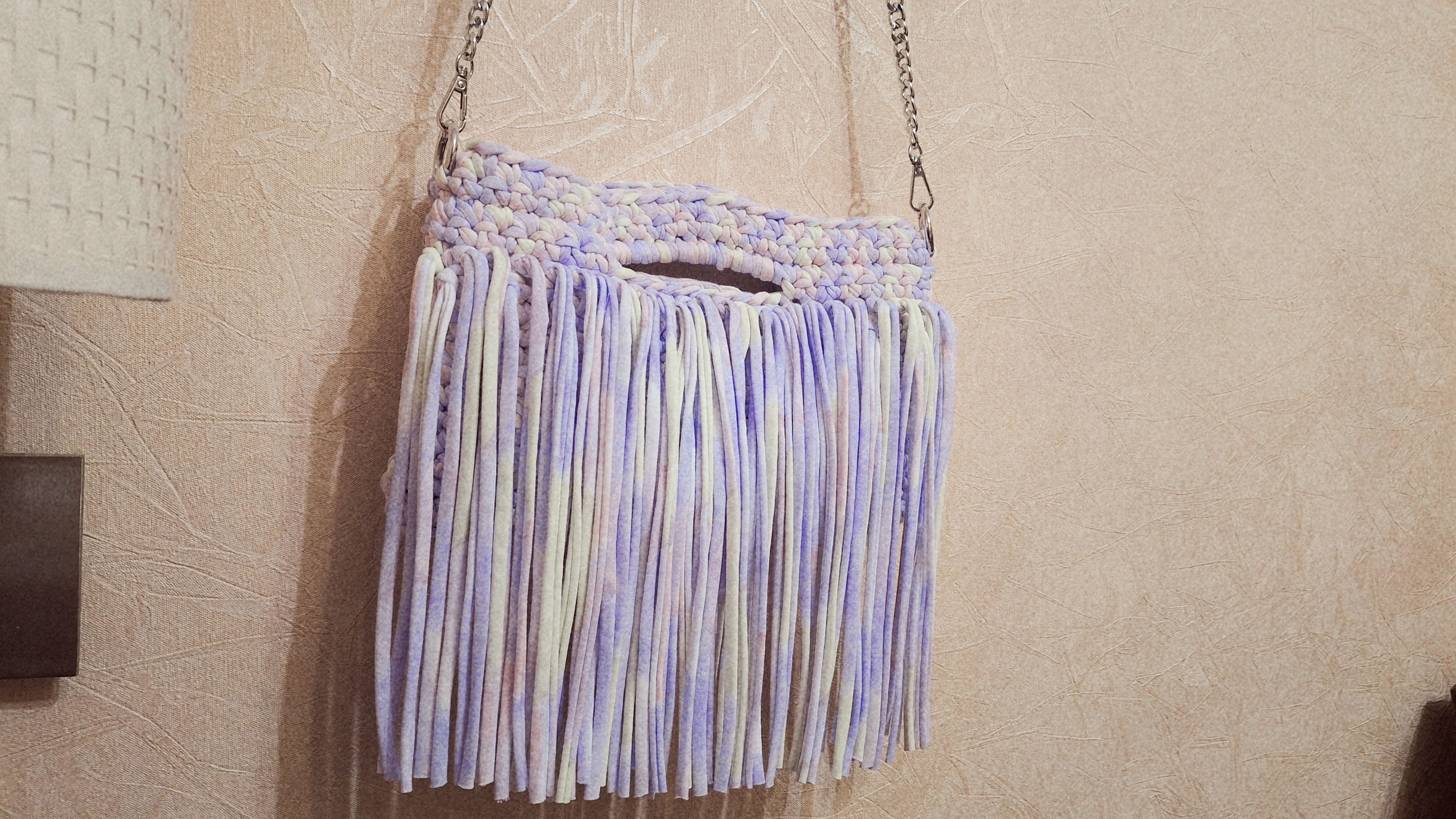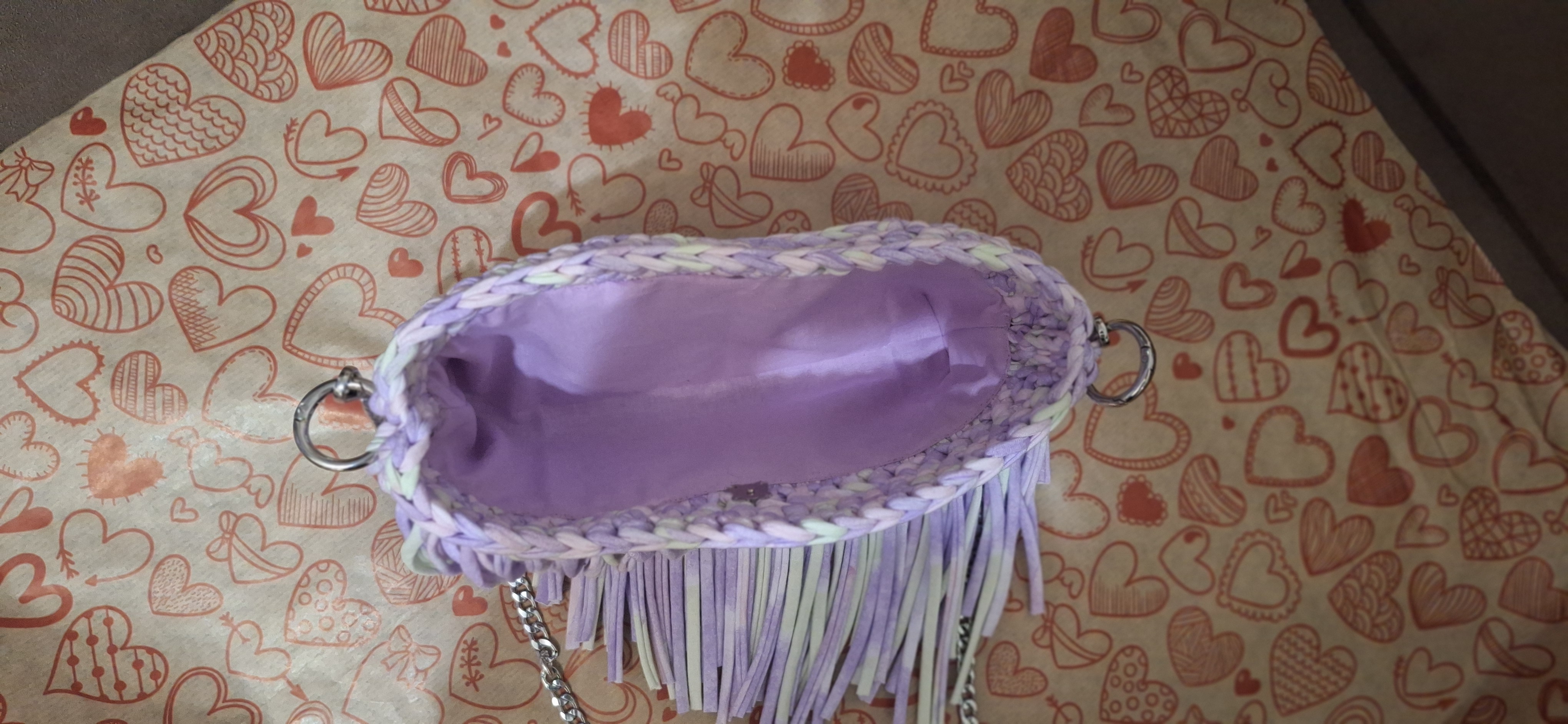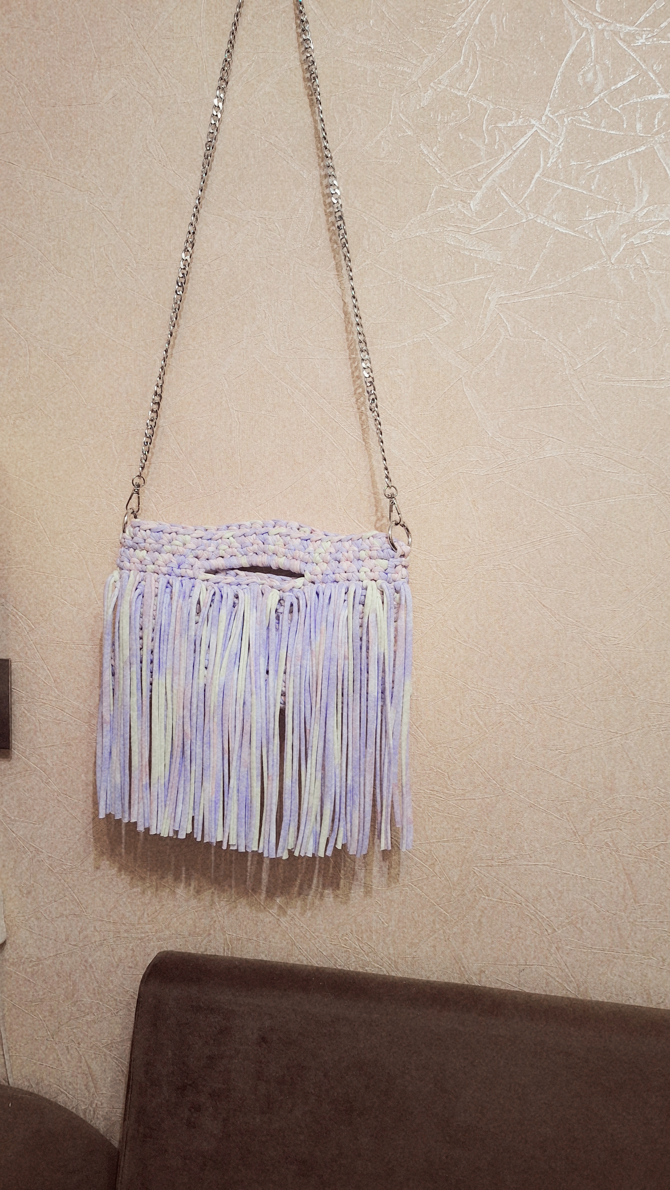 Сумка ручной работы с подкладкой, очень приятной, нежной весенней расцветки из трикотажной пряжи. Можно носить с цепочкой как кросс-боди, длина цепочки 120см, можно держать за ручки, можно носить как клатч. Высота сумки 13см, с ручками 17см, ширина 28см.Сумочка украшена бахромой. Условия и цена доставки обговариваются