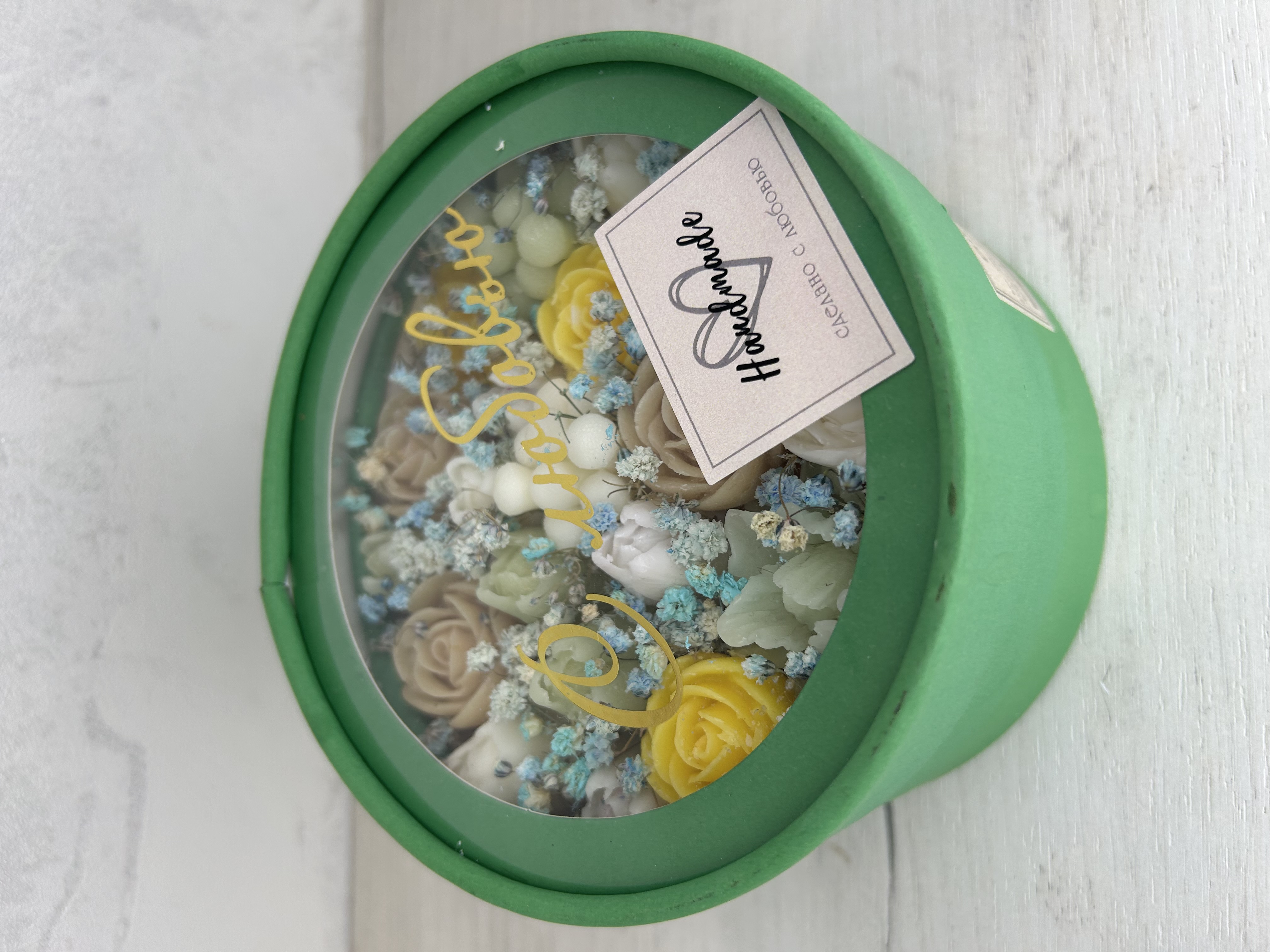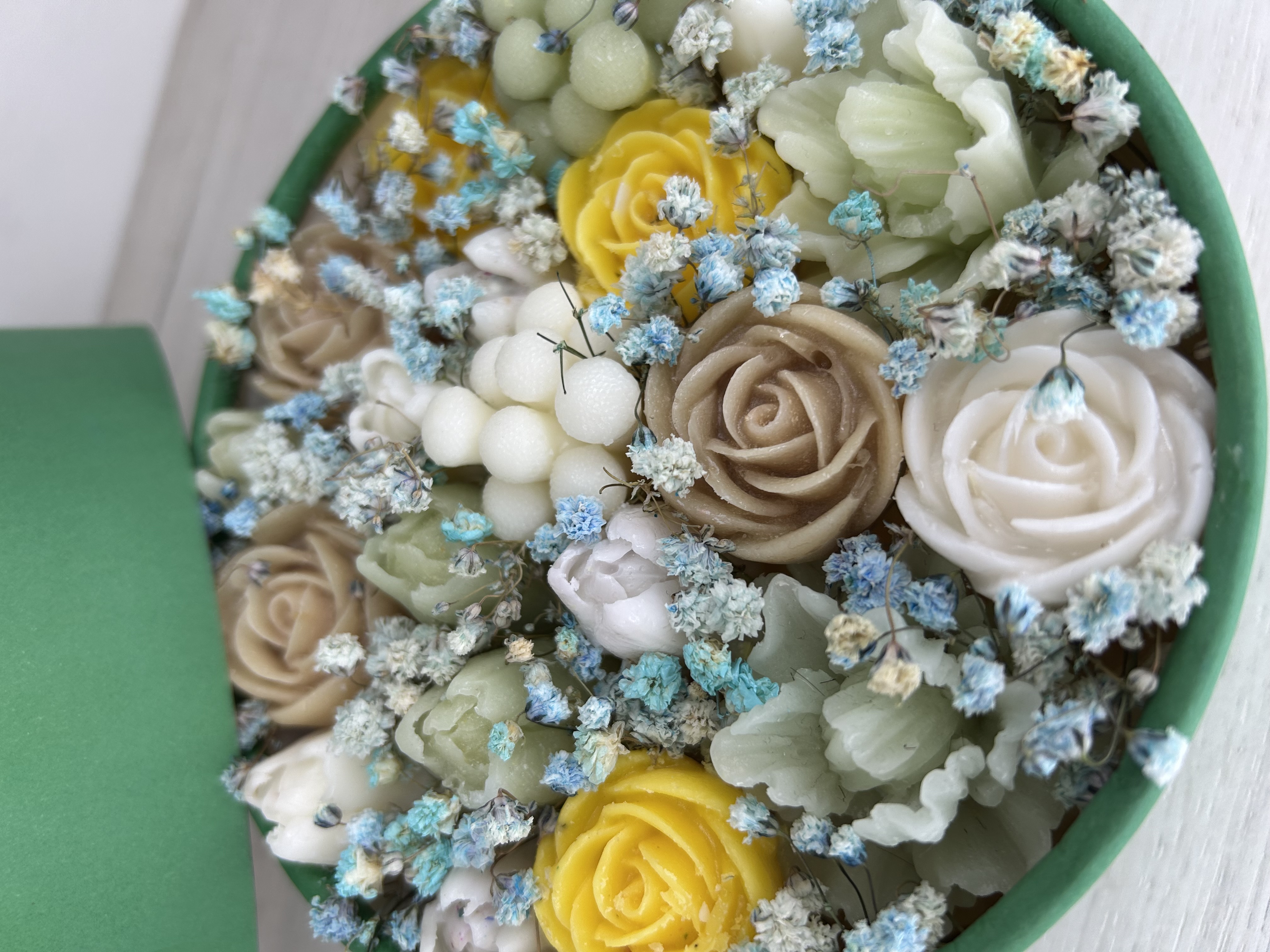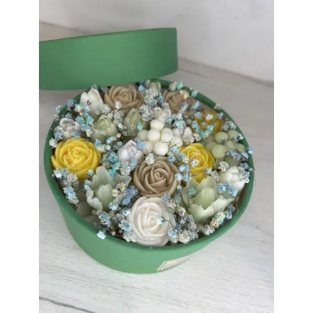 Представьте себе аккуратно оформленную круглую коробку, внутри которой расположены восковые цветы, искусно созданные мастером.Воск придает лепесткам лёгкий глянцевый блеск, а тонкие ароматические масла наполняют пространство воздушной сладостью и утонченным благоуханием.