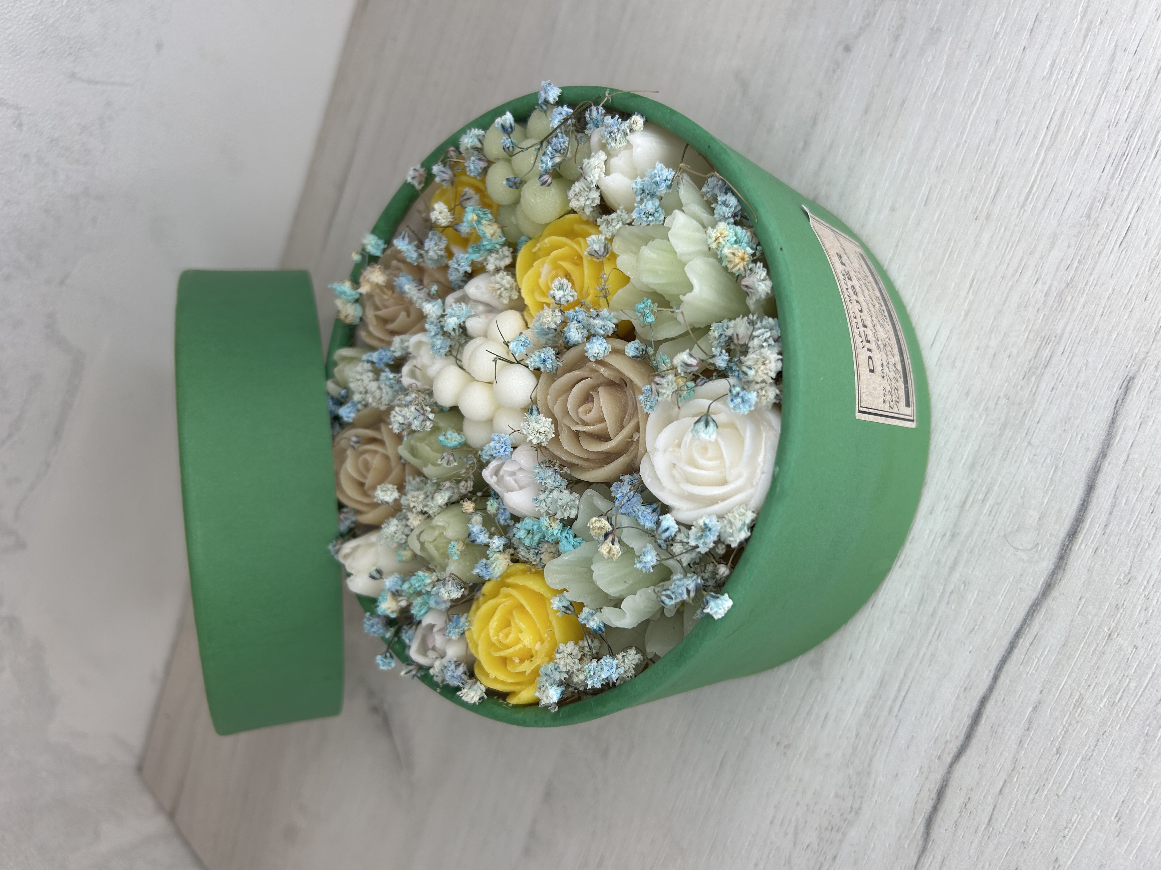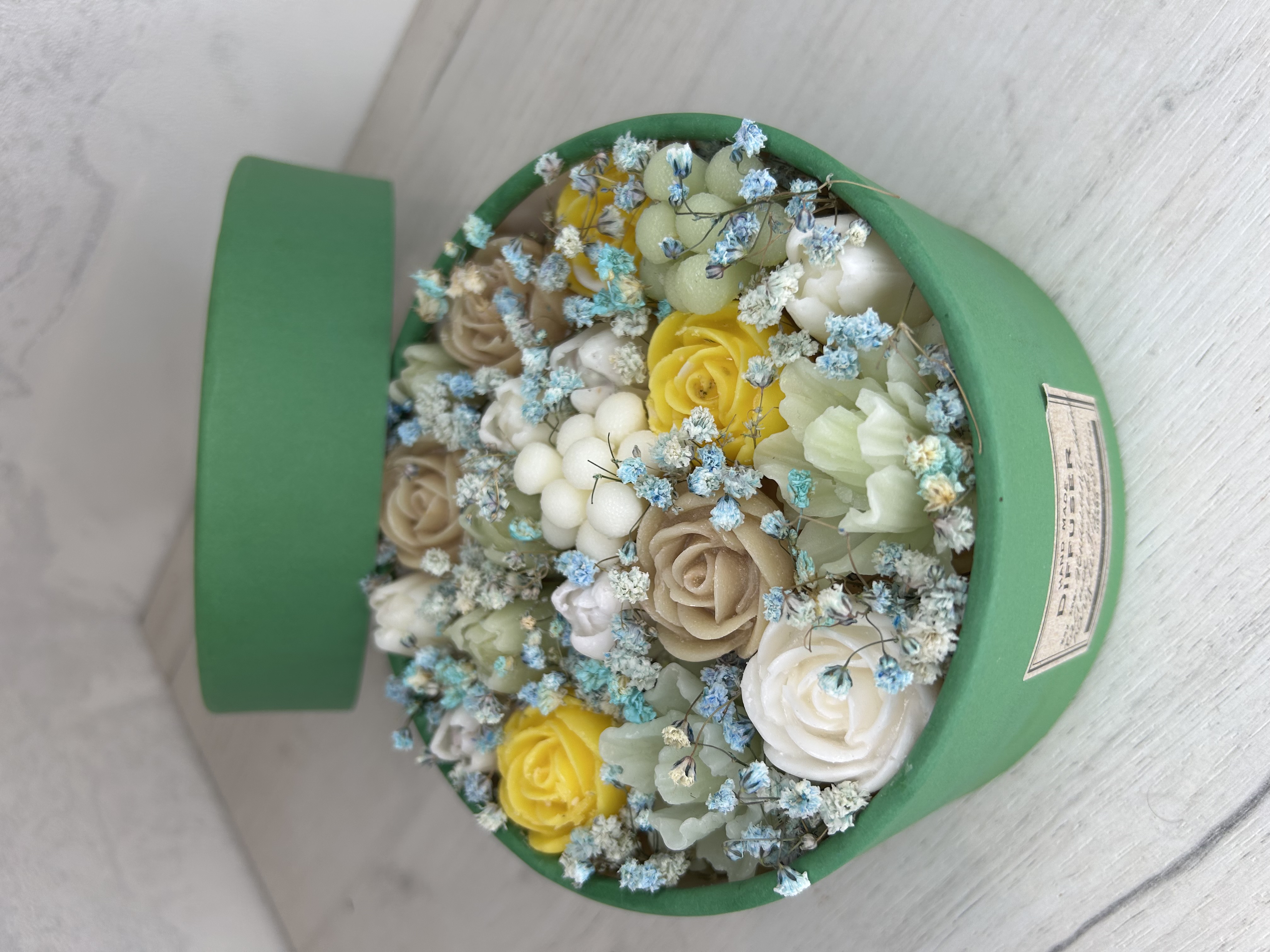 (Диффузор)из воска с ароматами в круглой коробке — это изысканная композиция, которая сочетает в себе нежные оттенки цветов.