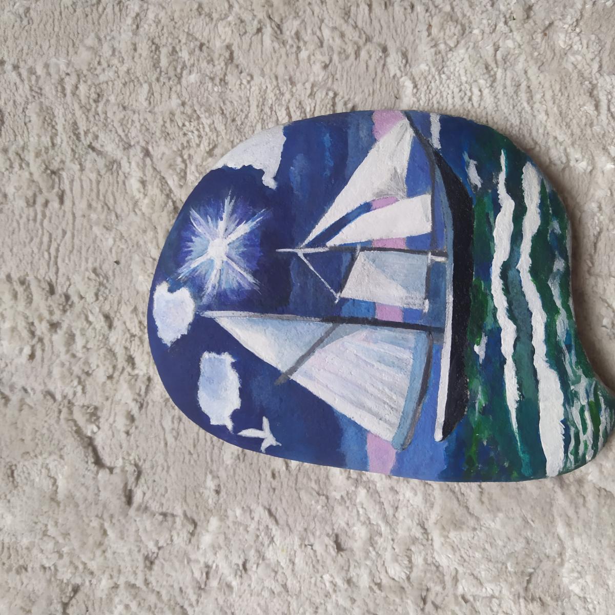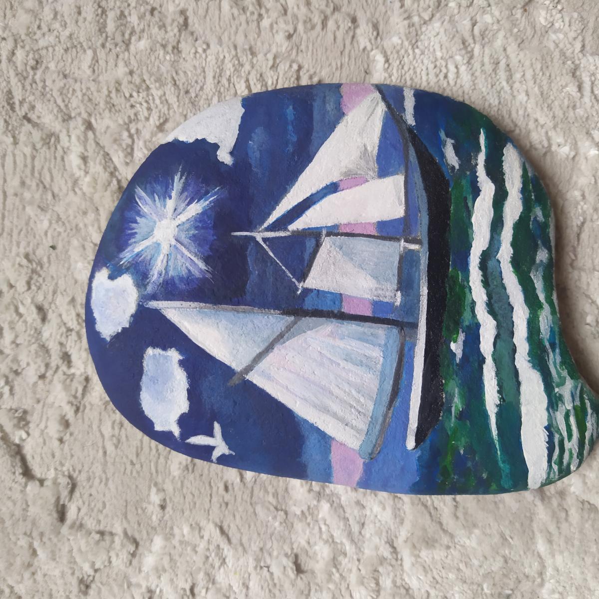 Камень сувенирный с изображением парусников, плывущих по морю (акрил)