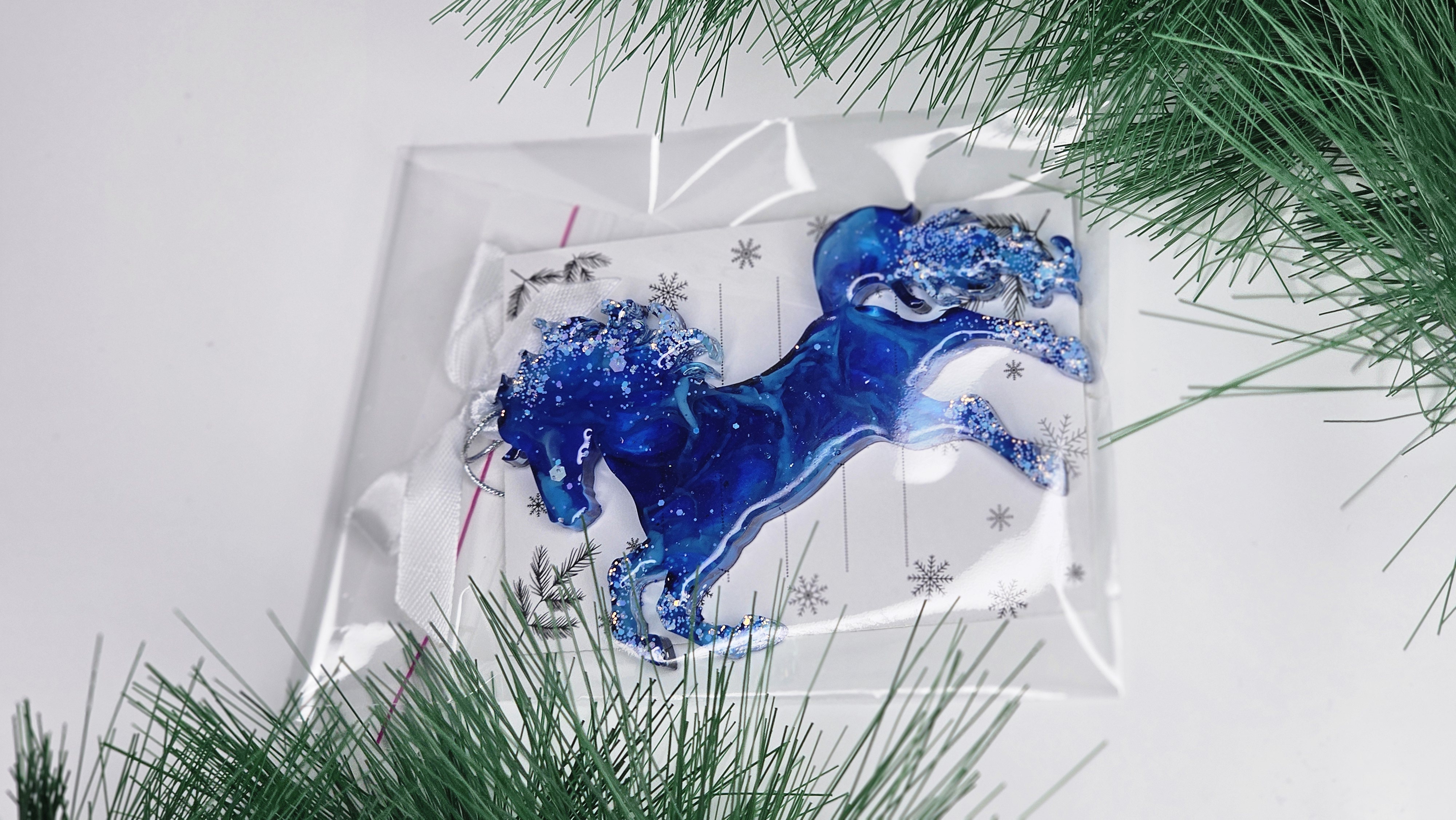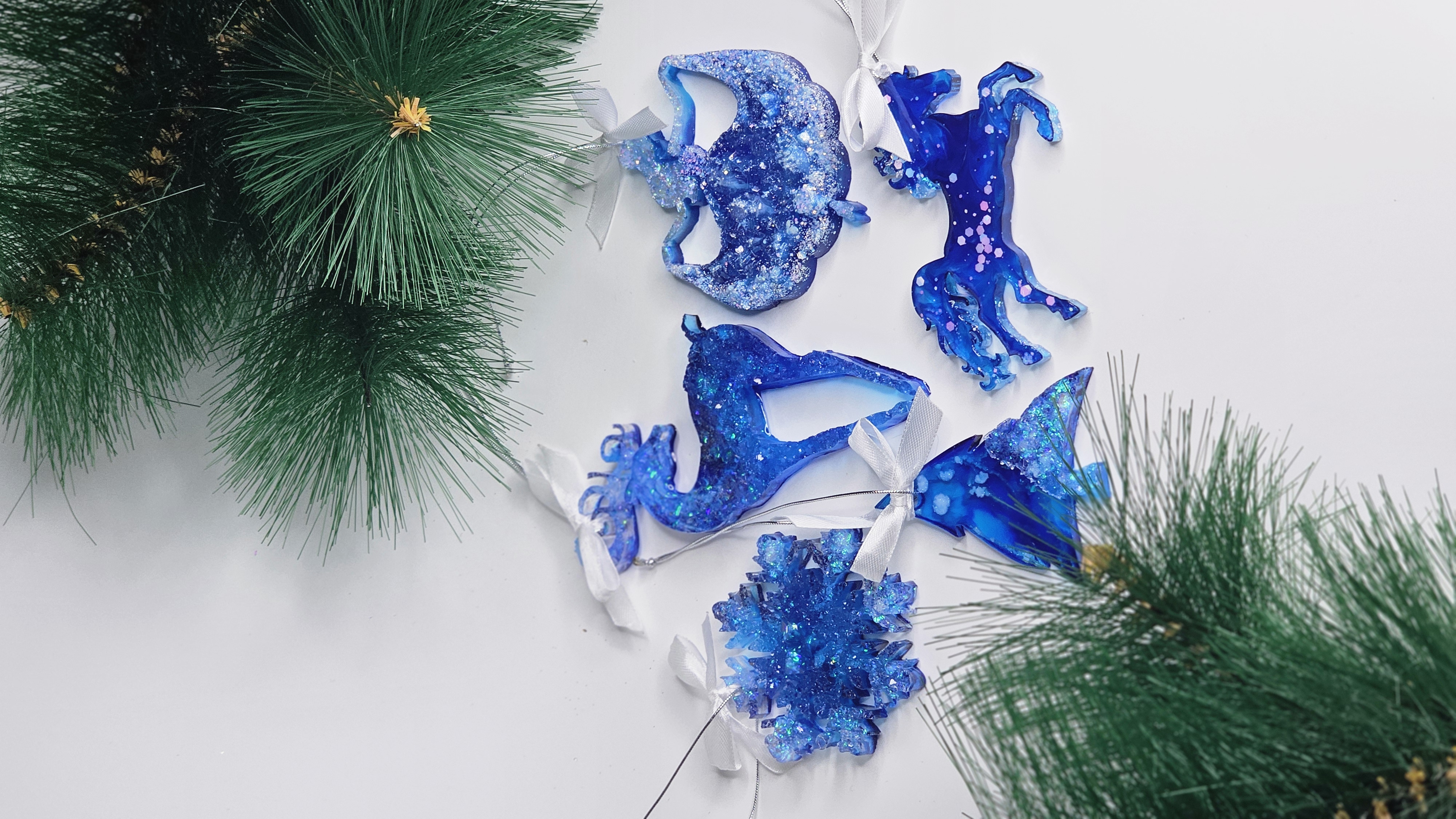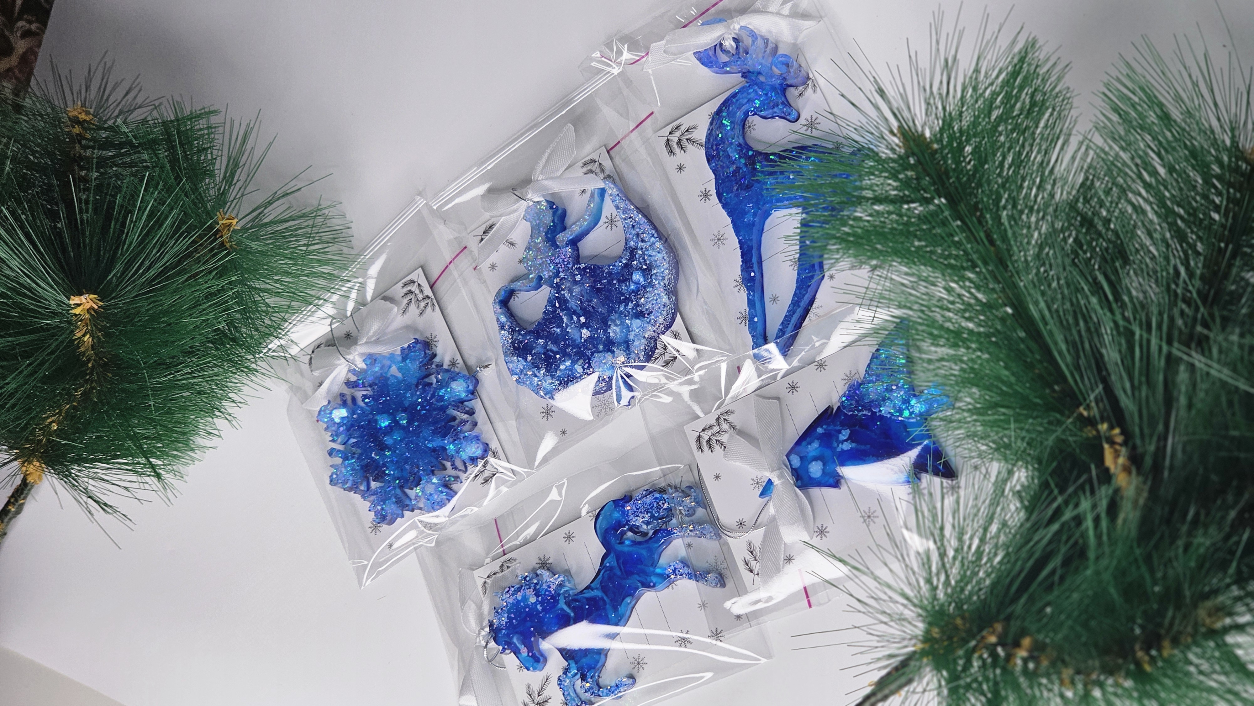 Набор елочных игрушек из эпоксидной смолы включает в себя изящные фигурки, каждая из которых выполнена вручную и обладает уникальной текстурой. В данном наборе представлены: снежинка, олень, лошадка, принцесса и елка. Все игрушки выполнены в холодных синих тонах с добавлением белых и золотистых акцентов, что создает эффект зимнего сияния.
