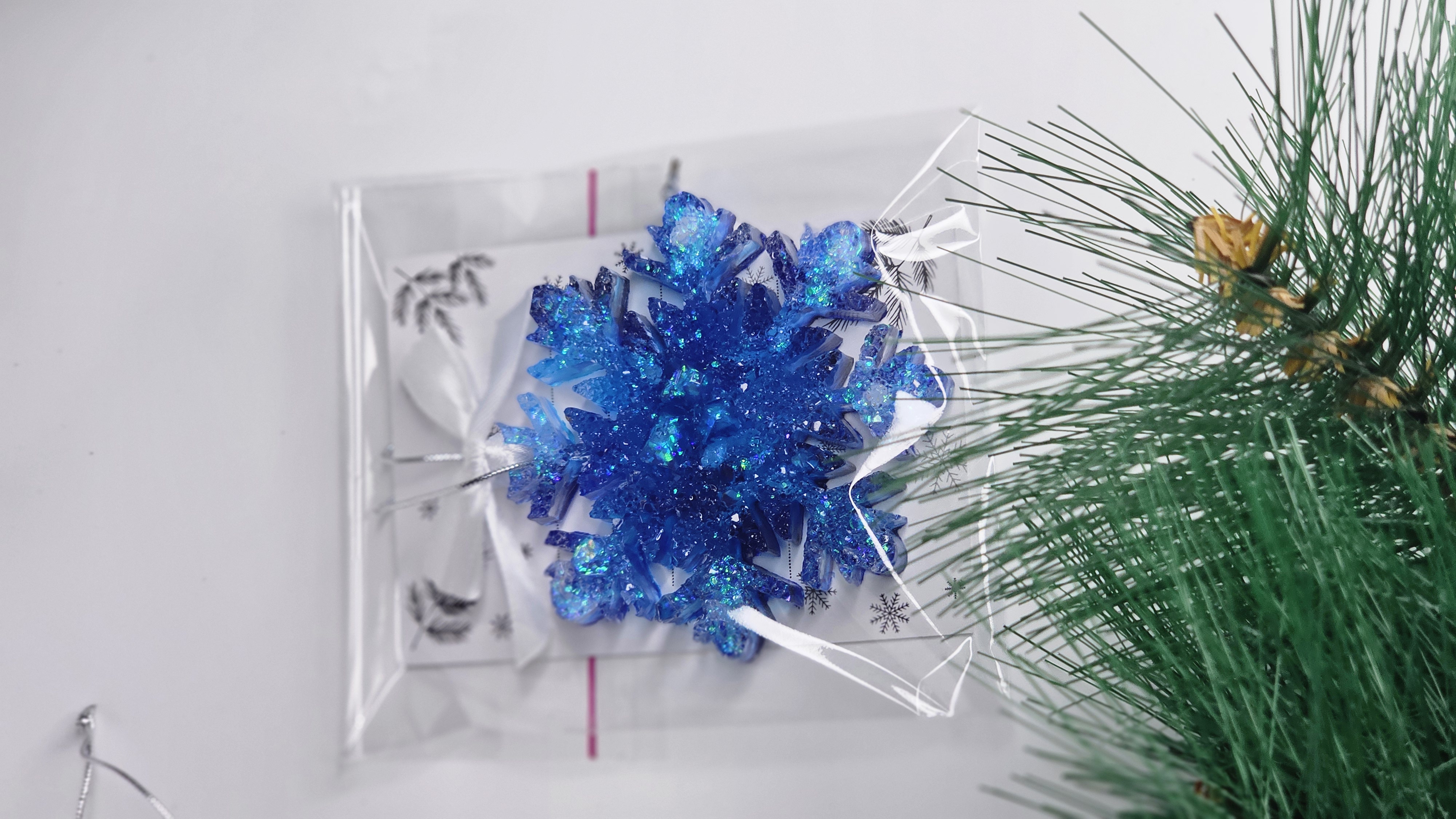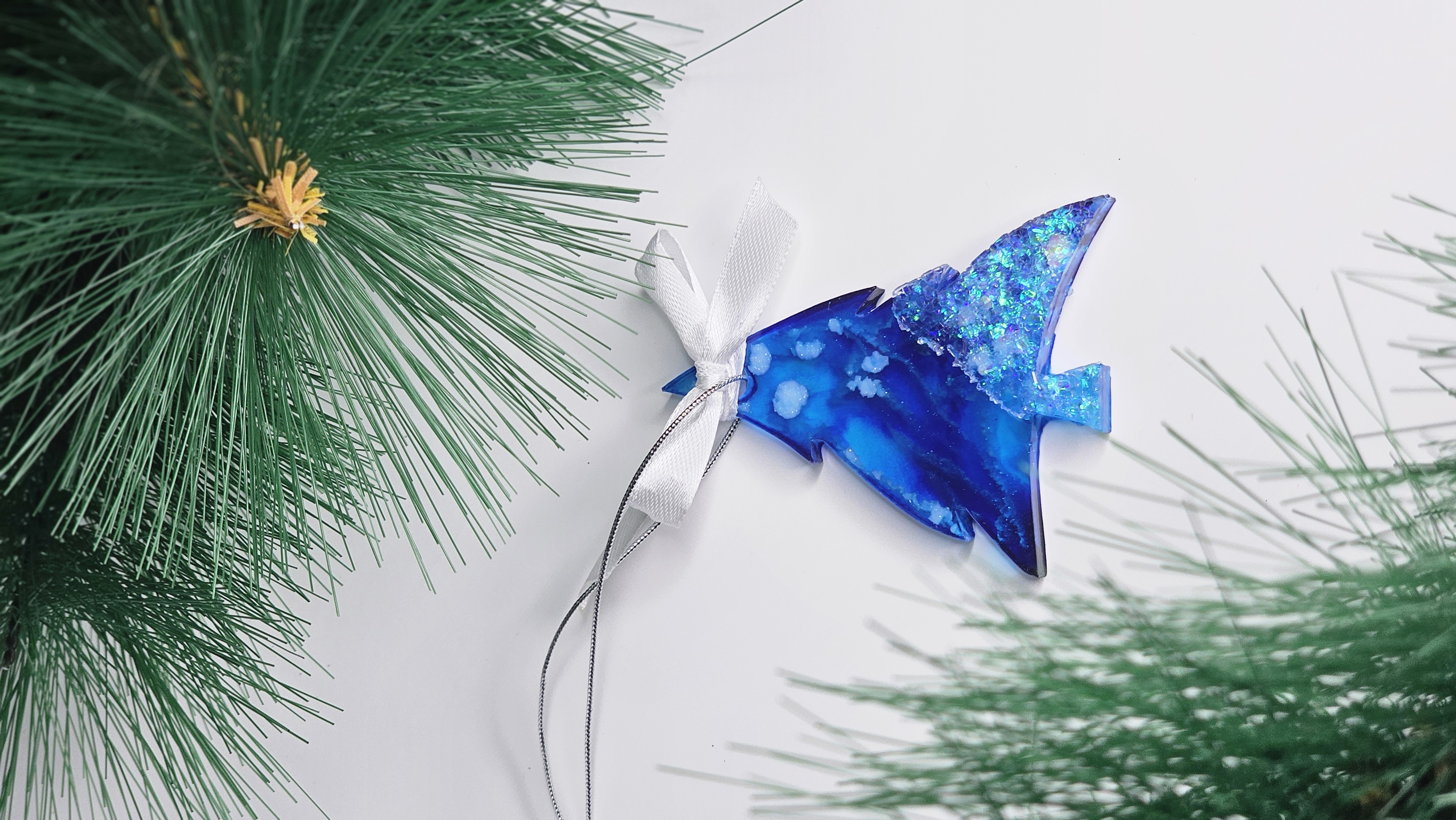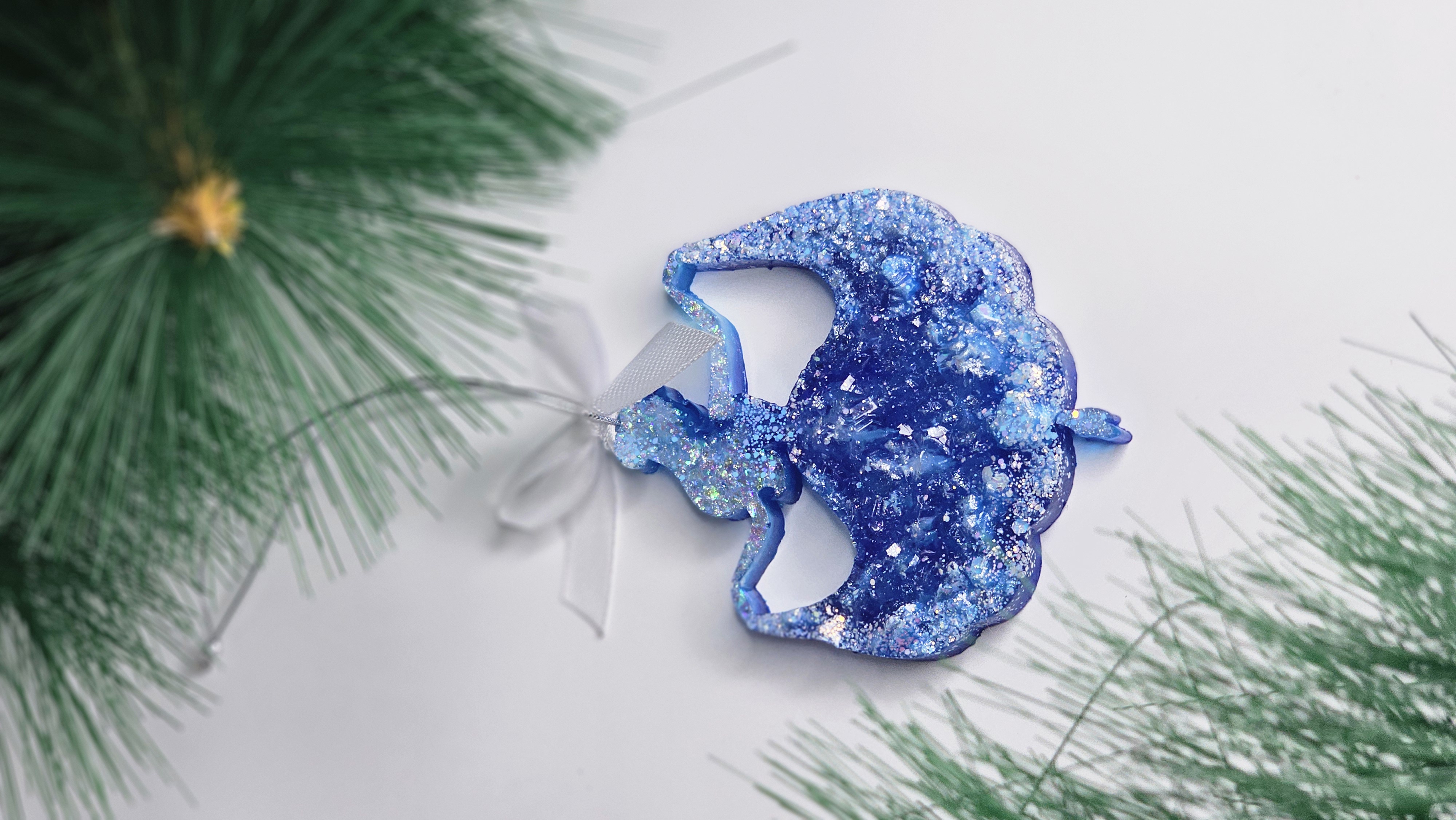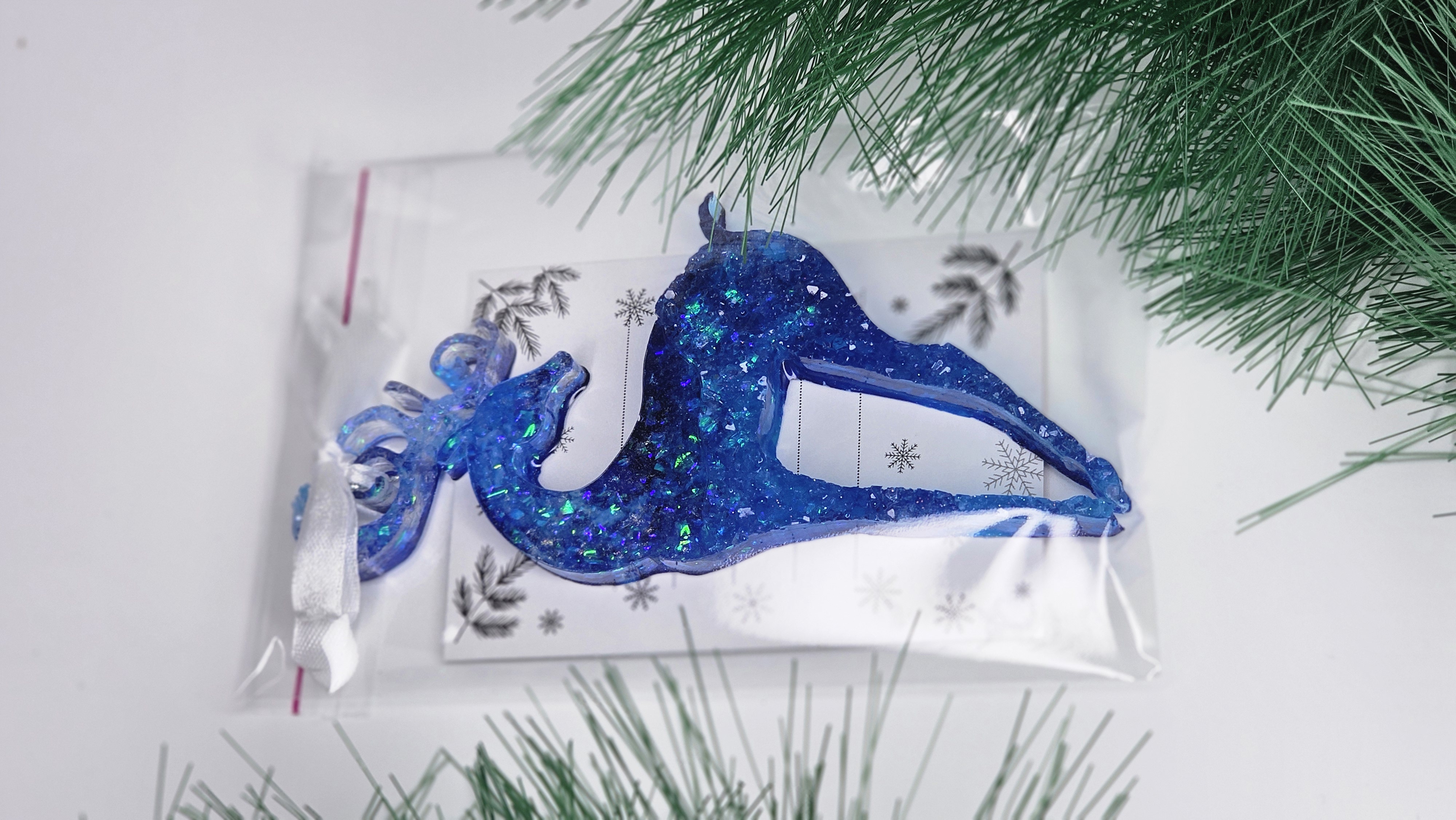 Набор елочных игрушек из эпоксидной смолы включает в себя изящные фигурки, каждая из которых выполнена вручную и обладает уникальной текстурой. В данном наборе представлены: снежинка, олень, лошадка, принцесса и елка. Все игрушки выполнены в холодных синих тонах с добавлением белых и золотистых акцентов, что создает эффект зимнего сияния.