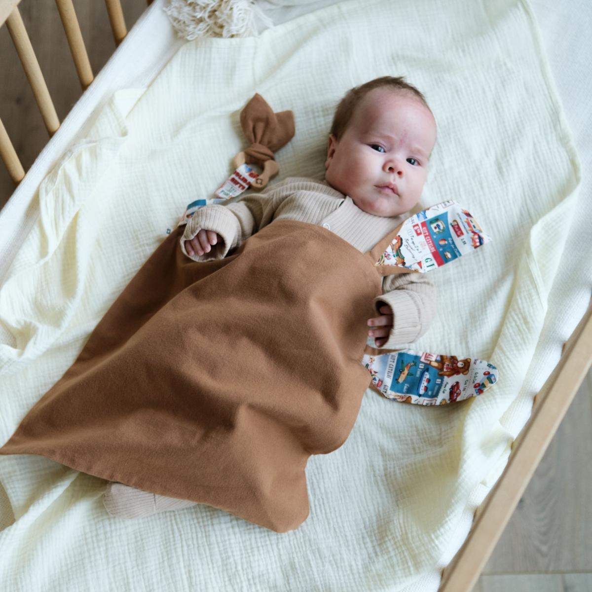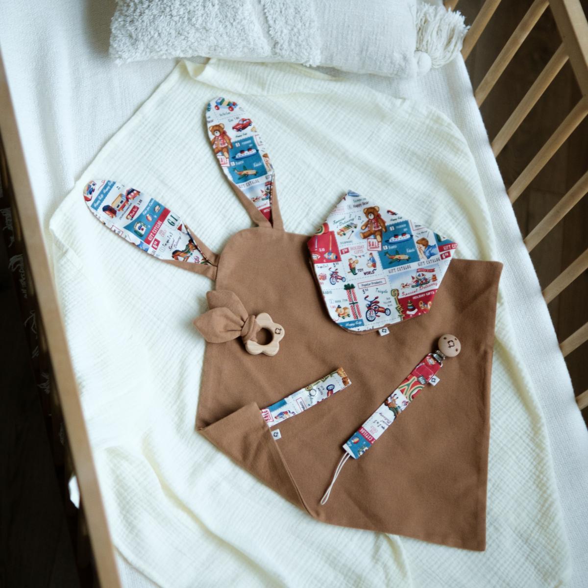 Комплект состоит из четырёх предметов: комфортер (1шт), слюнявчик (1шт), шуршалка (1шт) и держатель для пустышки (1шт). Цветочек-грызунок отвязывается от шуршалки и может быть прикреплён к комфортеру с помощью петельки на кнопке. Набор идеально может послужить подарком или стать радостной покупкой для малыша. Изделия в комплекте сочетаются между собой и образуют вместе идеальный образ.