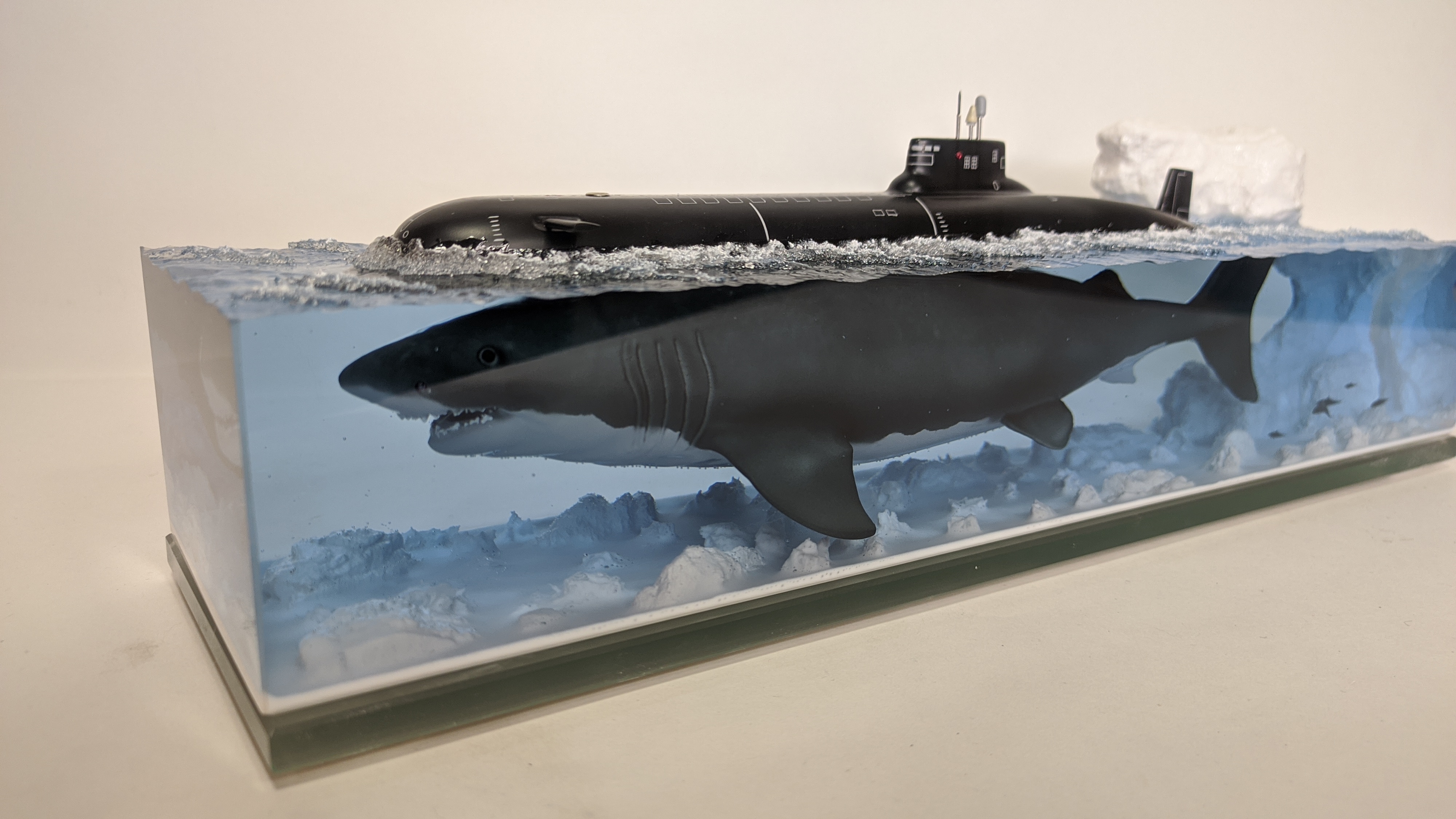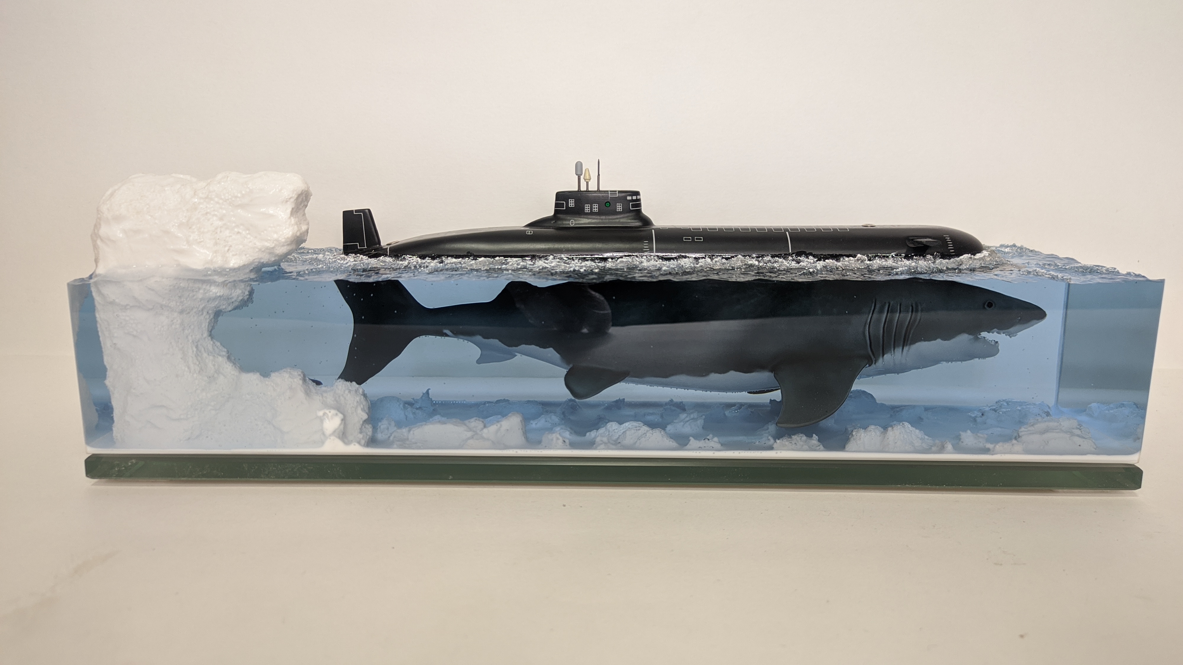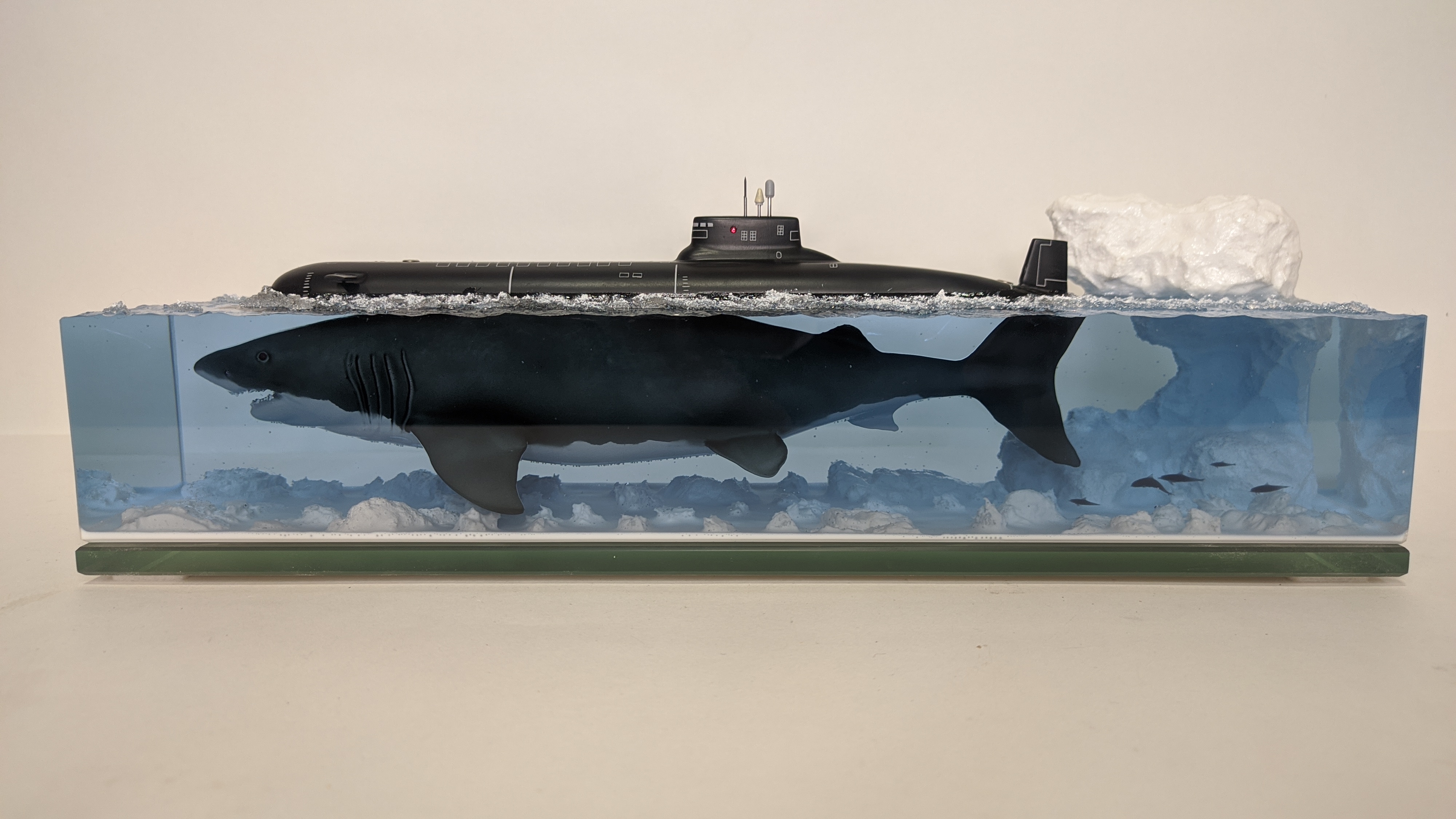 Работа в стиле фэнтези. Надводная часть самая большая в мире Атомная подводная лодка проекта 941 "Акула". Под водой, как продолжение, большая белая акула. Возможно добавление подсветки с питанием от аккумулятора и с управлением с пульта.(+3000р.)
