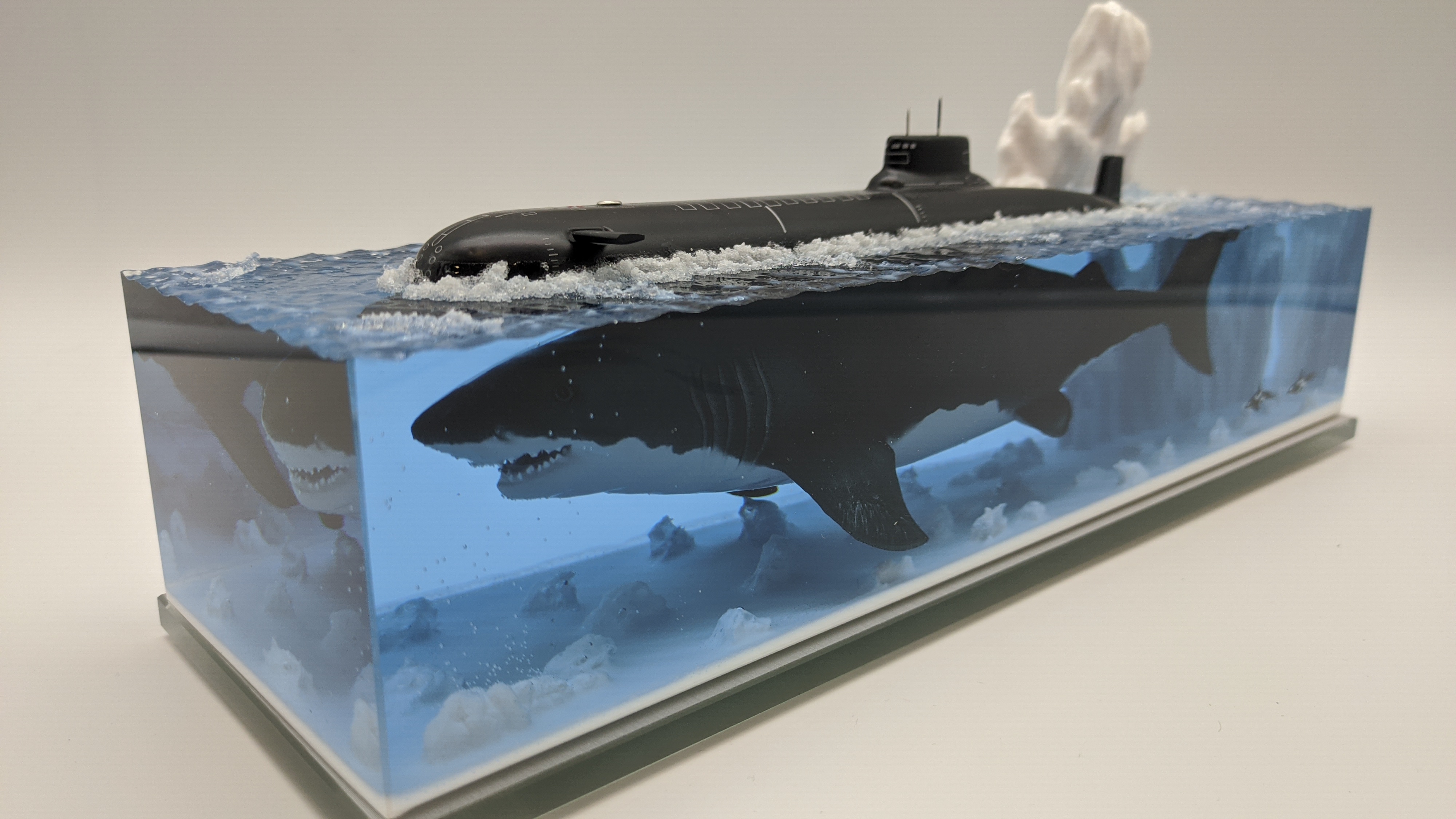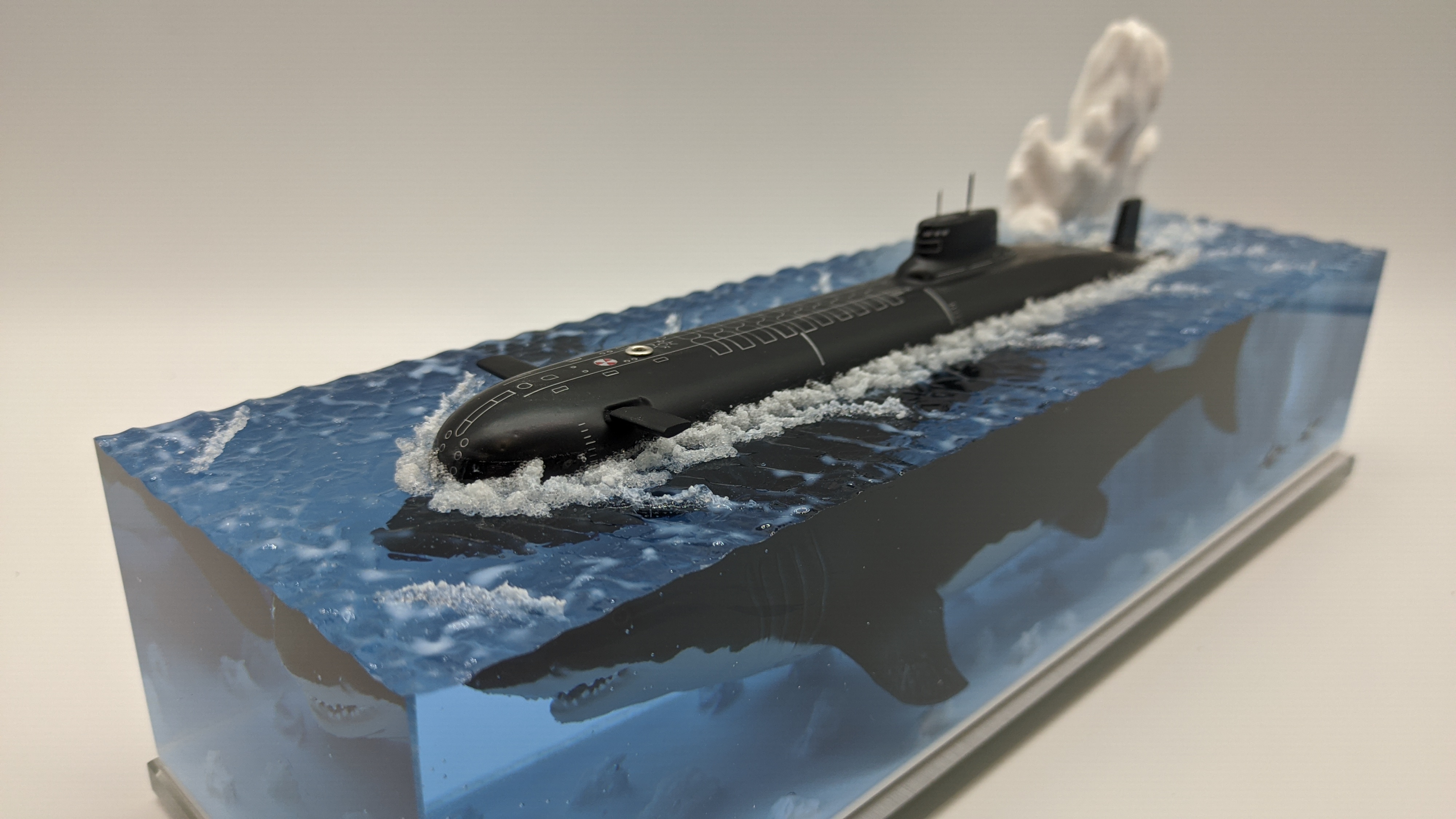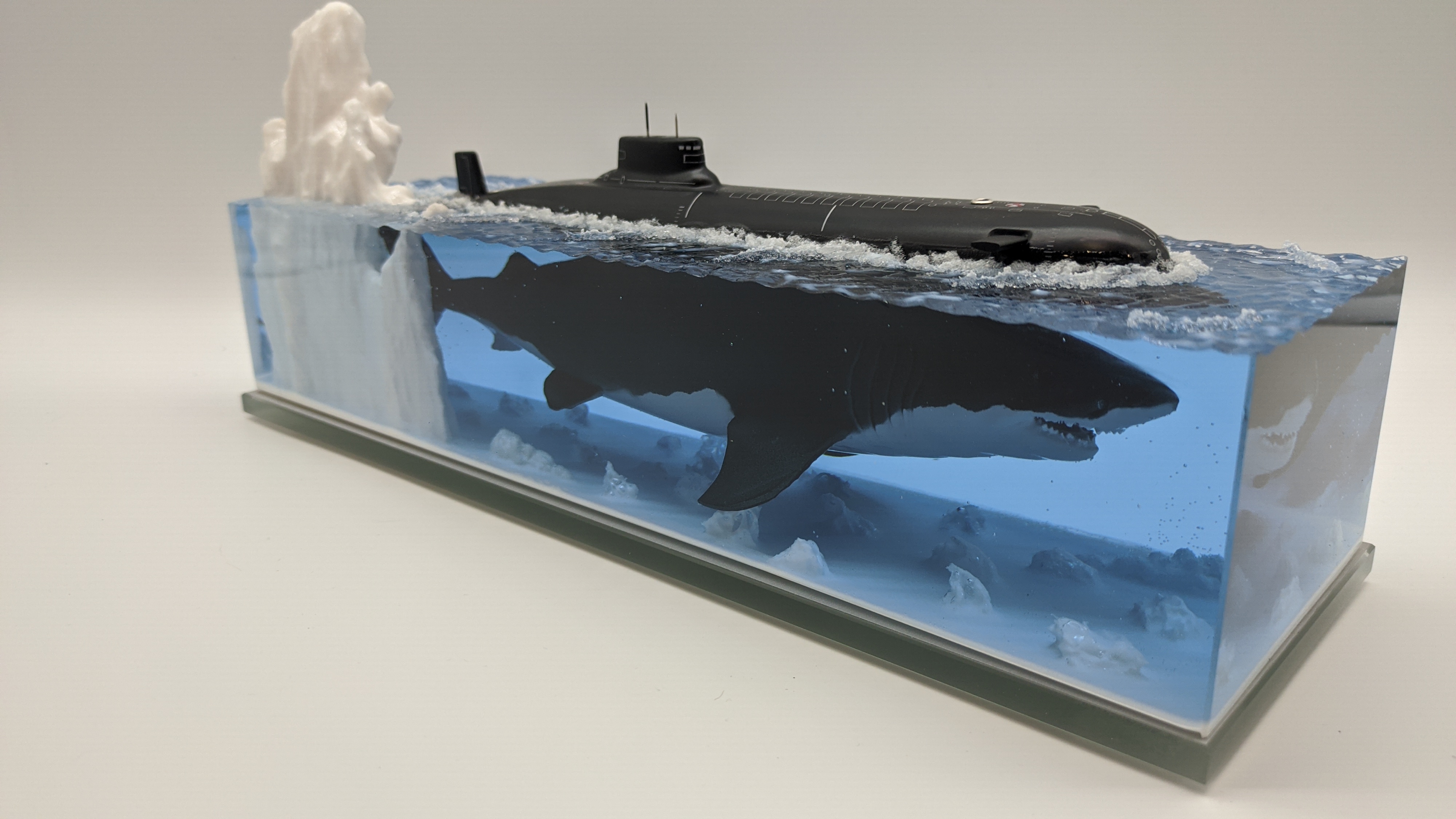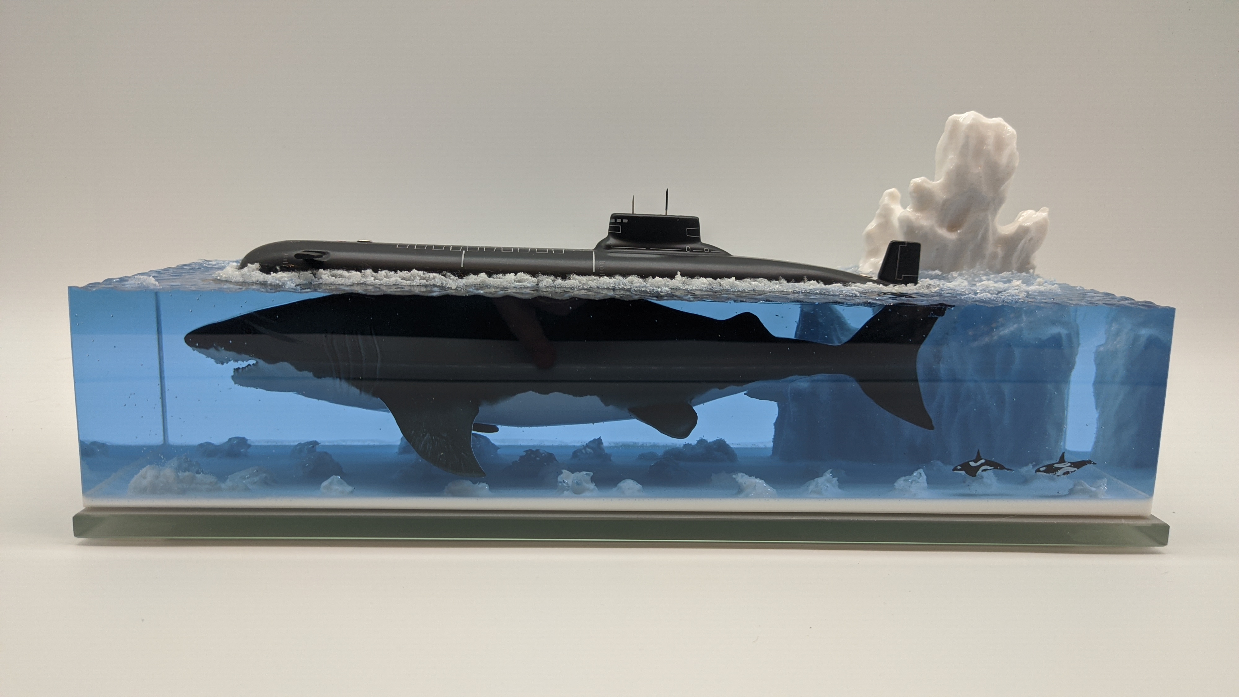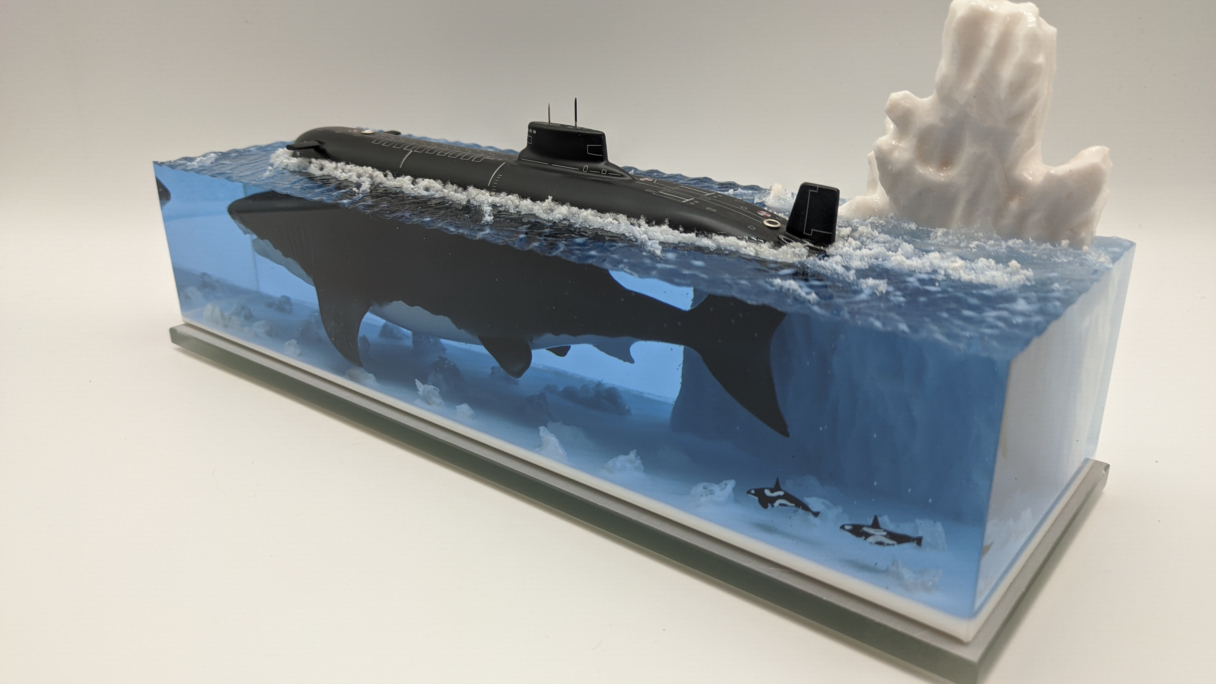 Высокая детализация моделей и разметки. Дно натуральная гранитная крошка. На диораме так же представлены касатки и дельфины. Всё выполнено в масштабе для сравнения размеров лодки с животными..