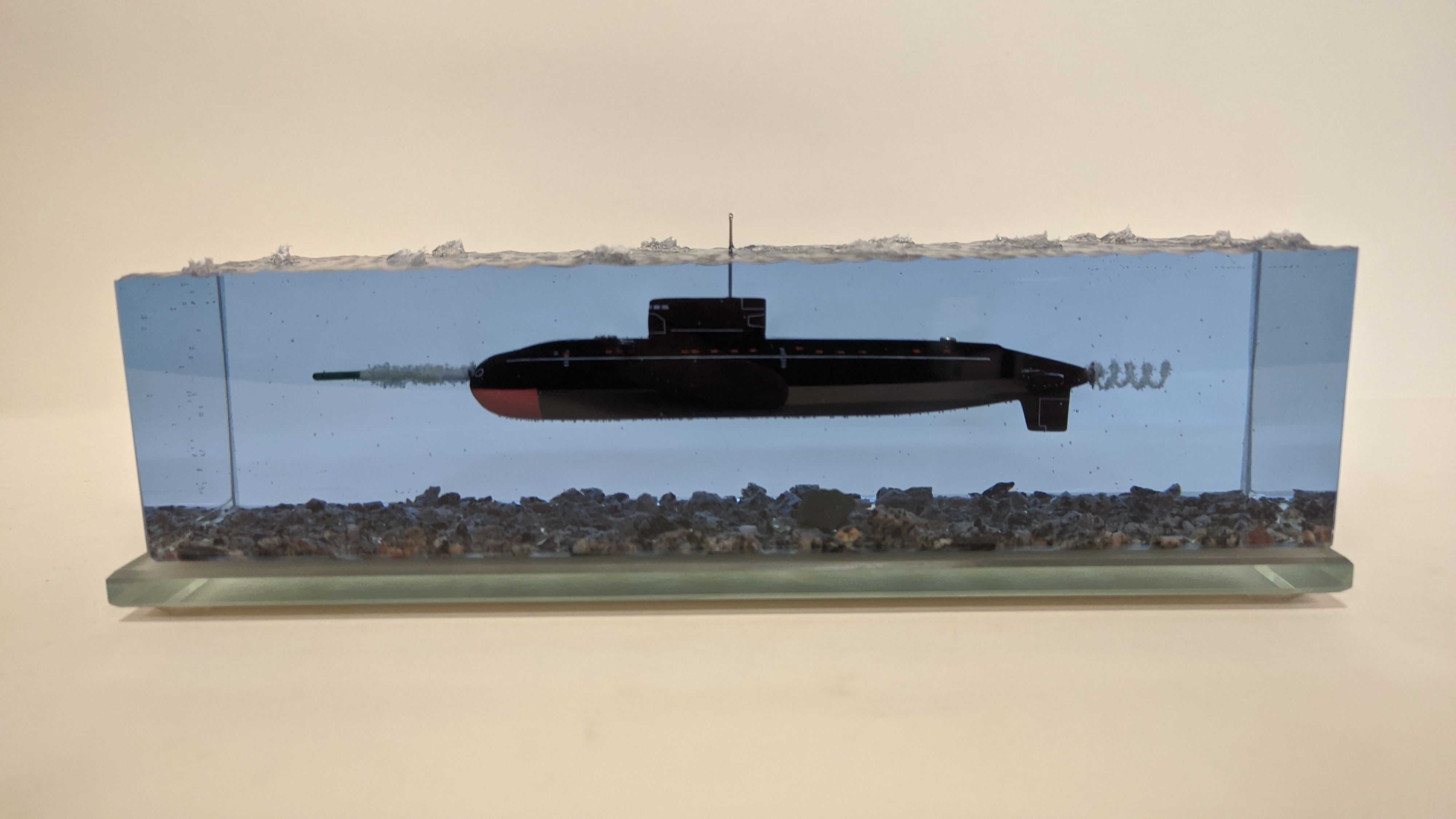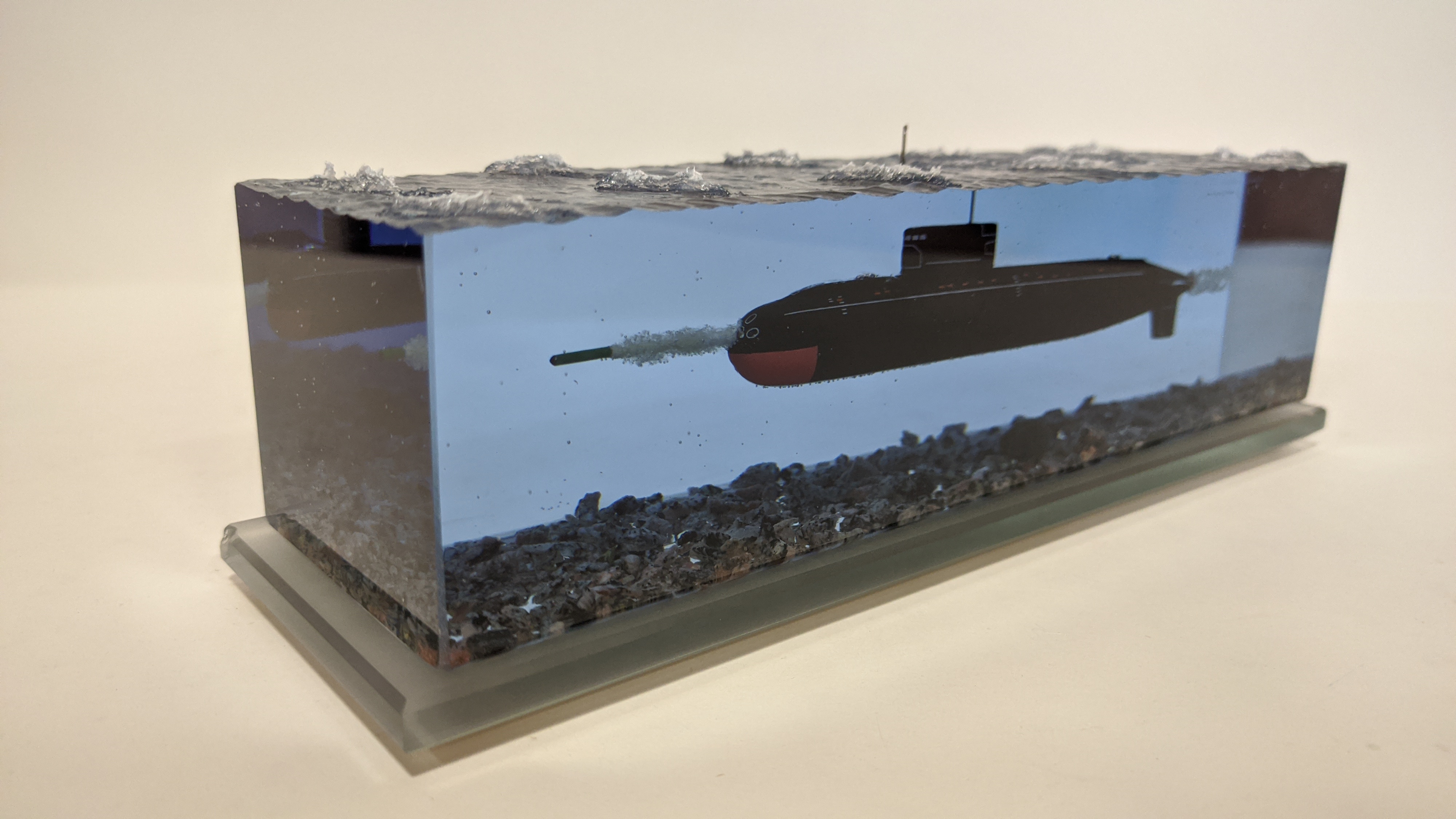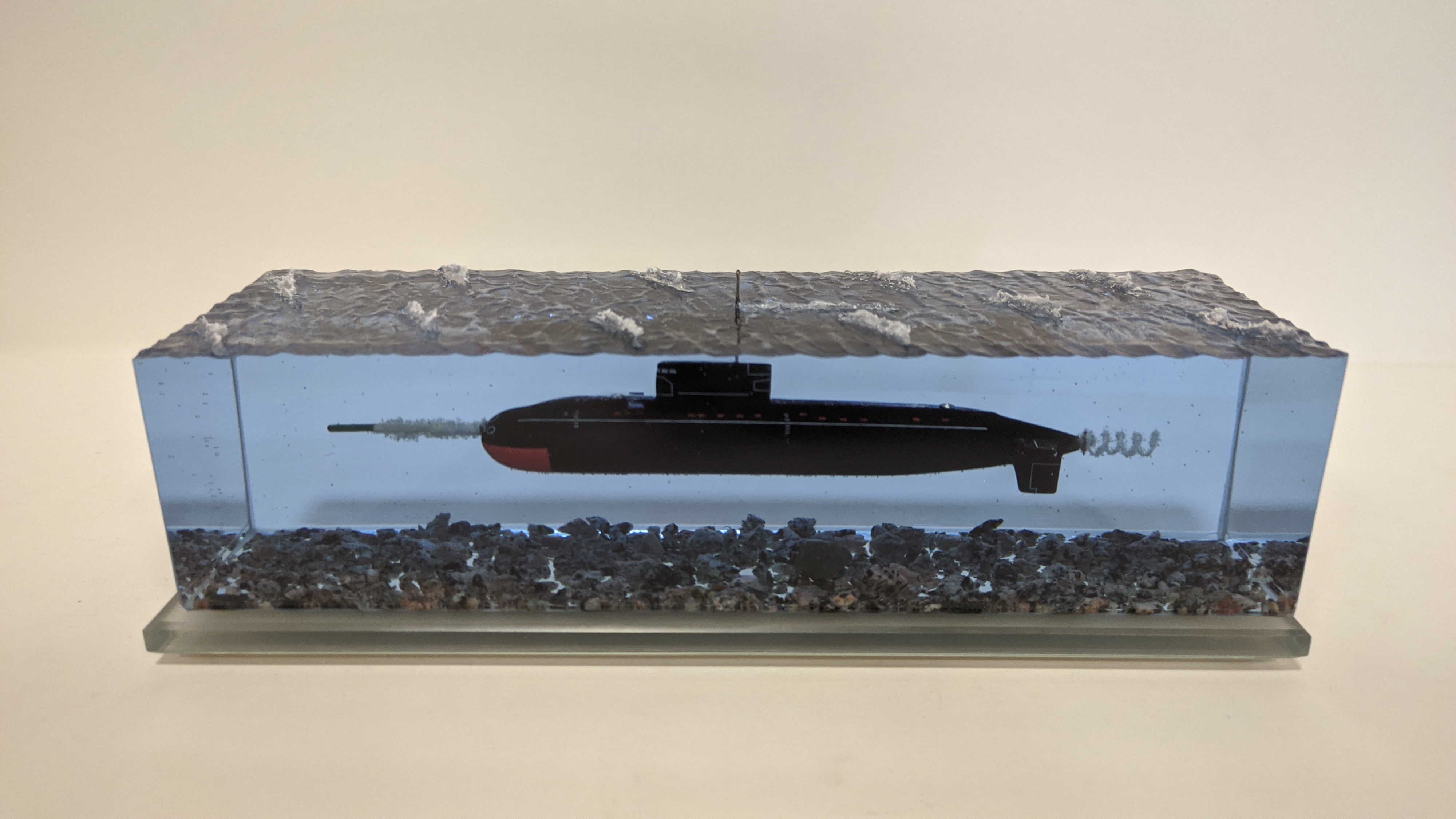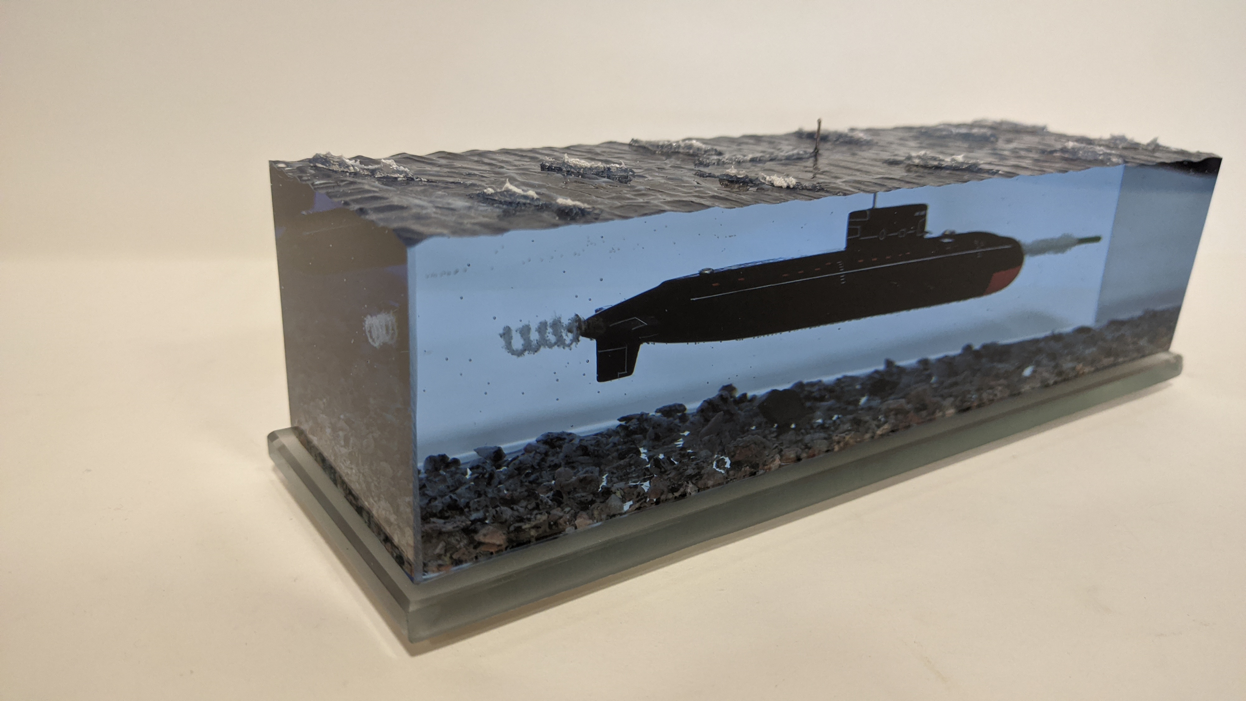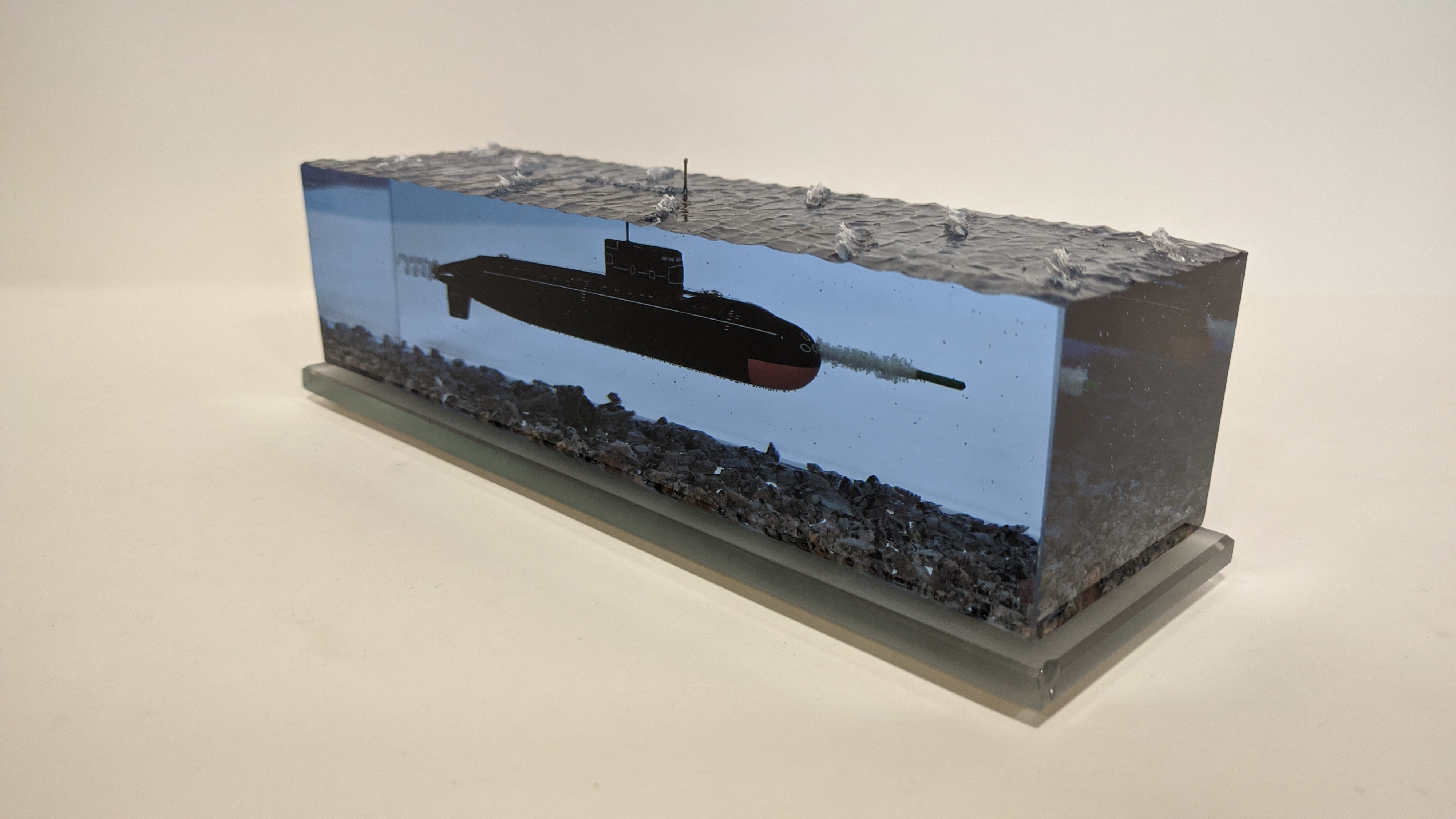 Дизель-электрическая подводная лодка в эпоксидной смоле, проект 636\877 "Варшавянка". Дно из натуральной гранитной крошки. Подставка стекло 8мм.