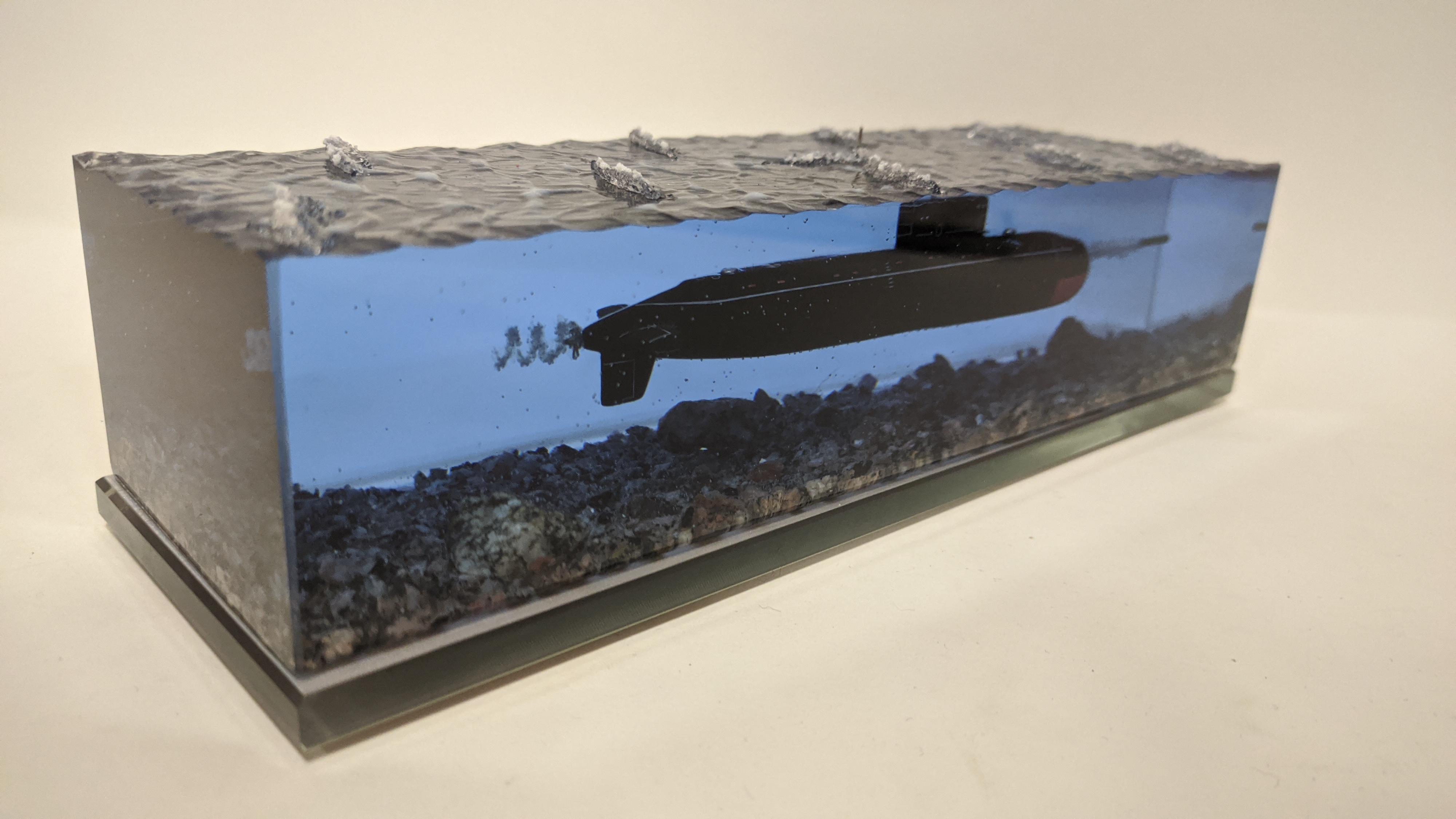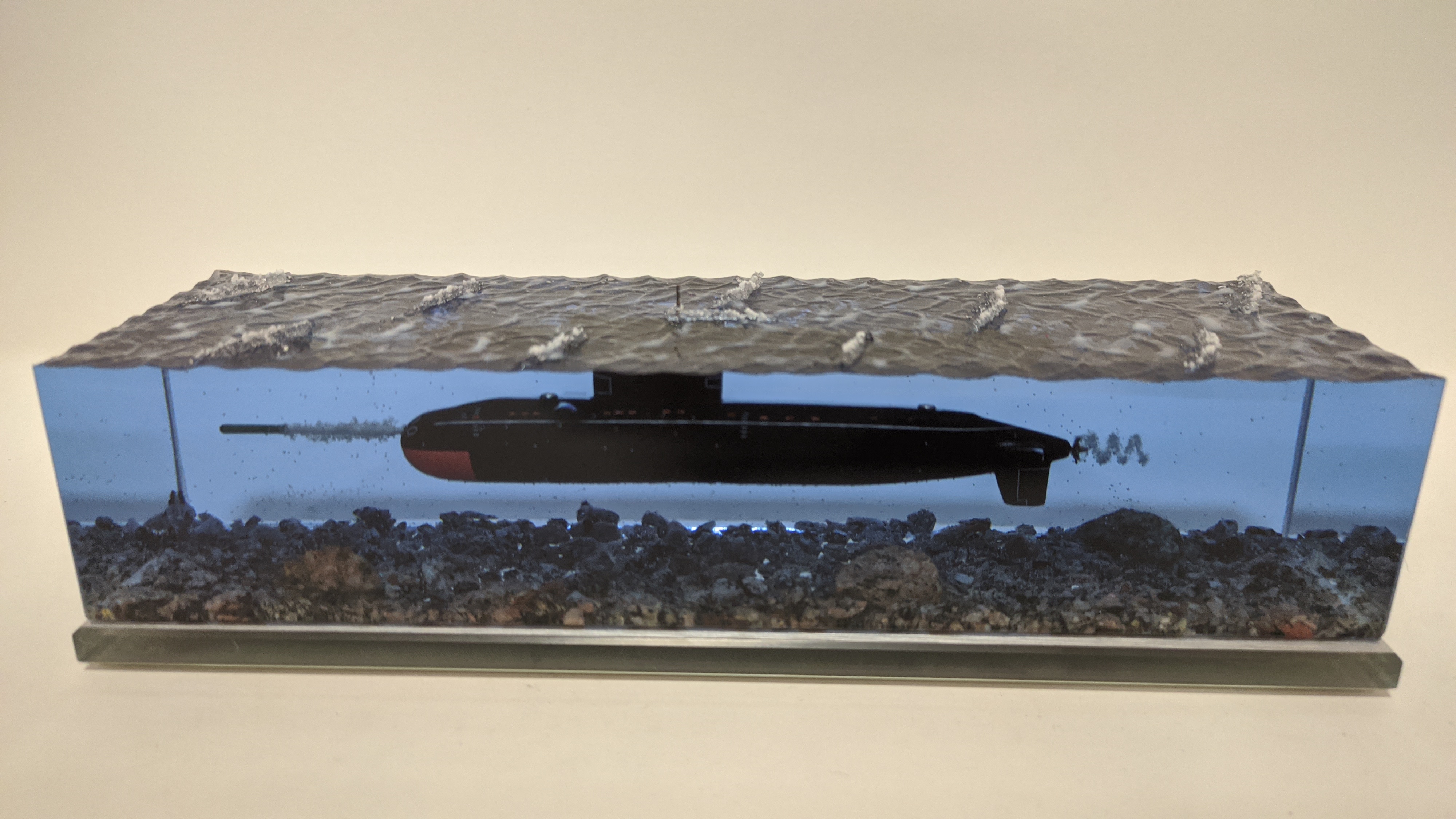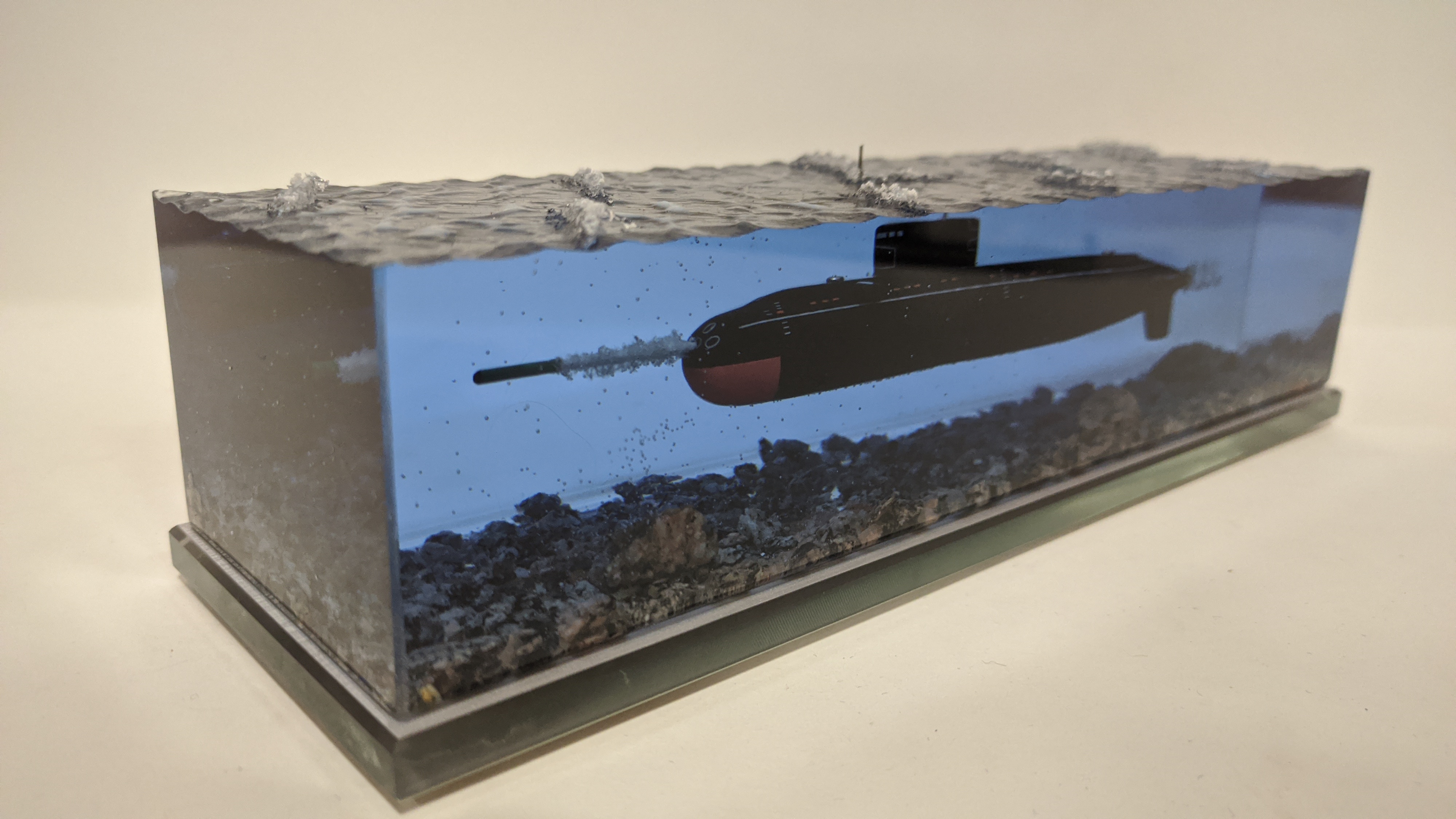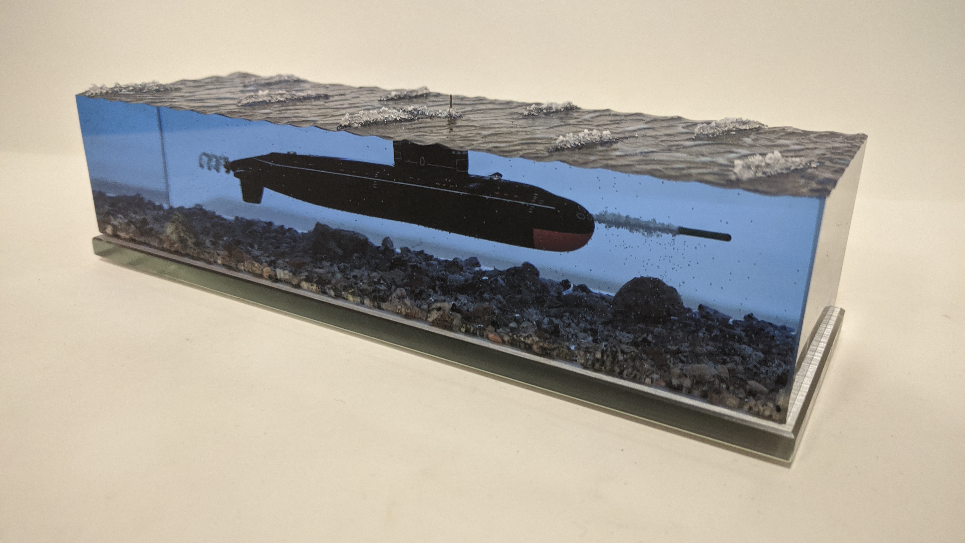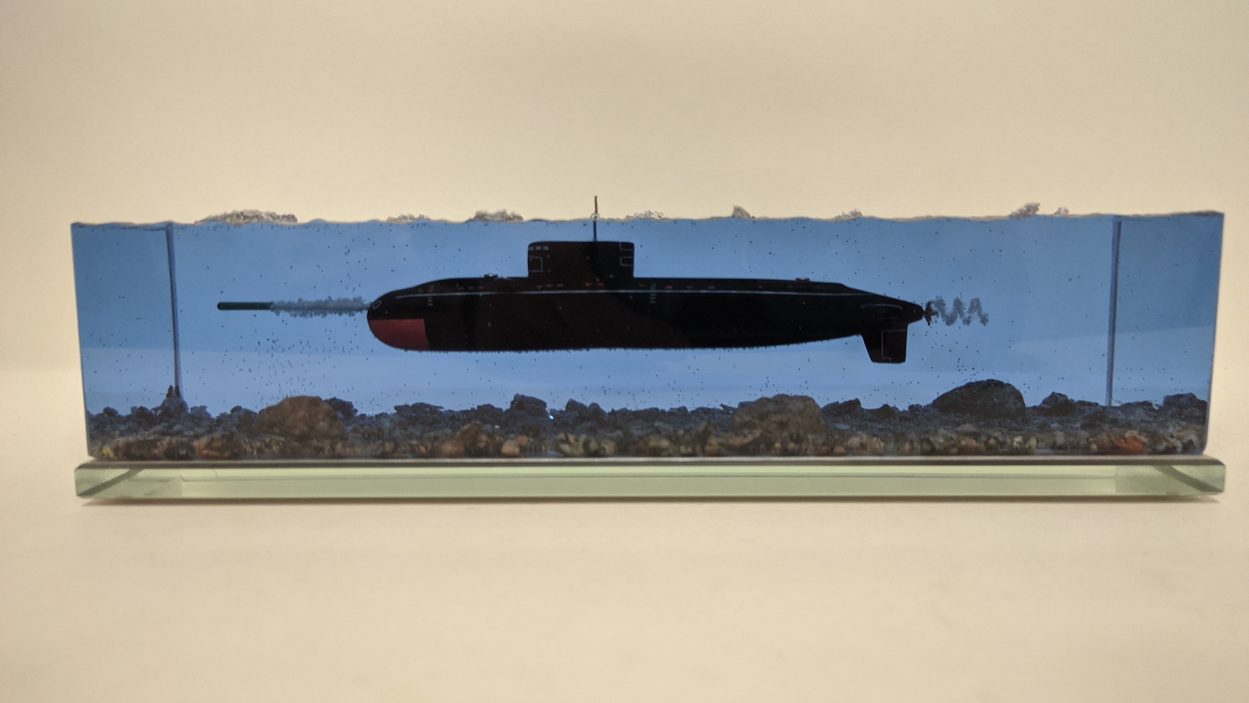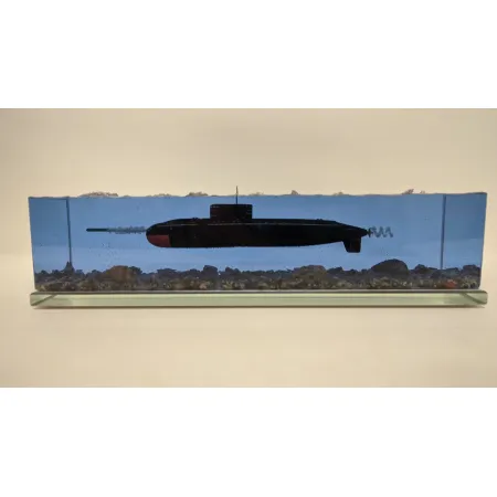 Дизель-электрическая подводная лодка в эпоксидной смоле, проект 636\877 "Варшавянка". Дно из натуральной гранитной крошки. Подставка стекло 8мм.