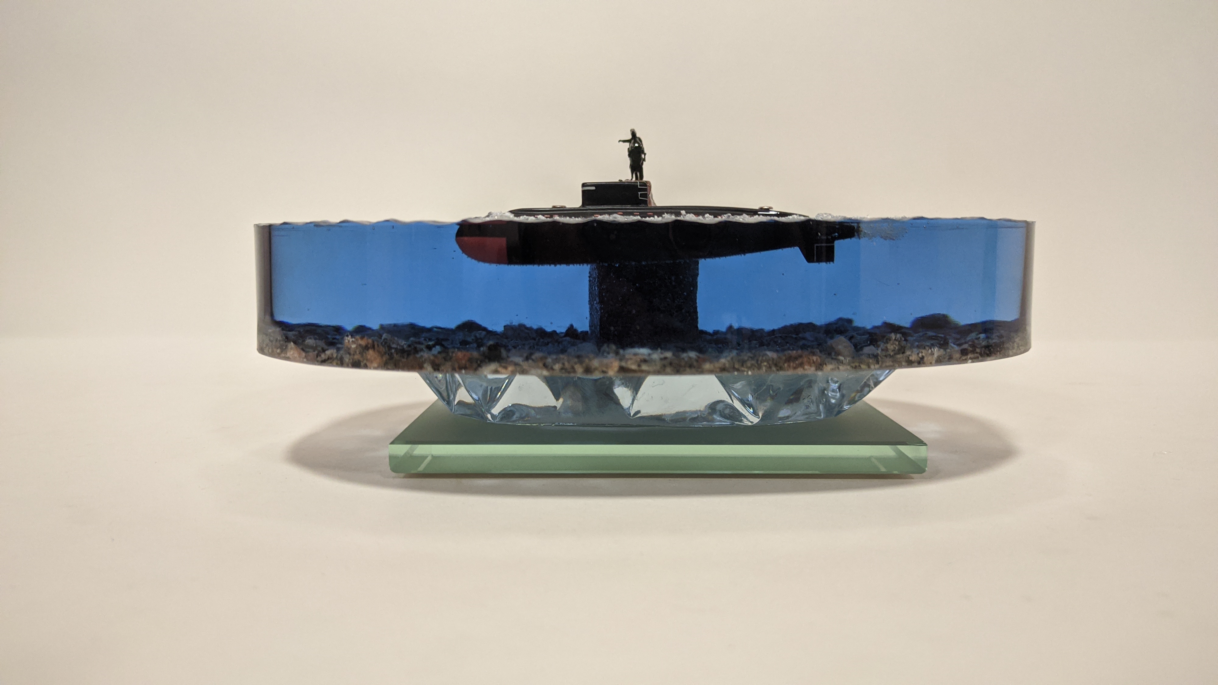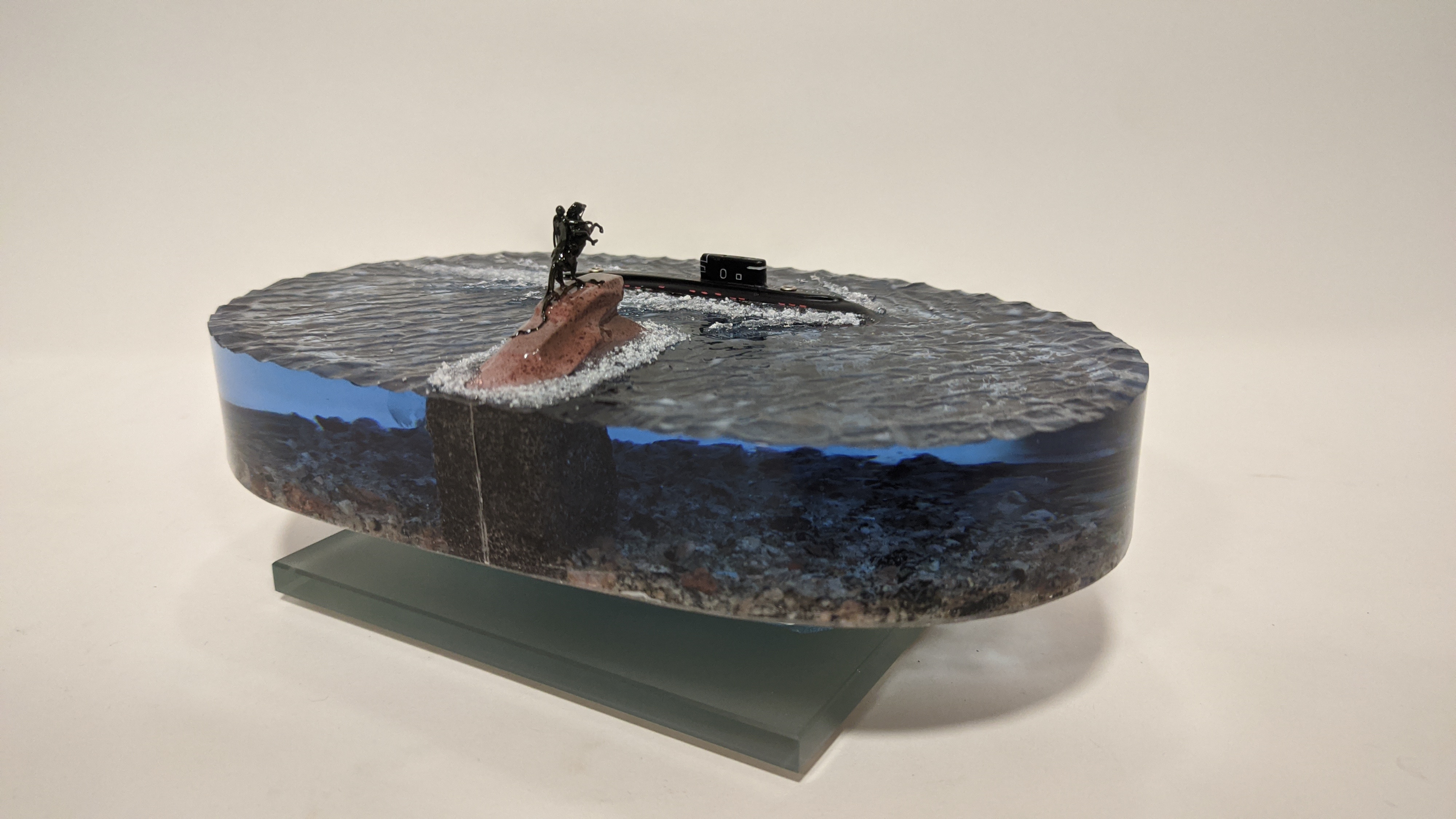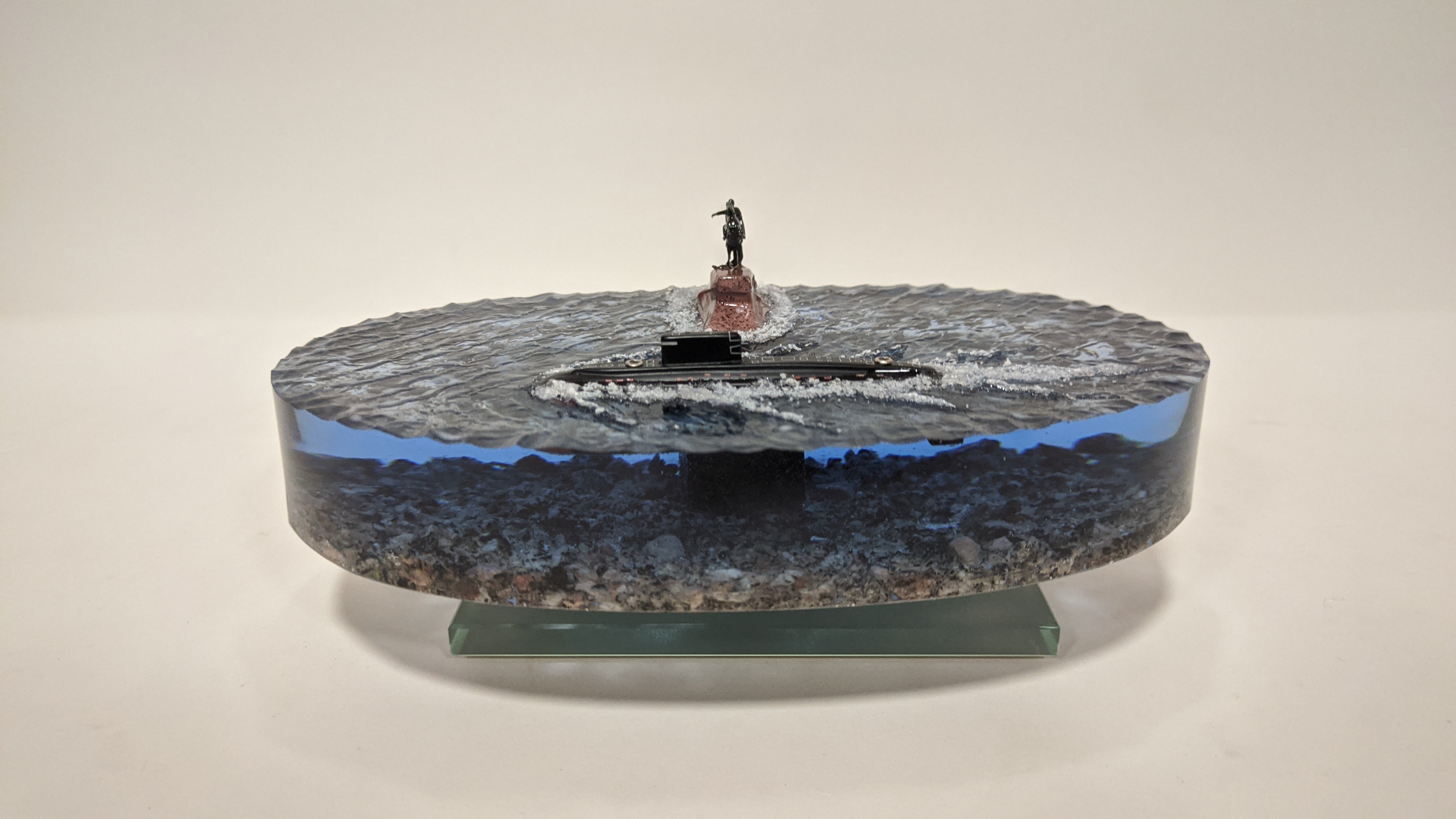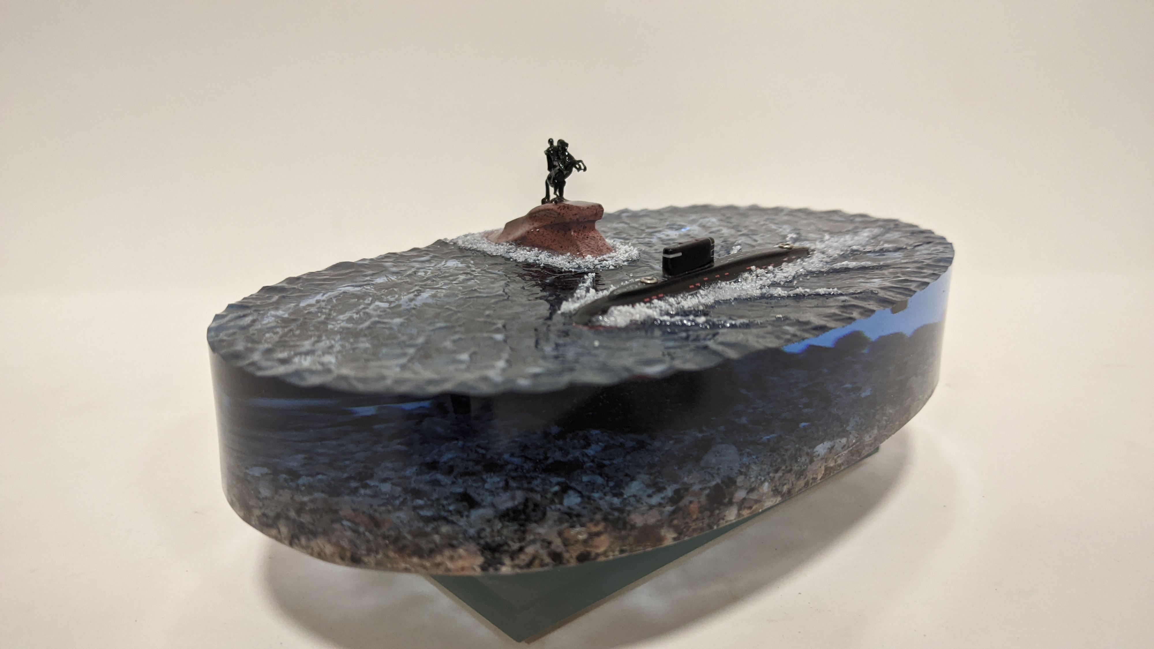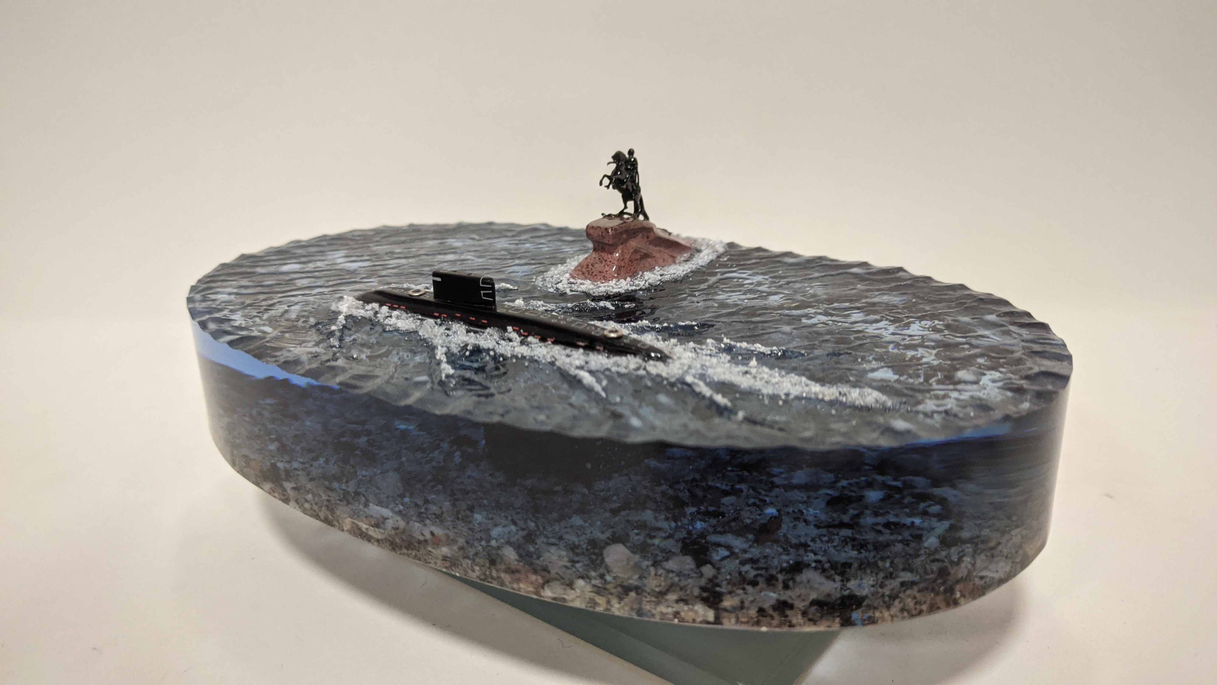 Подводная лодка 636,877 "Варшавянка", на фоне памятника "Медный всадник". Дно диорамы из натуральной гранитной крошки.
