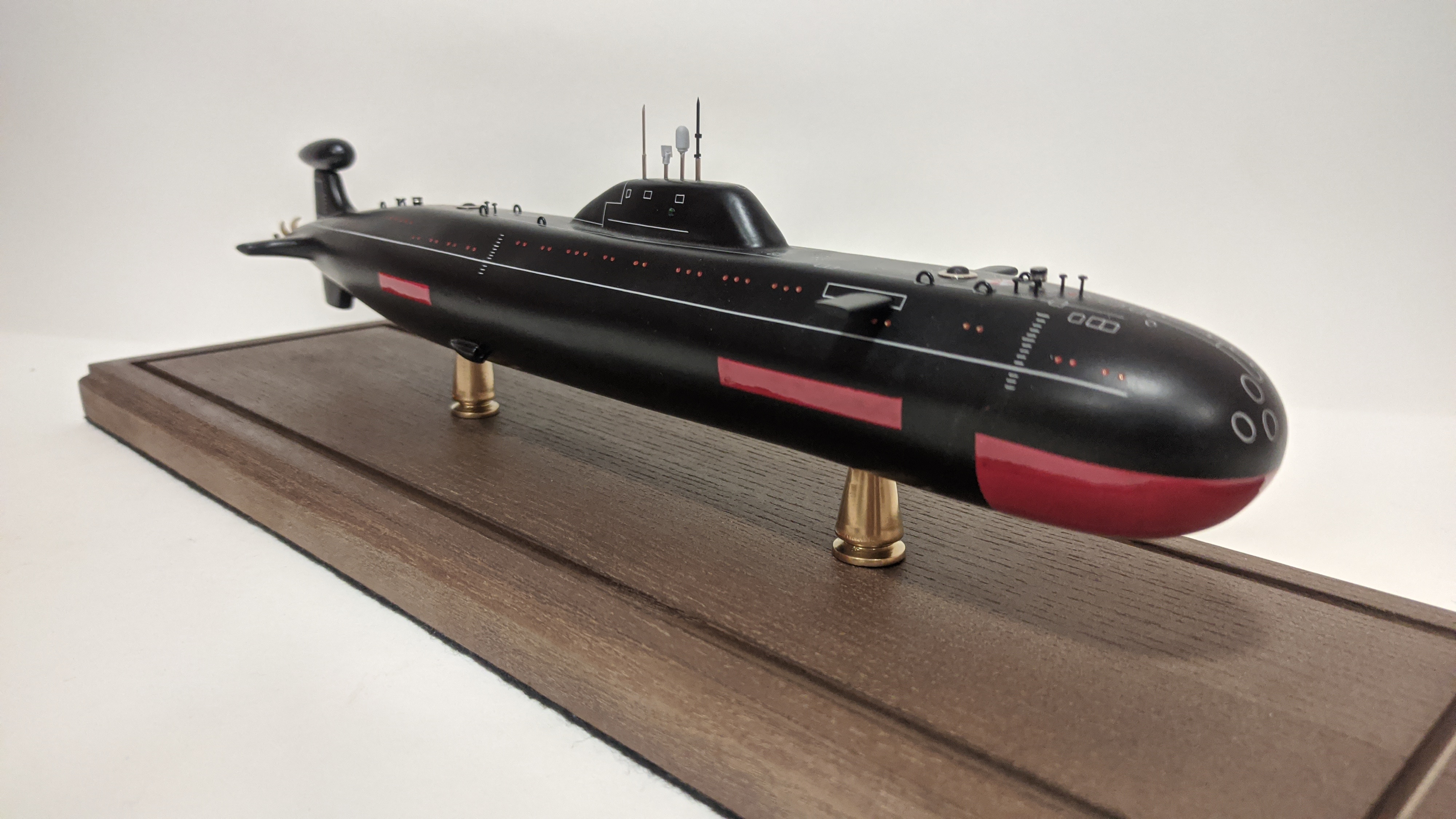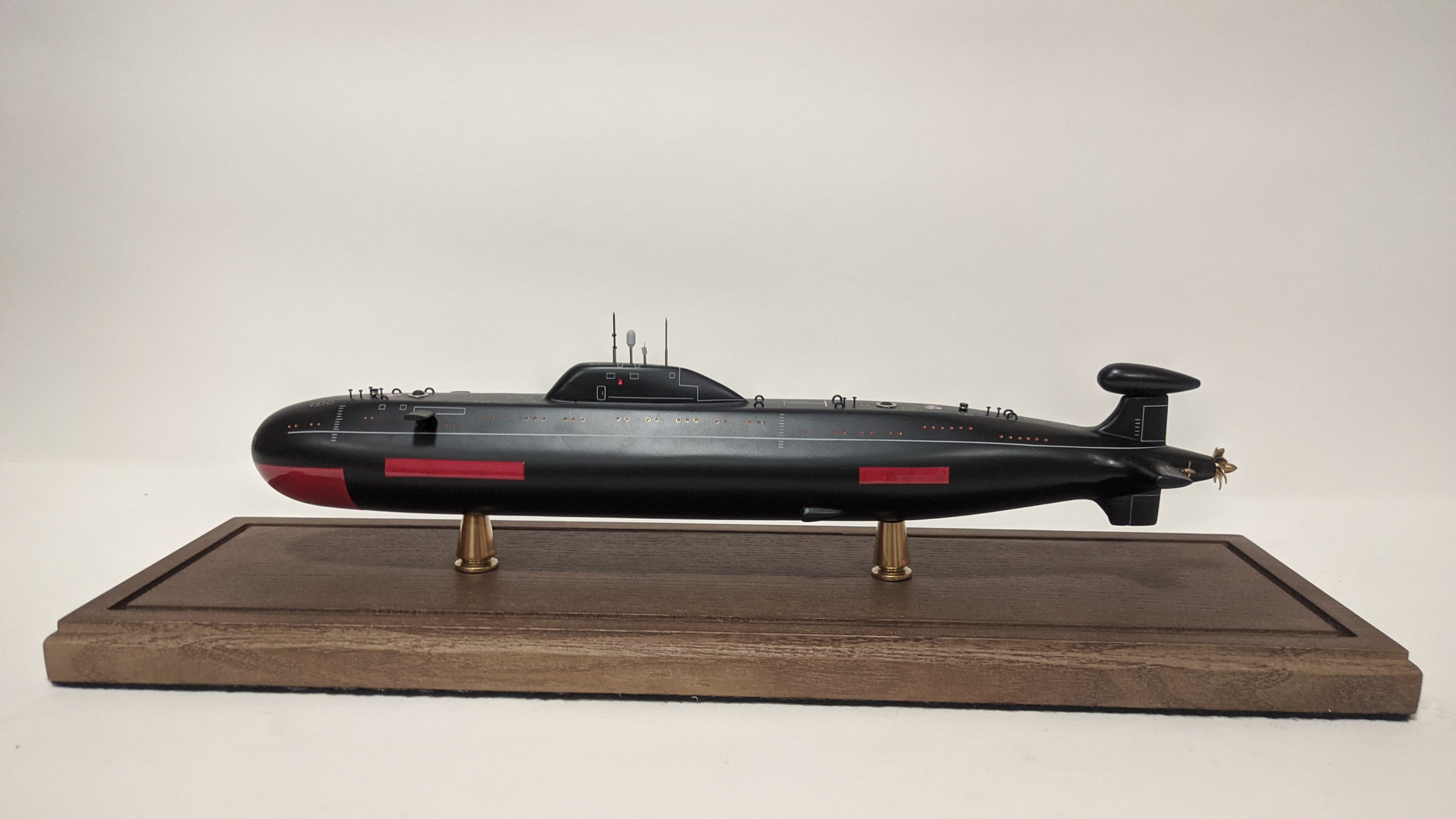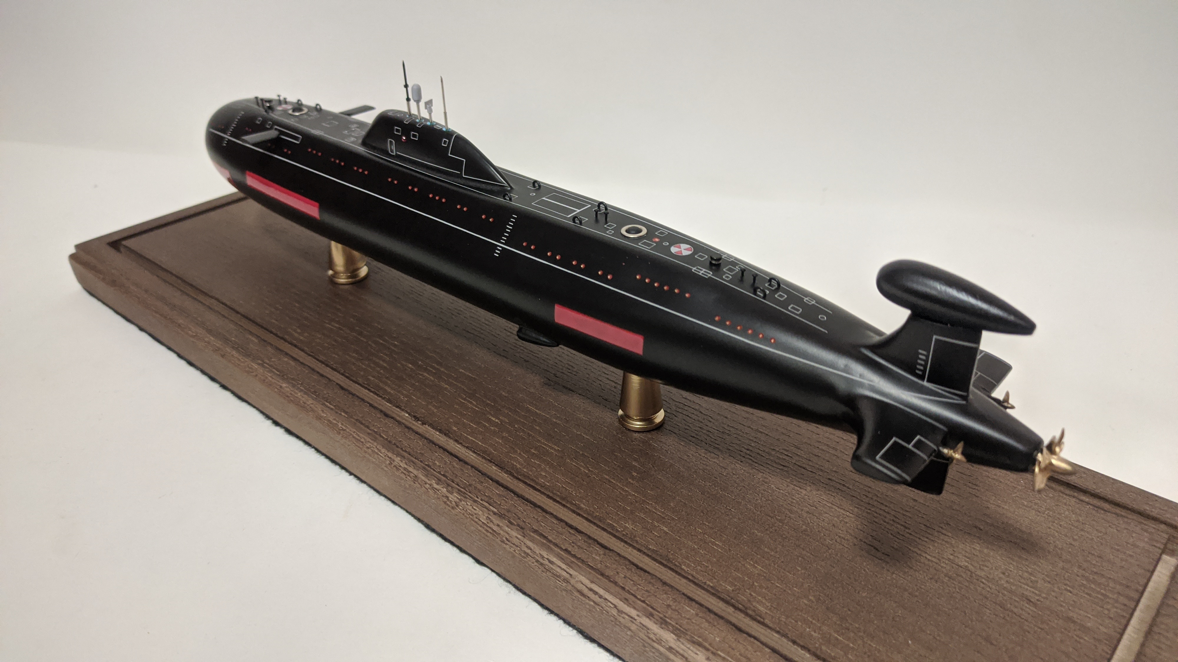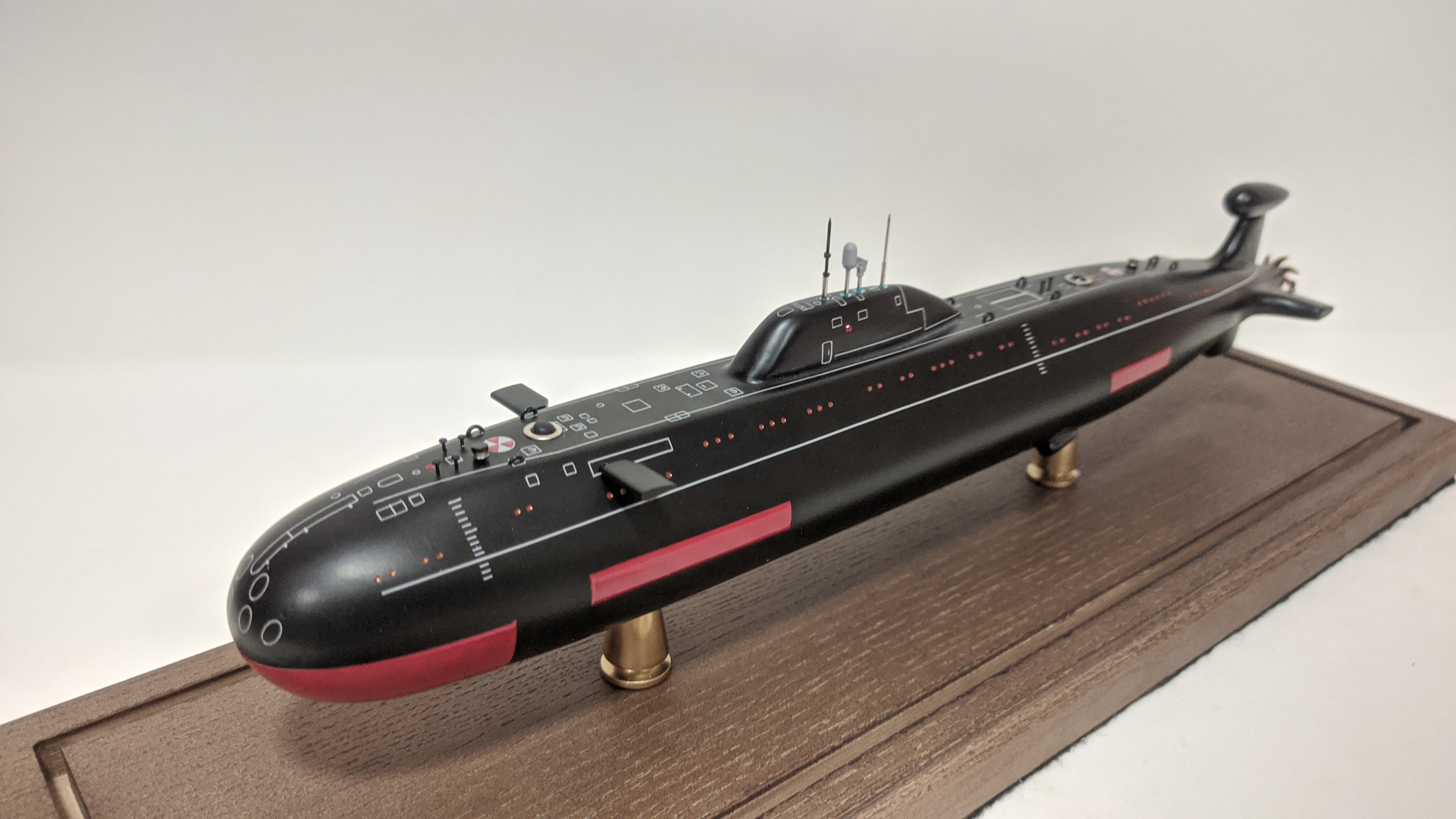 Модель имеет эксклюзивную стилистику при которой вся разметка выполнена по белому. Благодаря светлой разметке, на модели можно увидеть и показать всю сложность устройства ПЛ , люки, шлюзы, шахты , входные двери и прочее.
