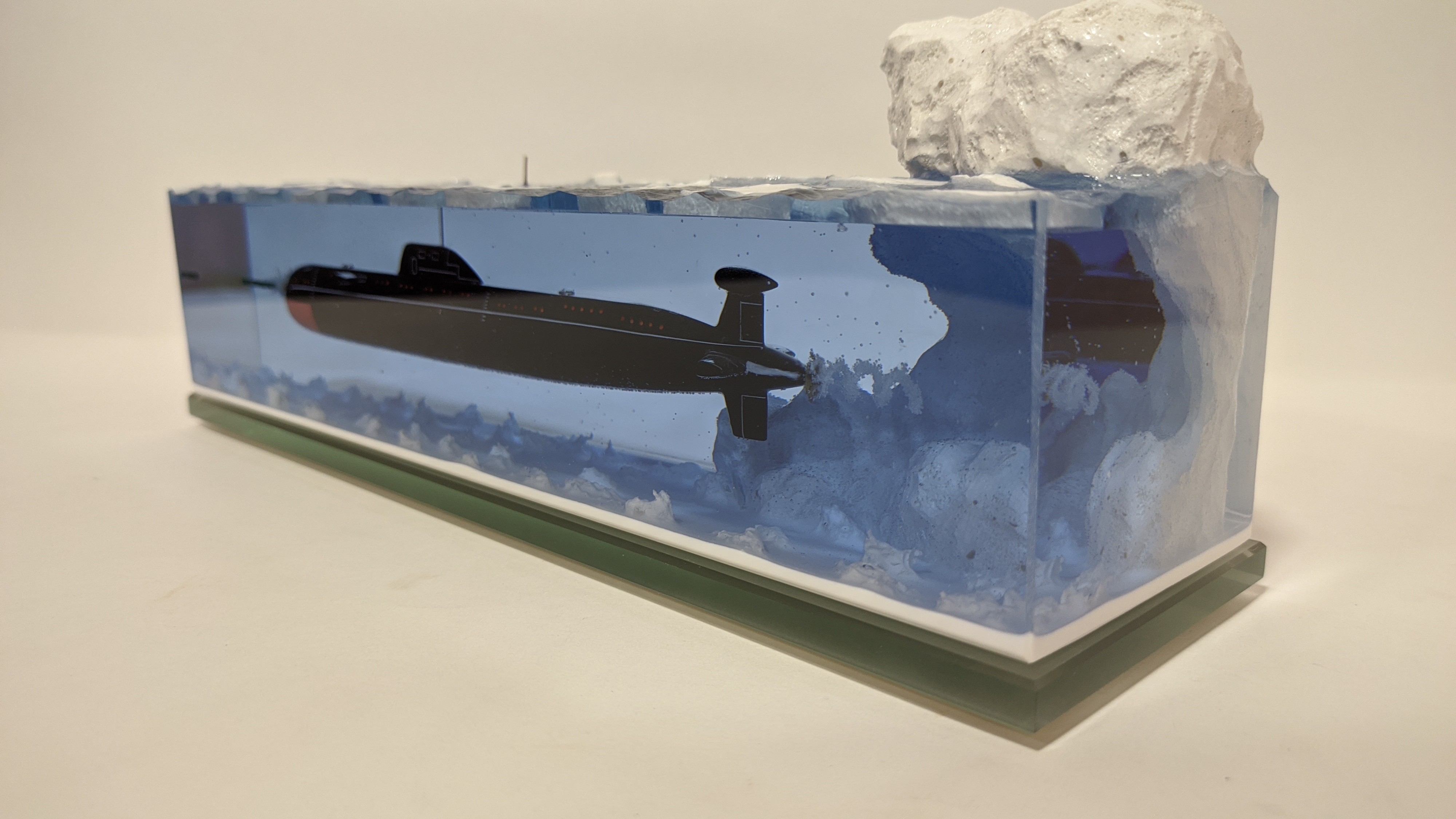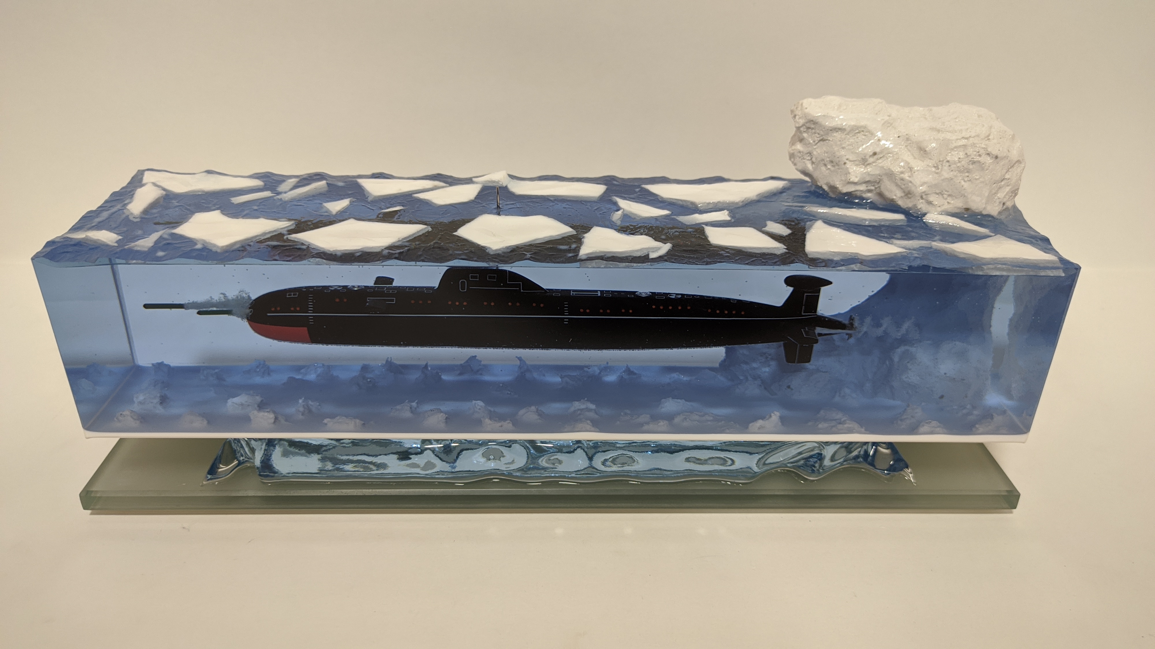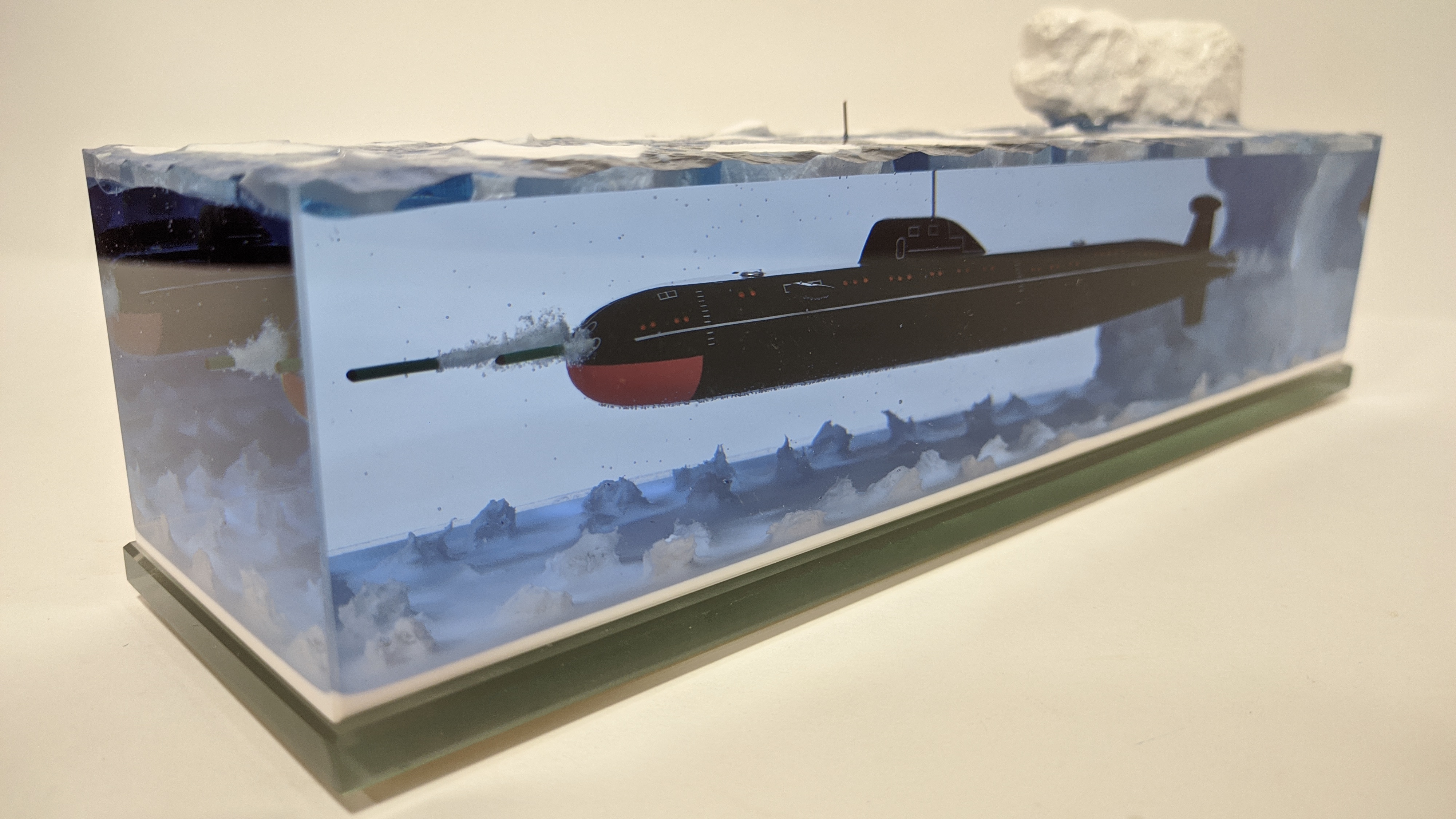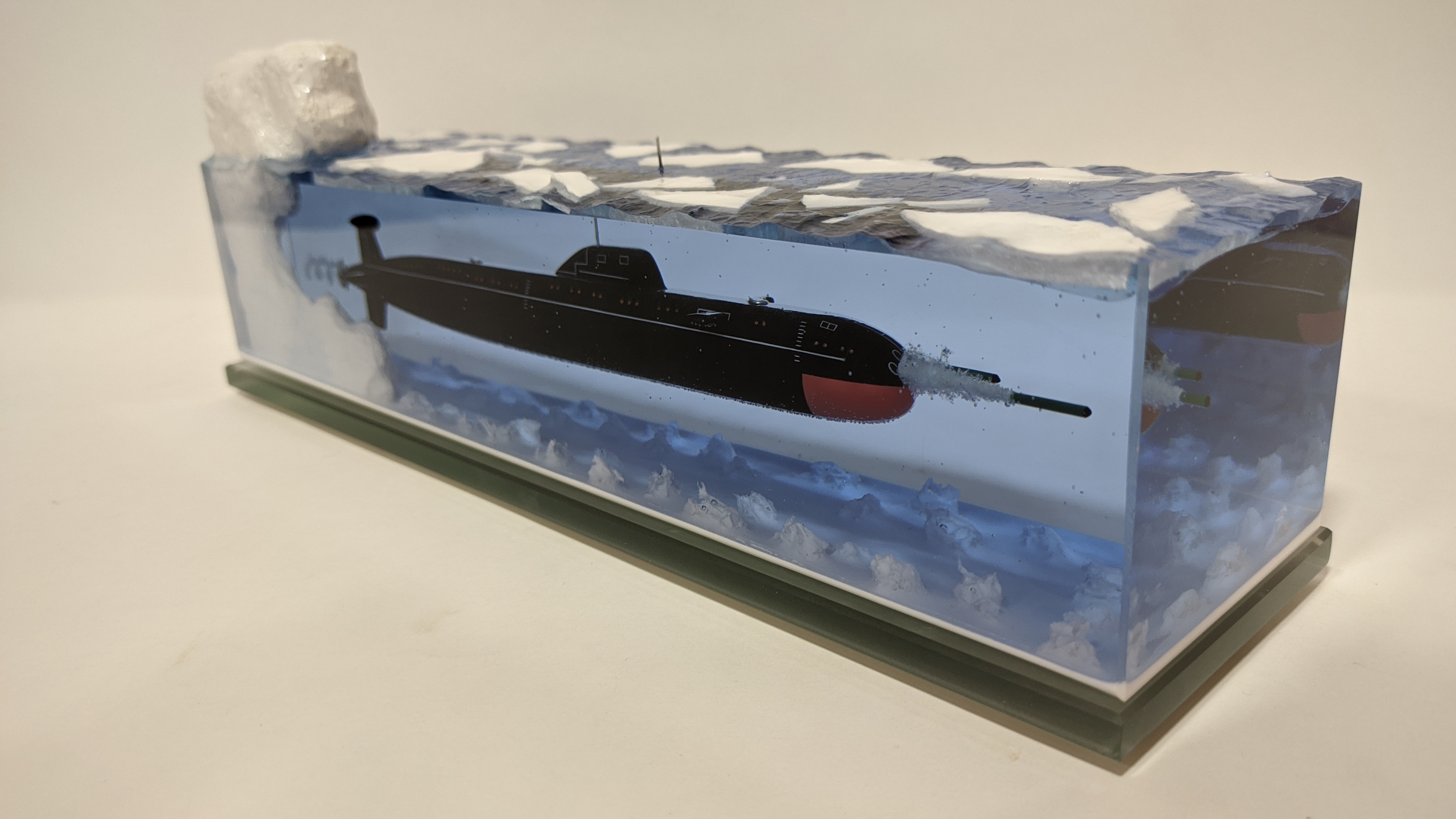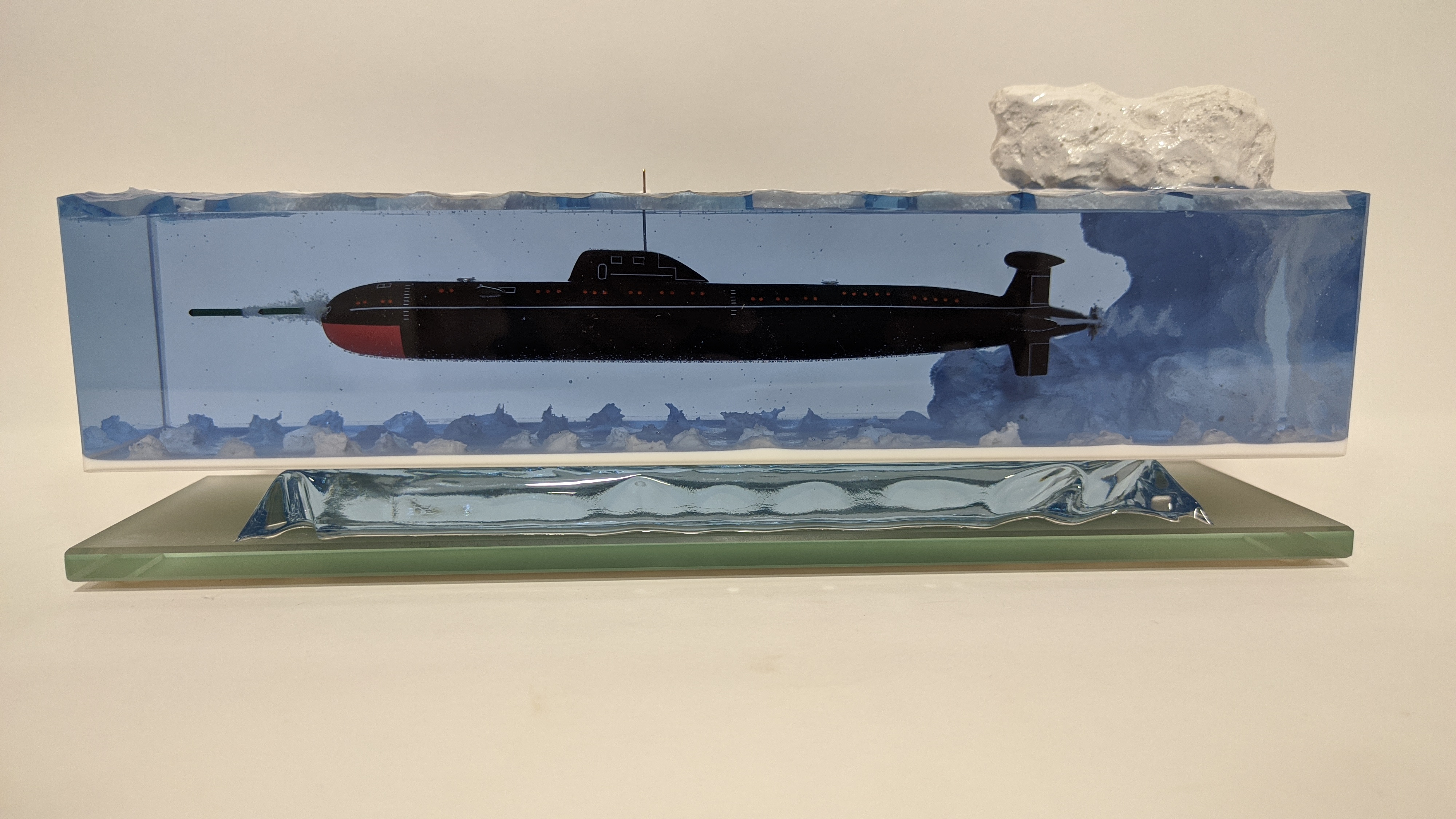 Модель подводной лодки проекта 671РТМ "Щука" с имитацией пуска торпеды. Подставка из стекла 8мм.