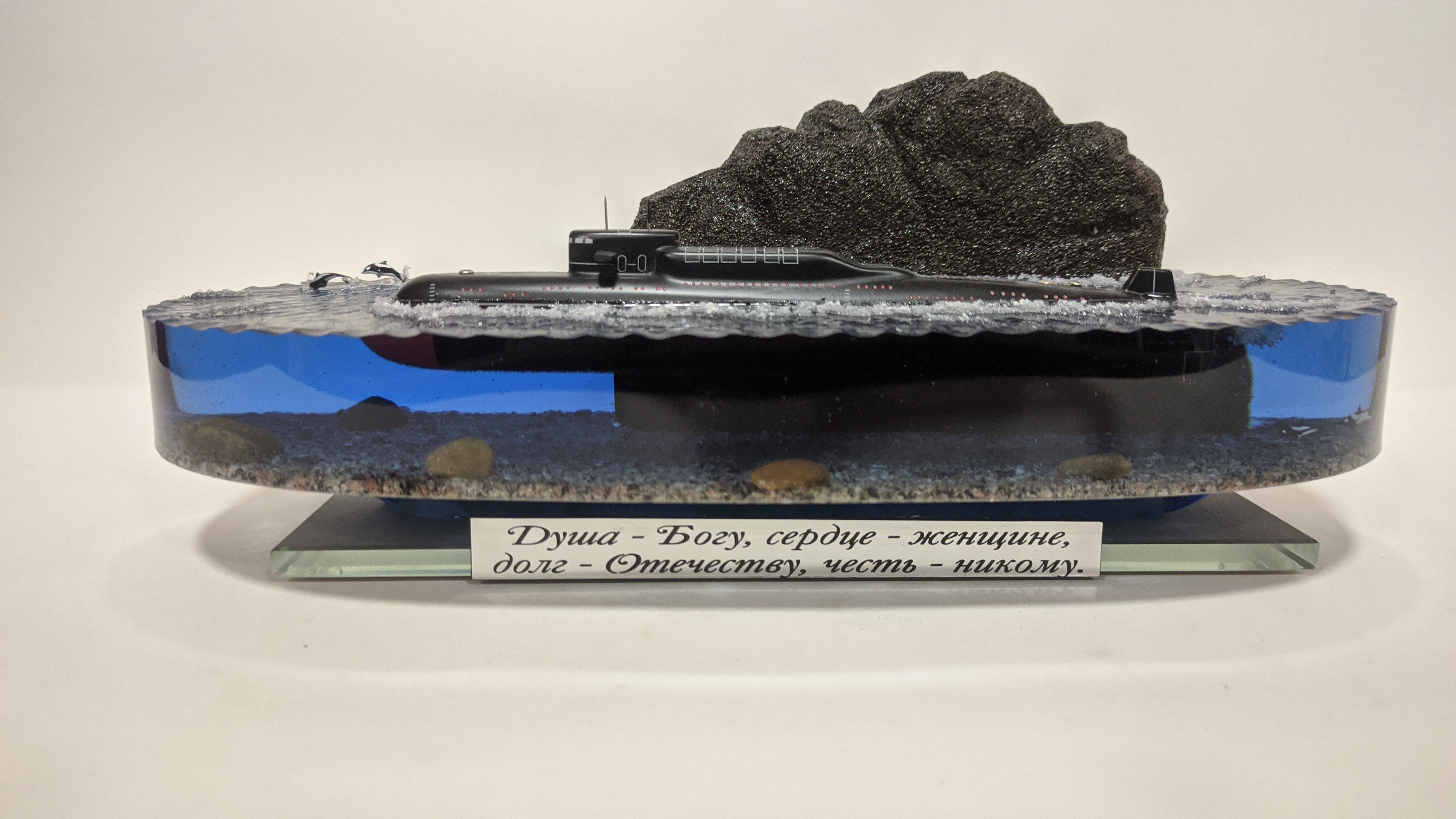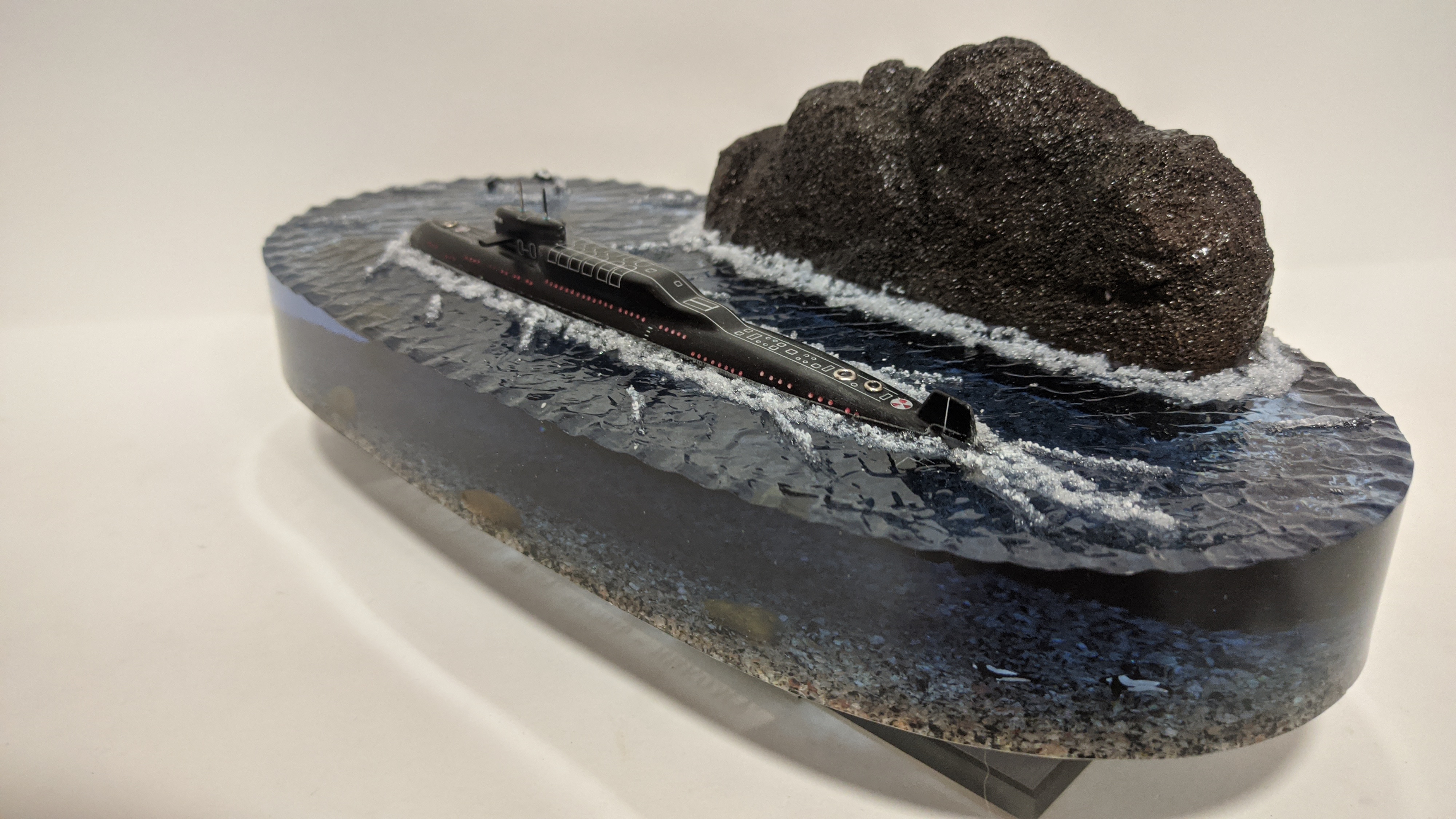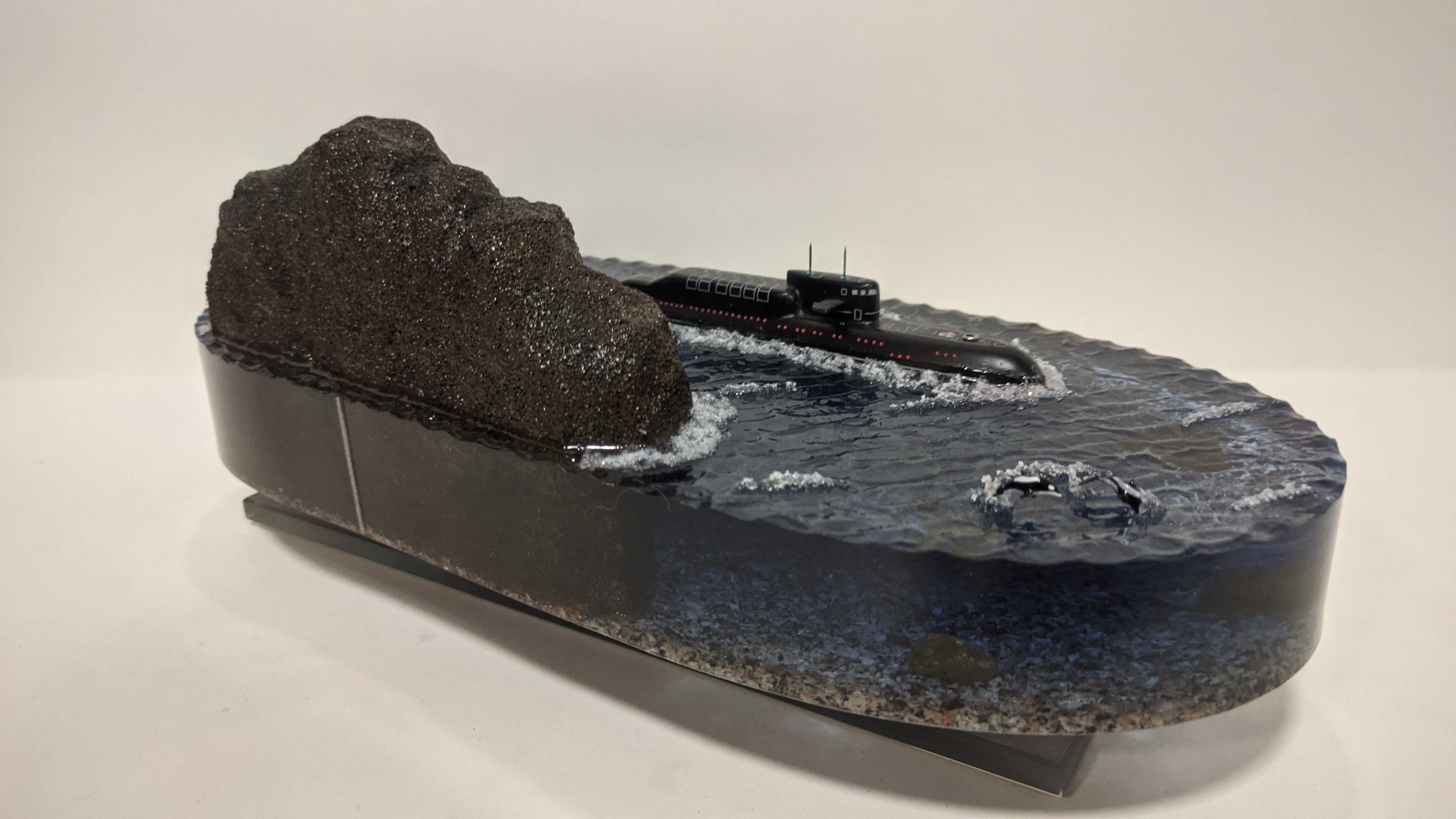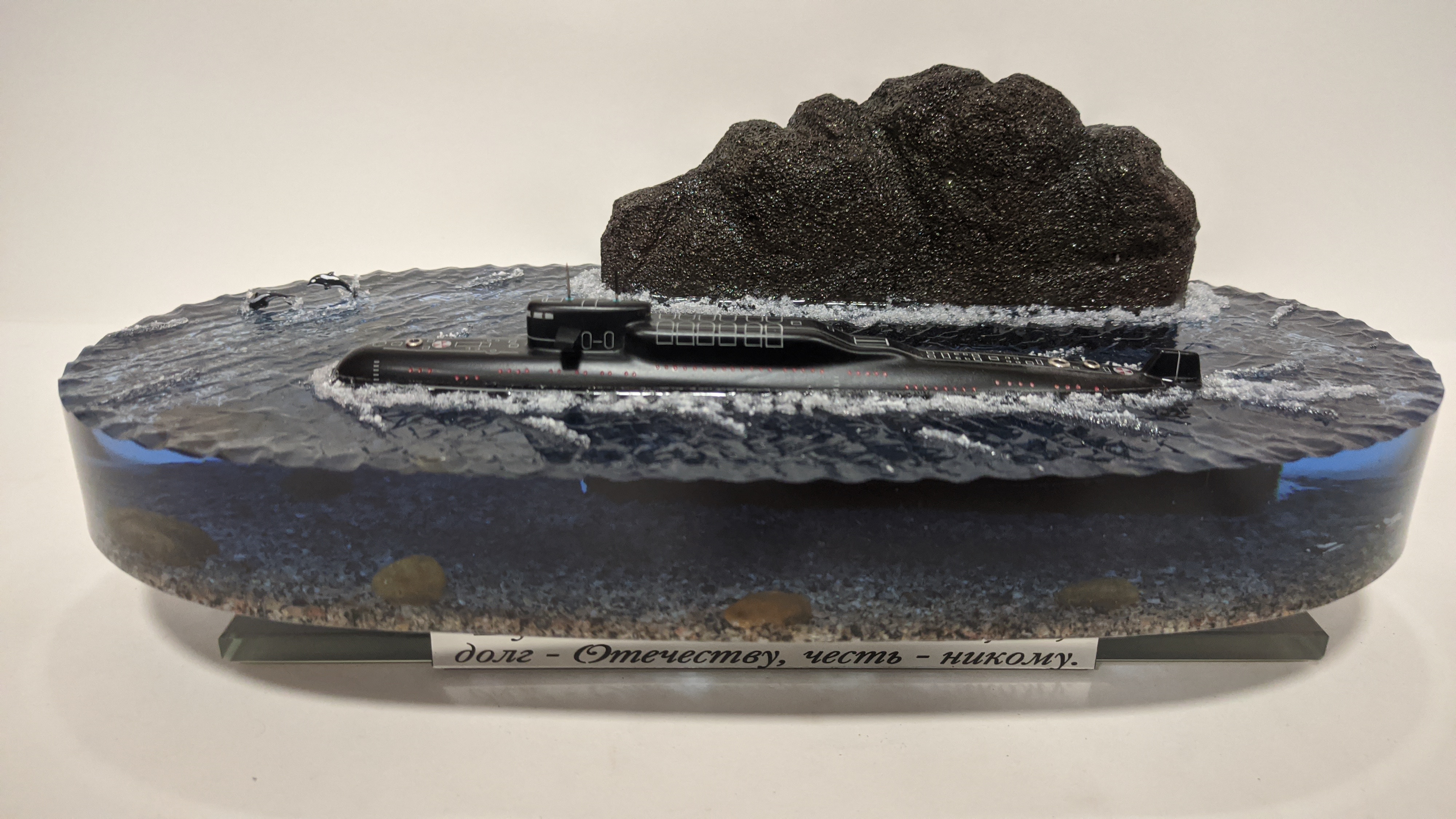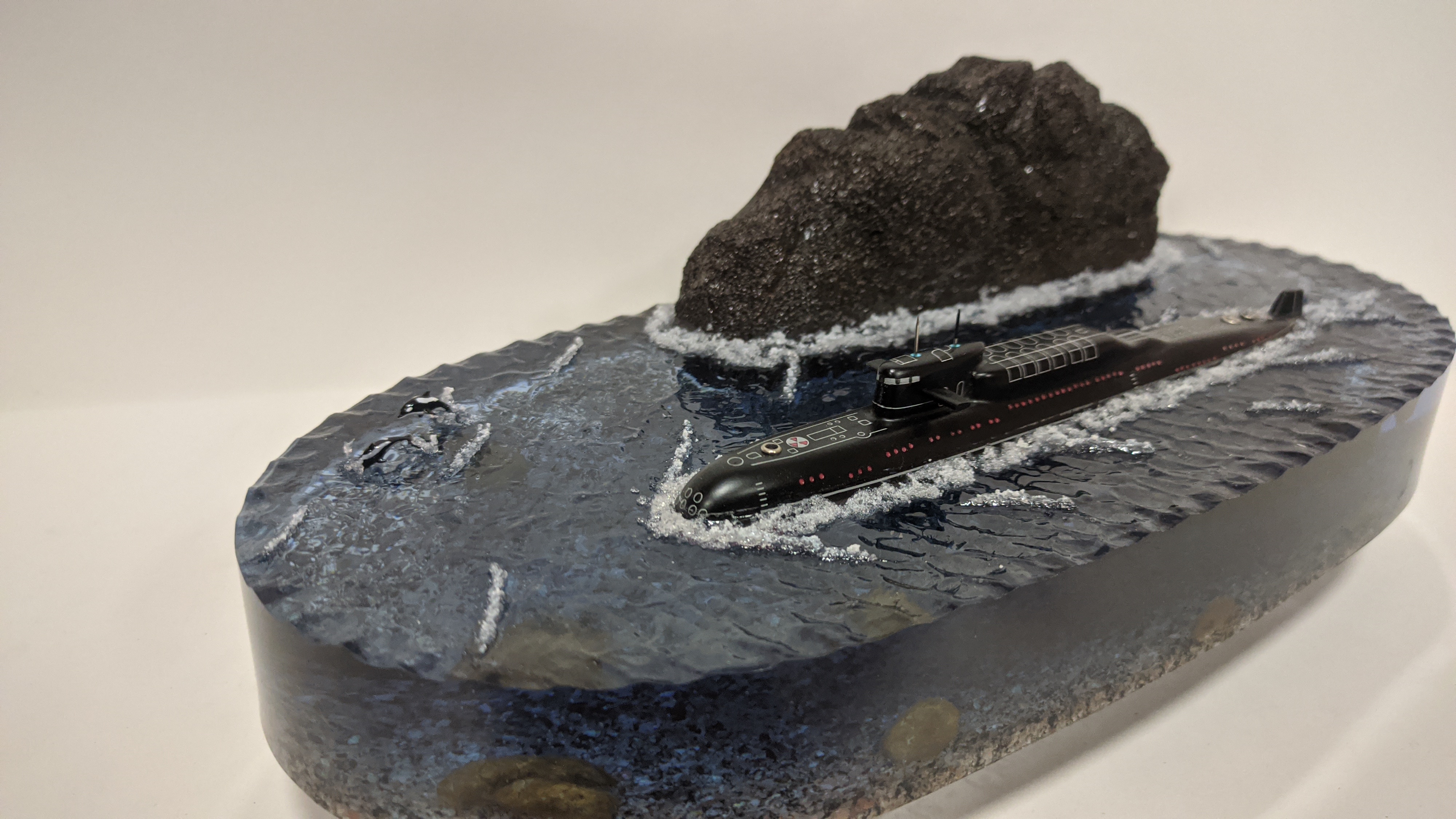 Высокая детализация моделей и разметки. Дно натуральная гранитная крошка. На диораме так же представлены касатки. Всё выполнено в масштабе для сравнения размеров лодки с животными.