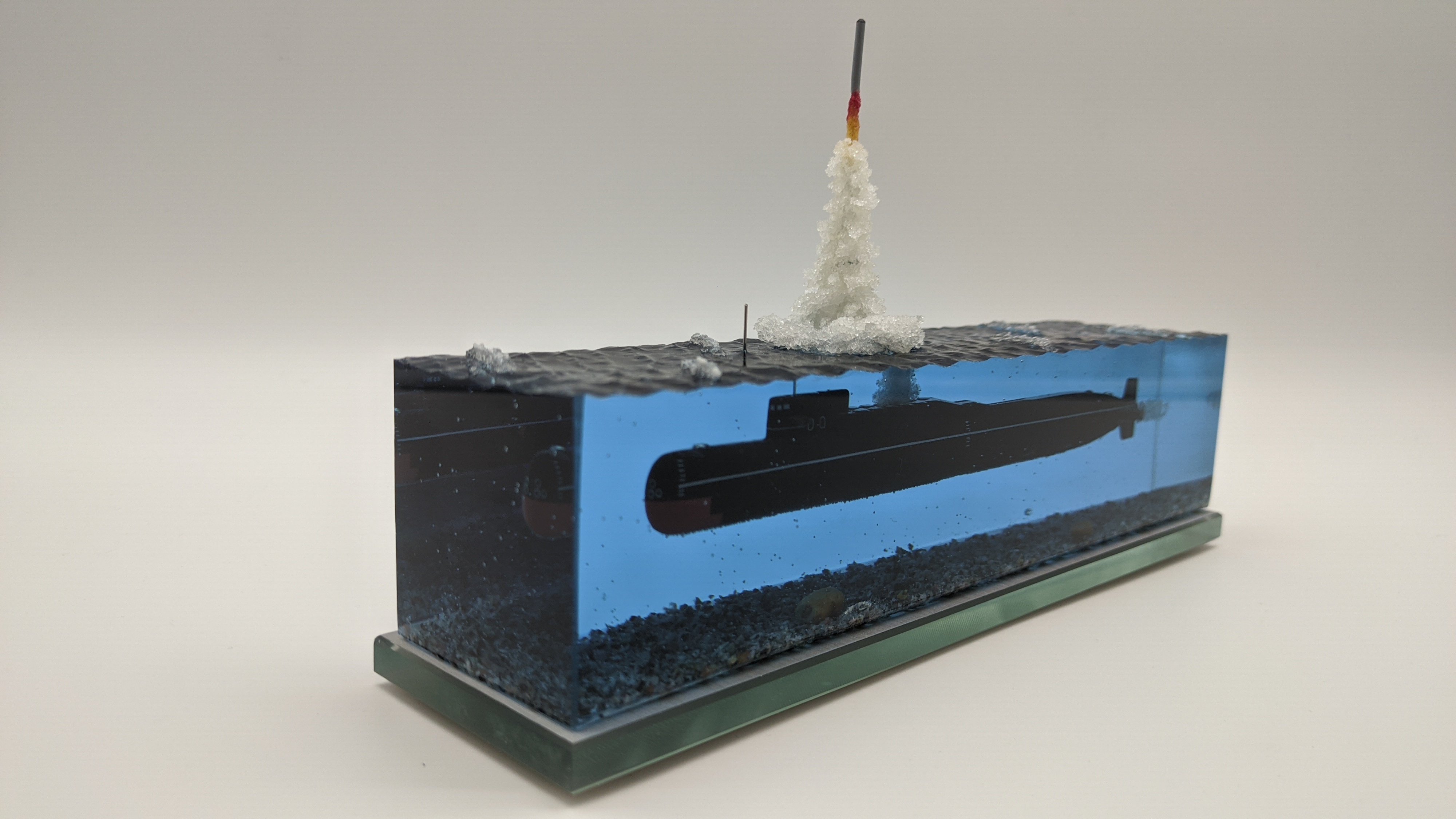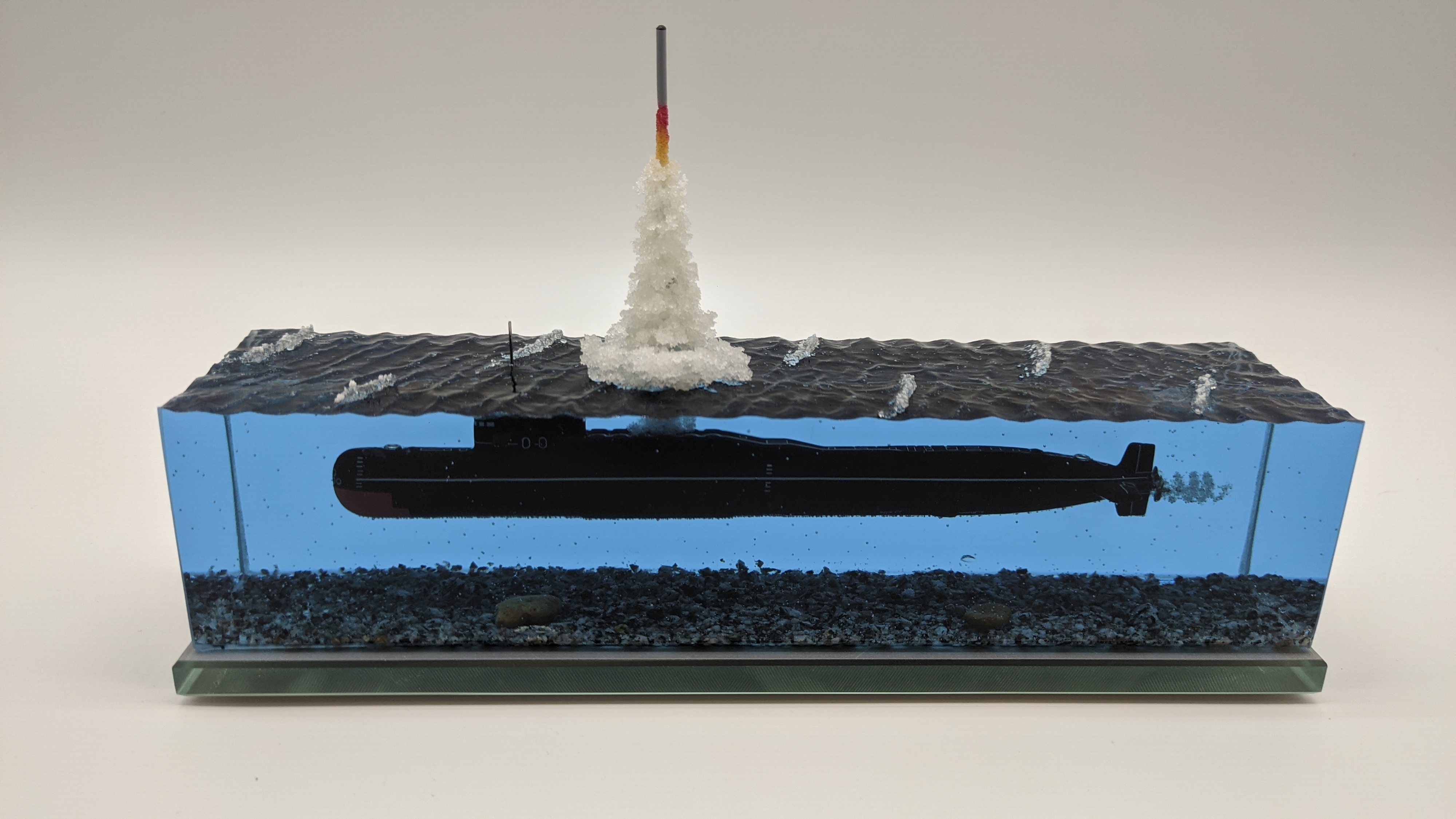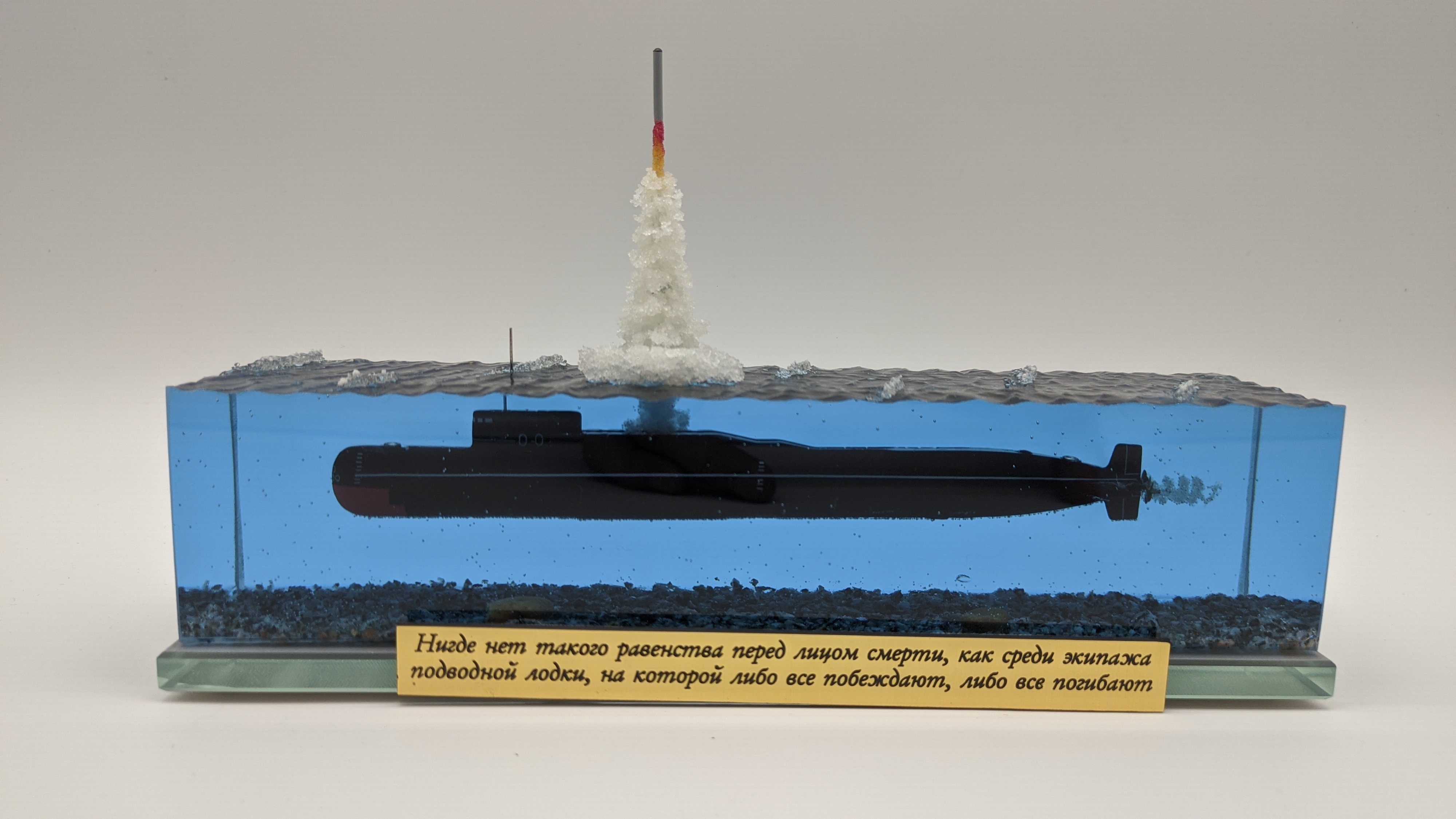 Модель подводной лодки проект 667Б "Мурена". Модель имеет эксклюзивную стилистику при которой вся разметка выполнена по белому. Благодаря светлой разметке, на модели можно увидеть и показать всю сложность устройства ПЛ, люки, шлюзы, шахты, входные двери и прочее.