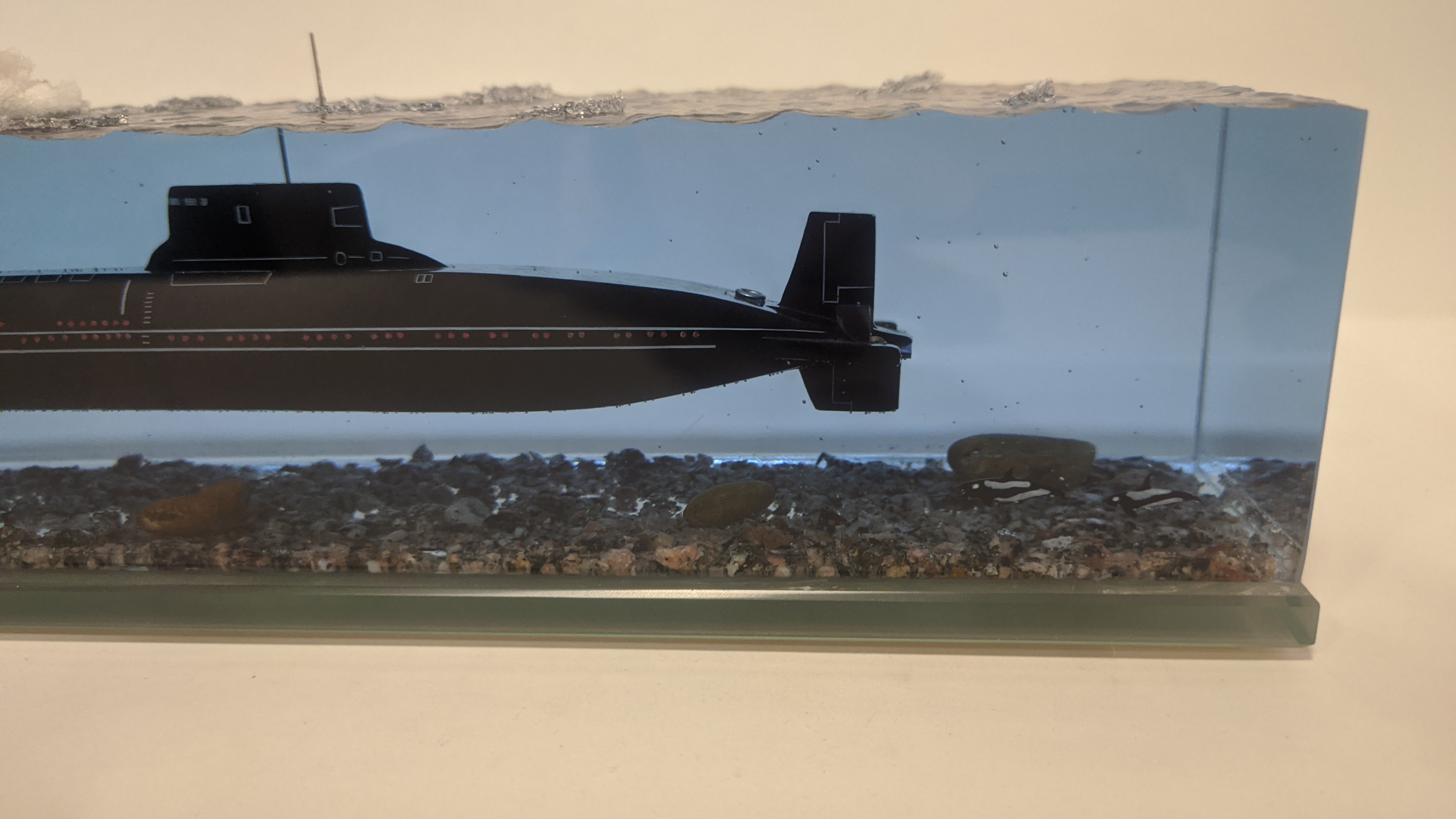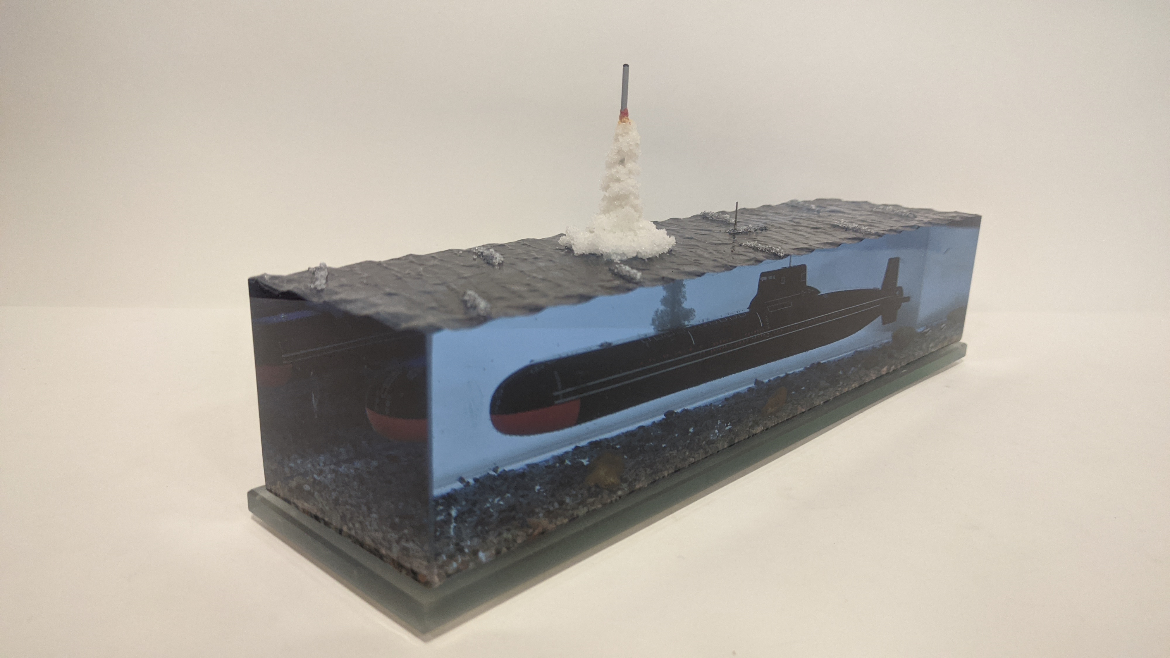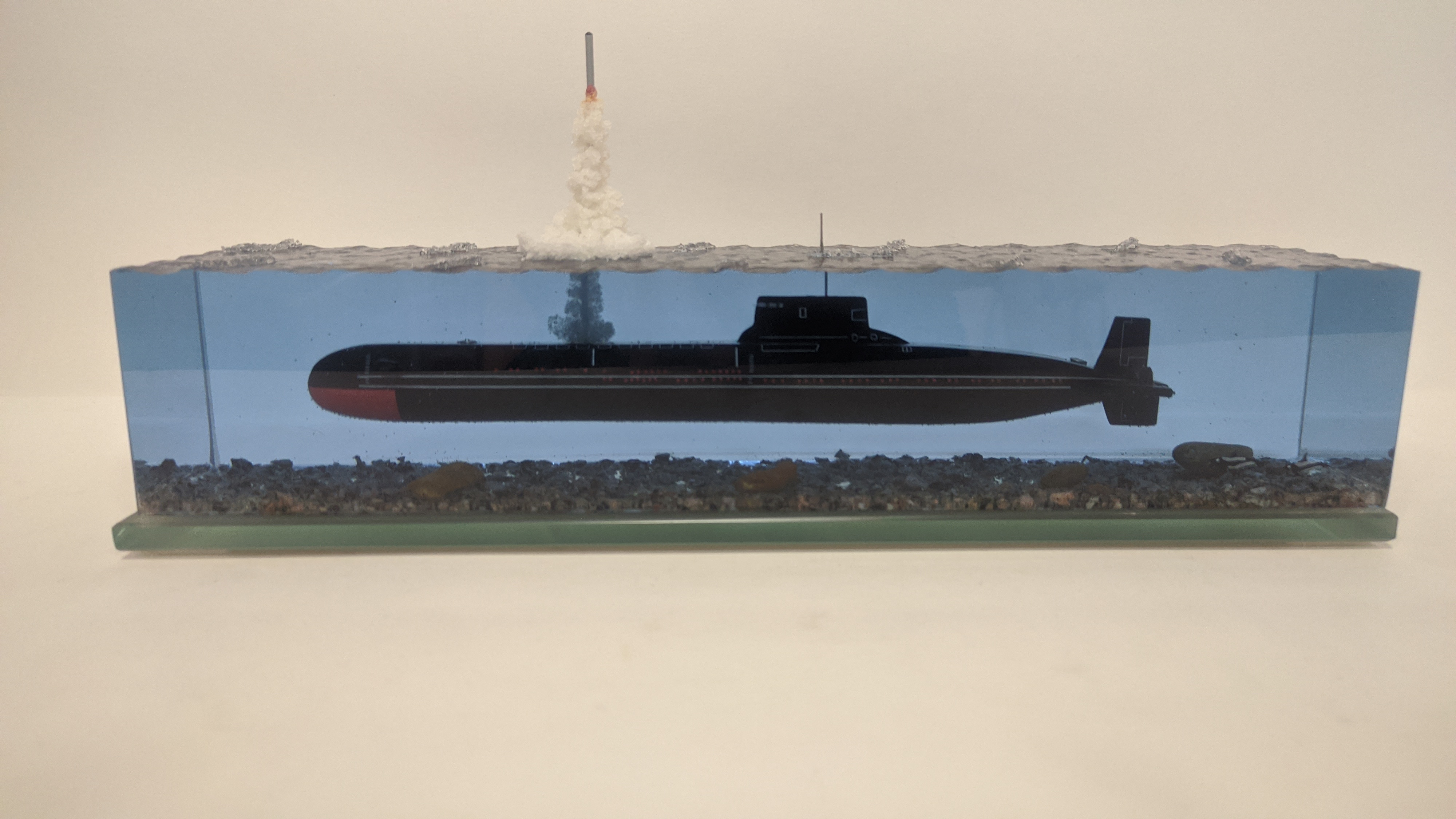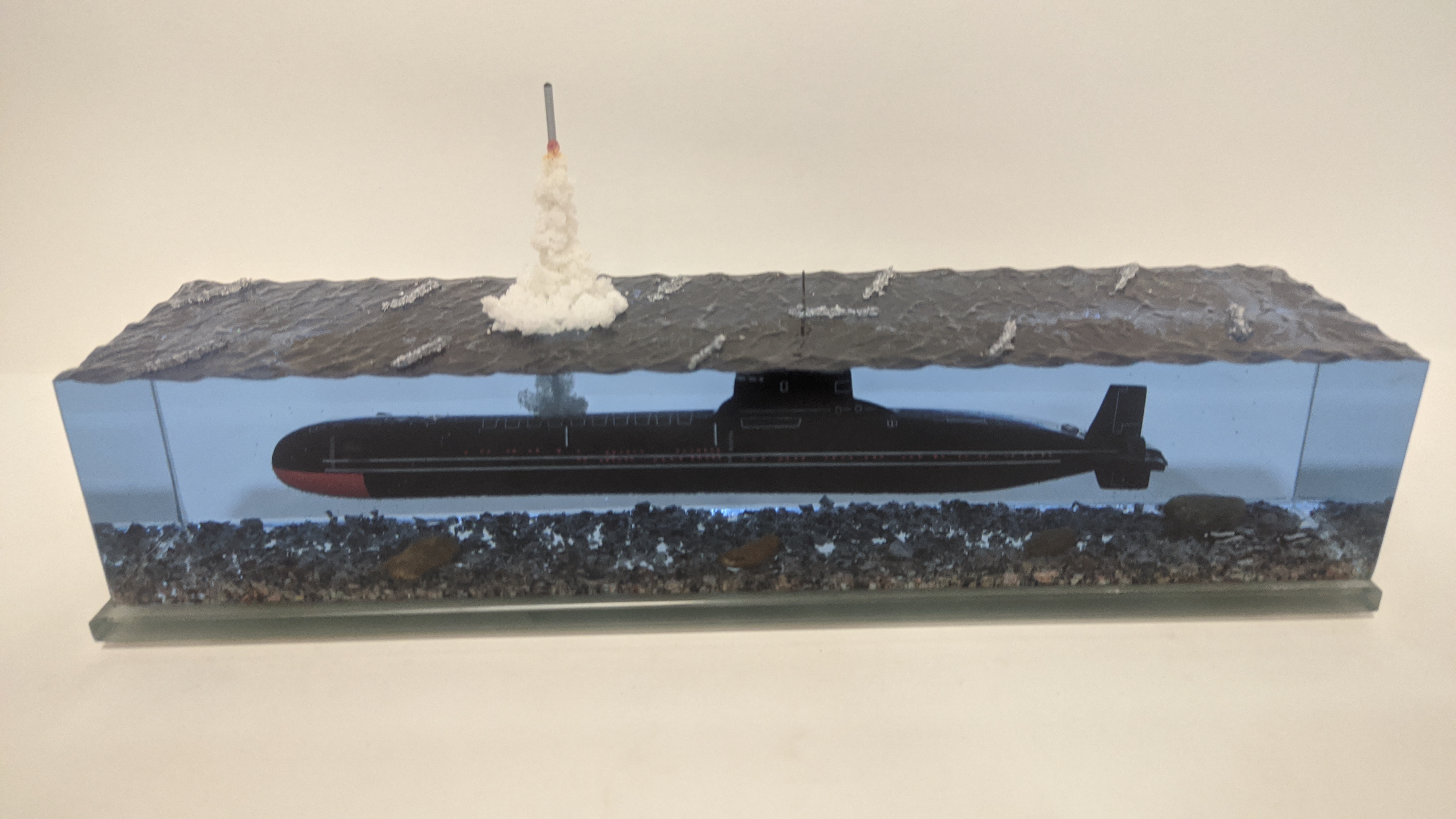 Модель АПЛ проект 941 "Акула" с имитацией пуска БР "Булава". Подставка стекло 8 мм.