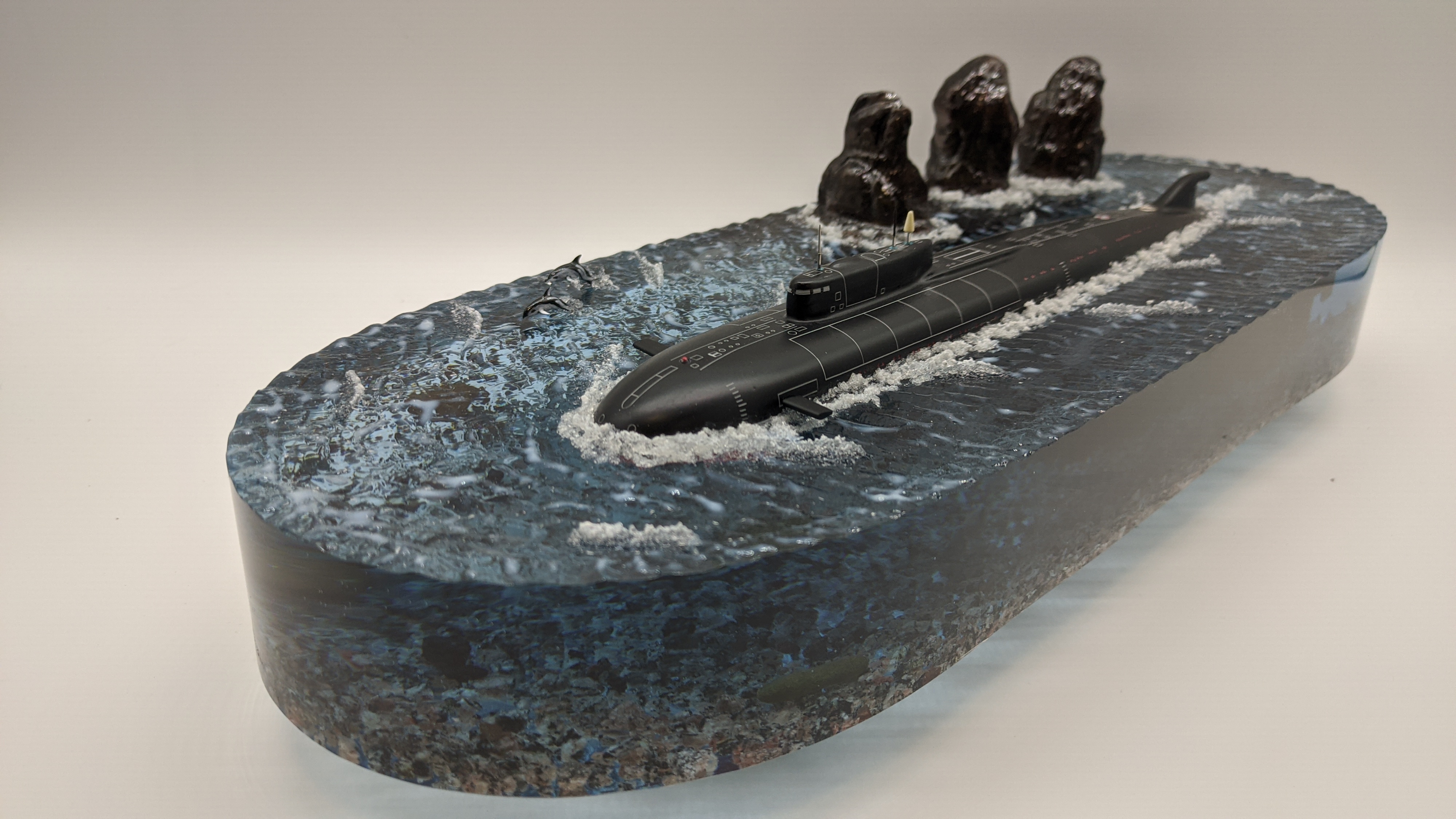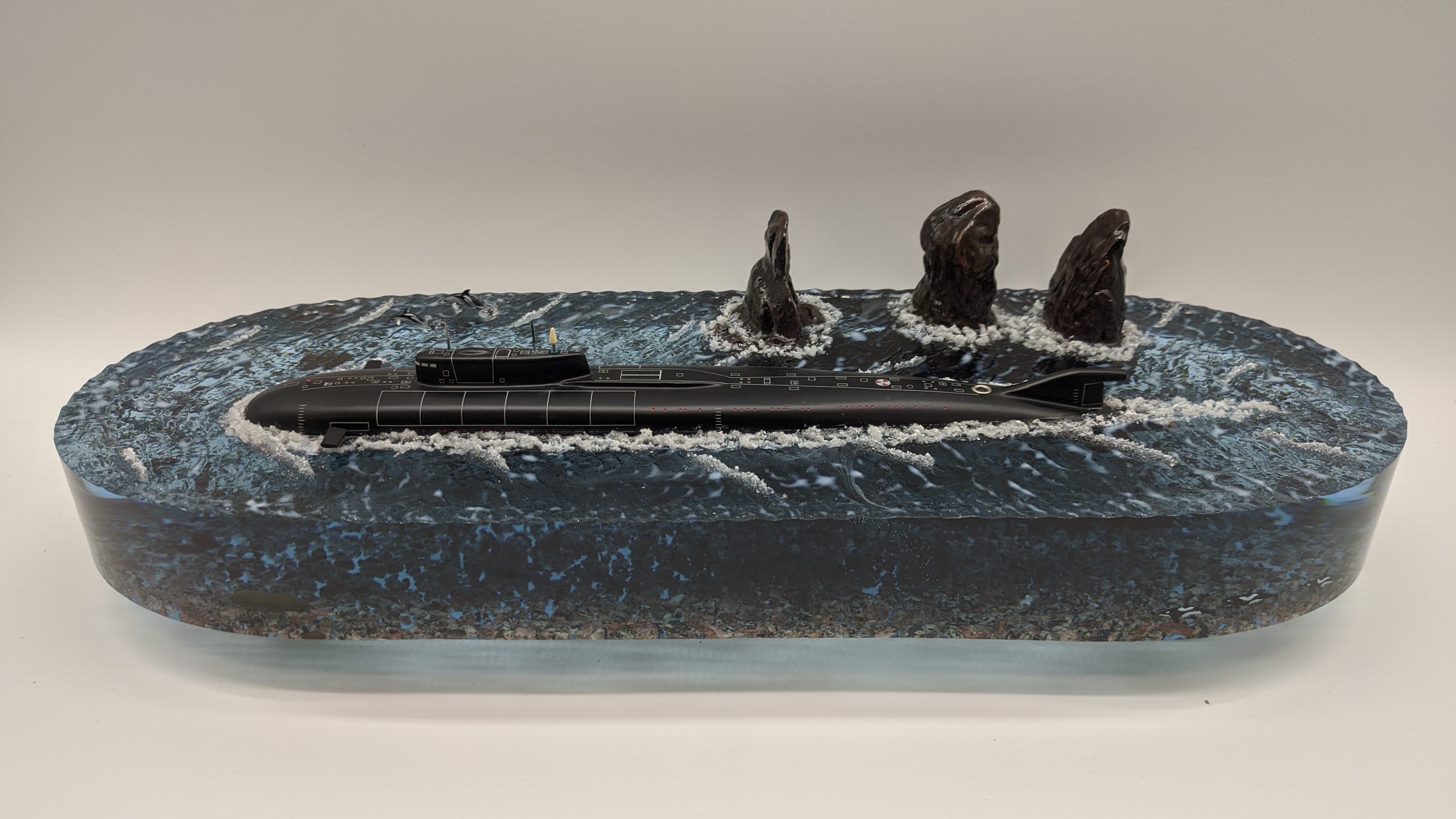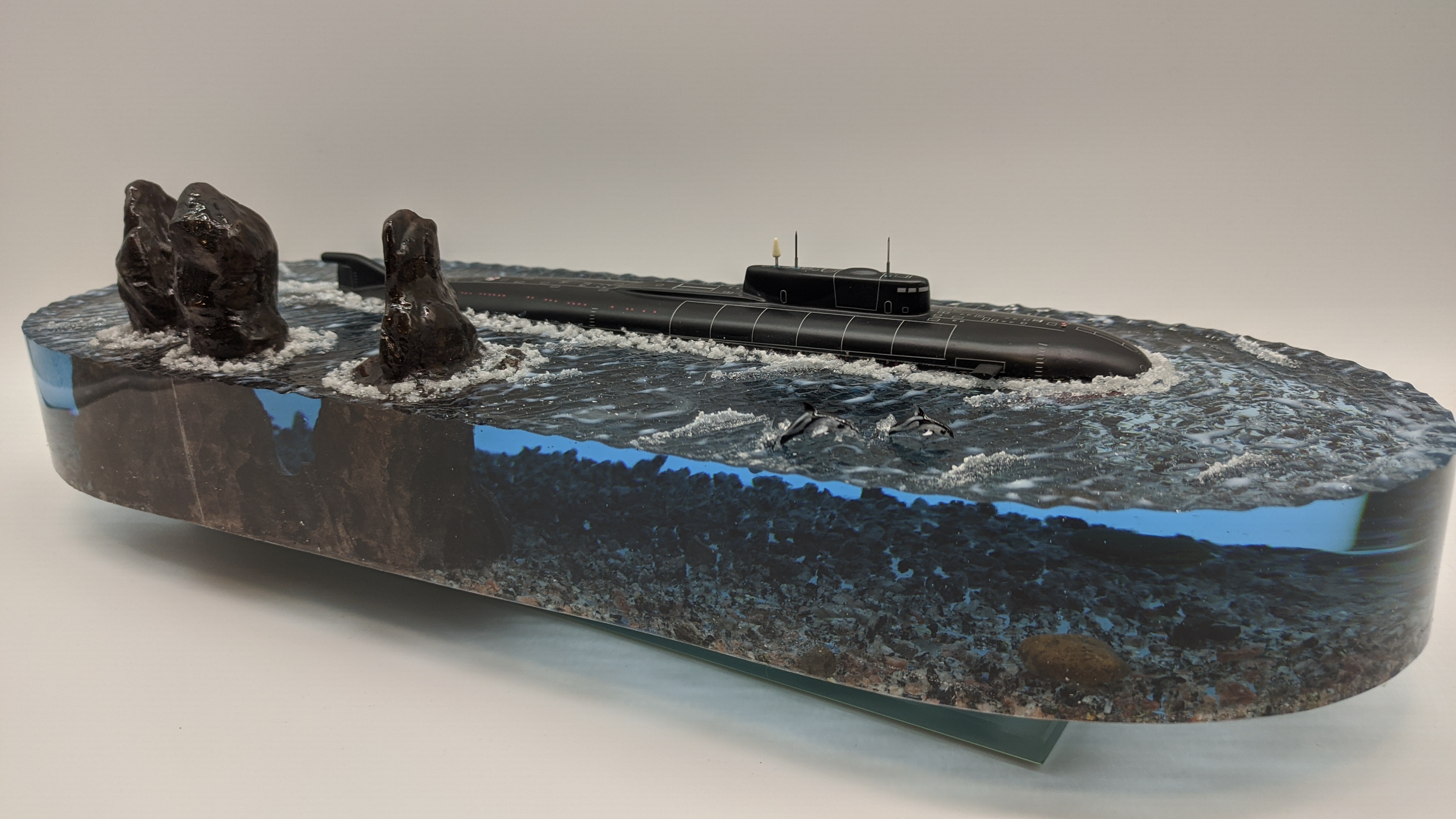Модель Подводной лодки 949А "Антей" на фоне скал "Три брата" Авачинская бухта ТОФ. Высокая детализация моделей и разметки. Дно натуральная гранитная крошка. На диораме так же представлены касатки и дельфины. Всё выполнено в масштабе для сравнения размеров лодки с животными..