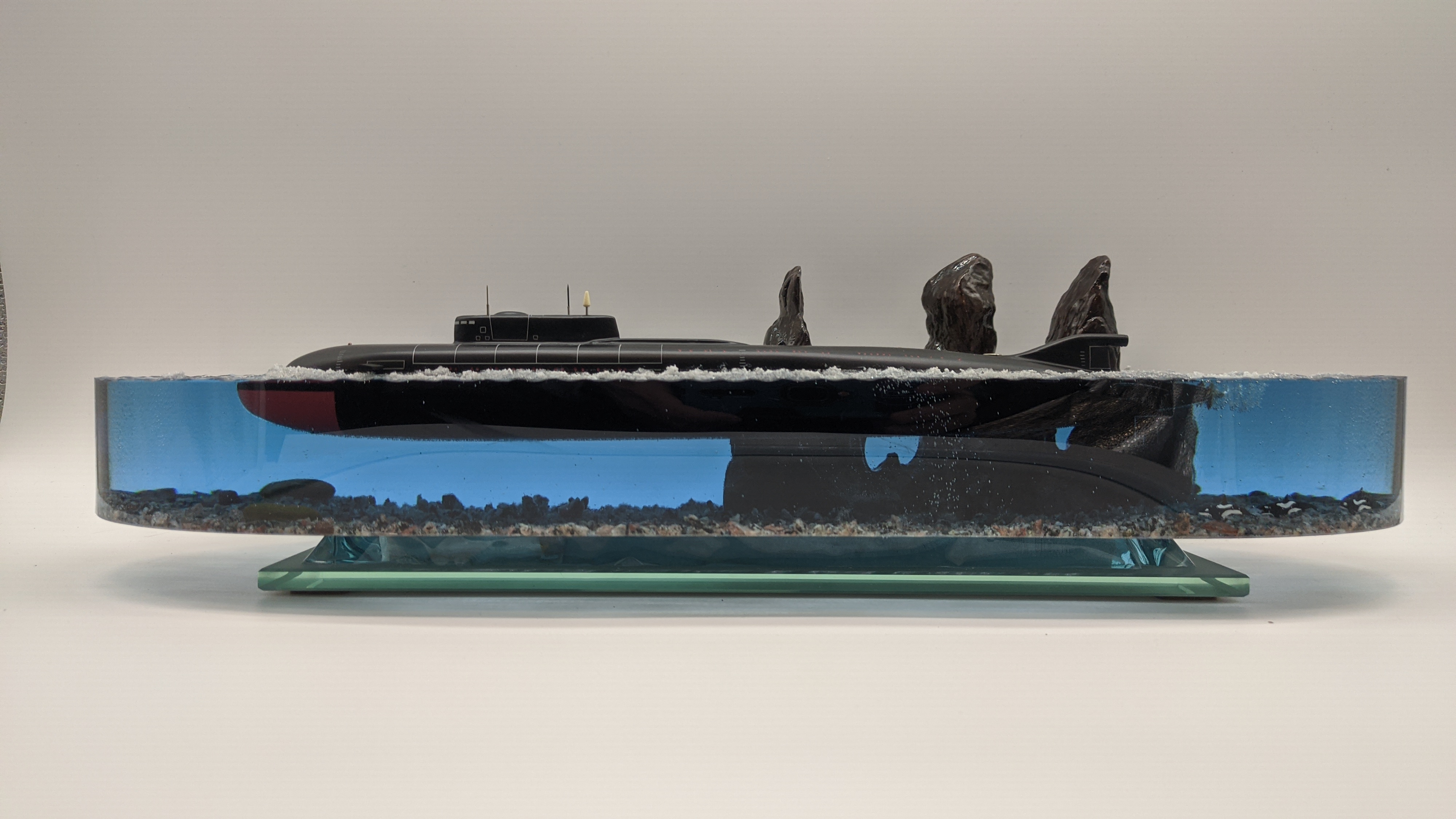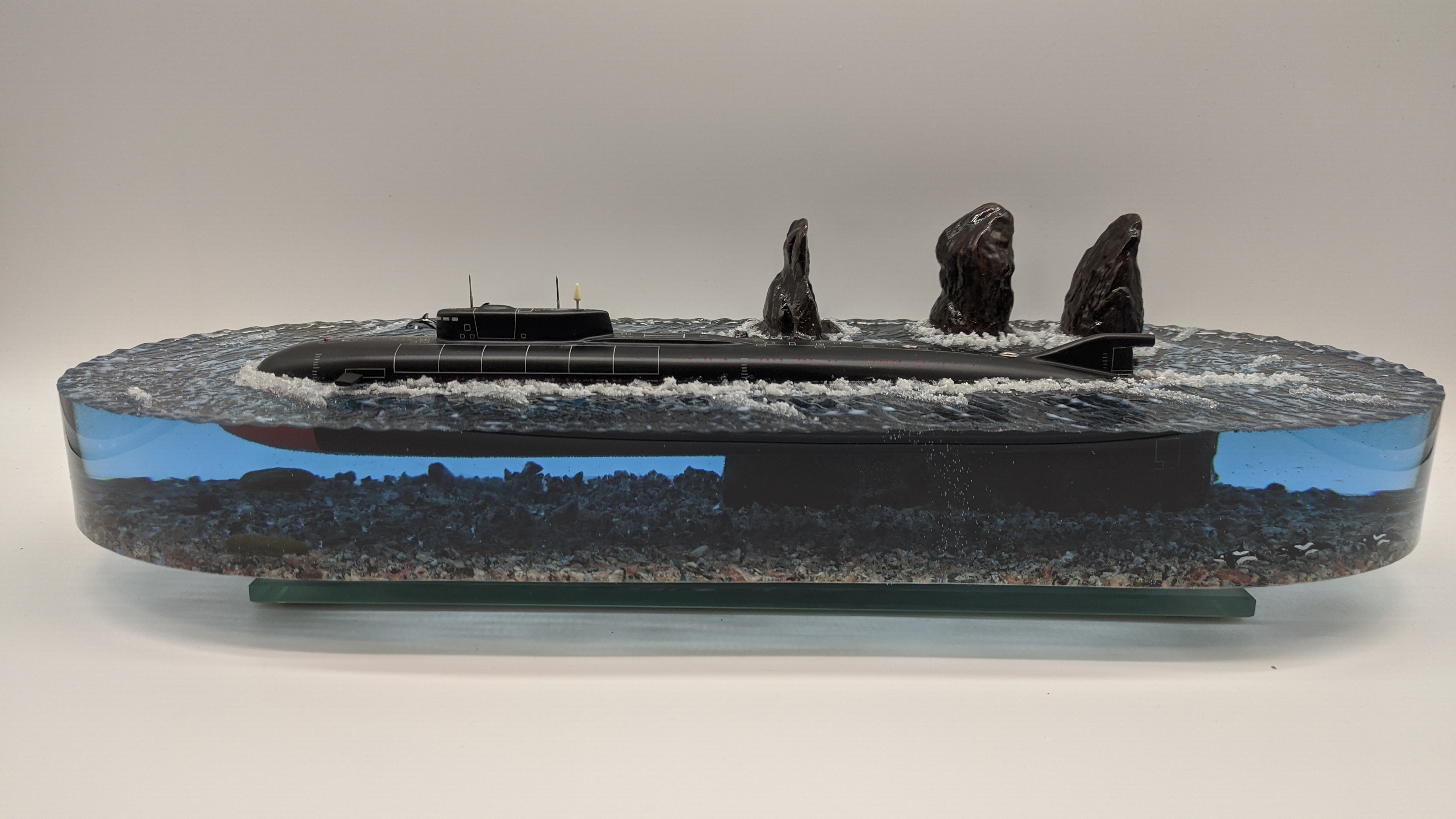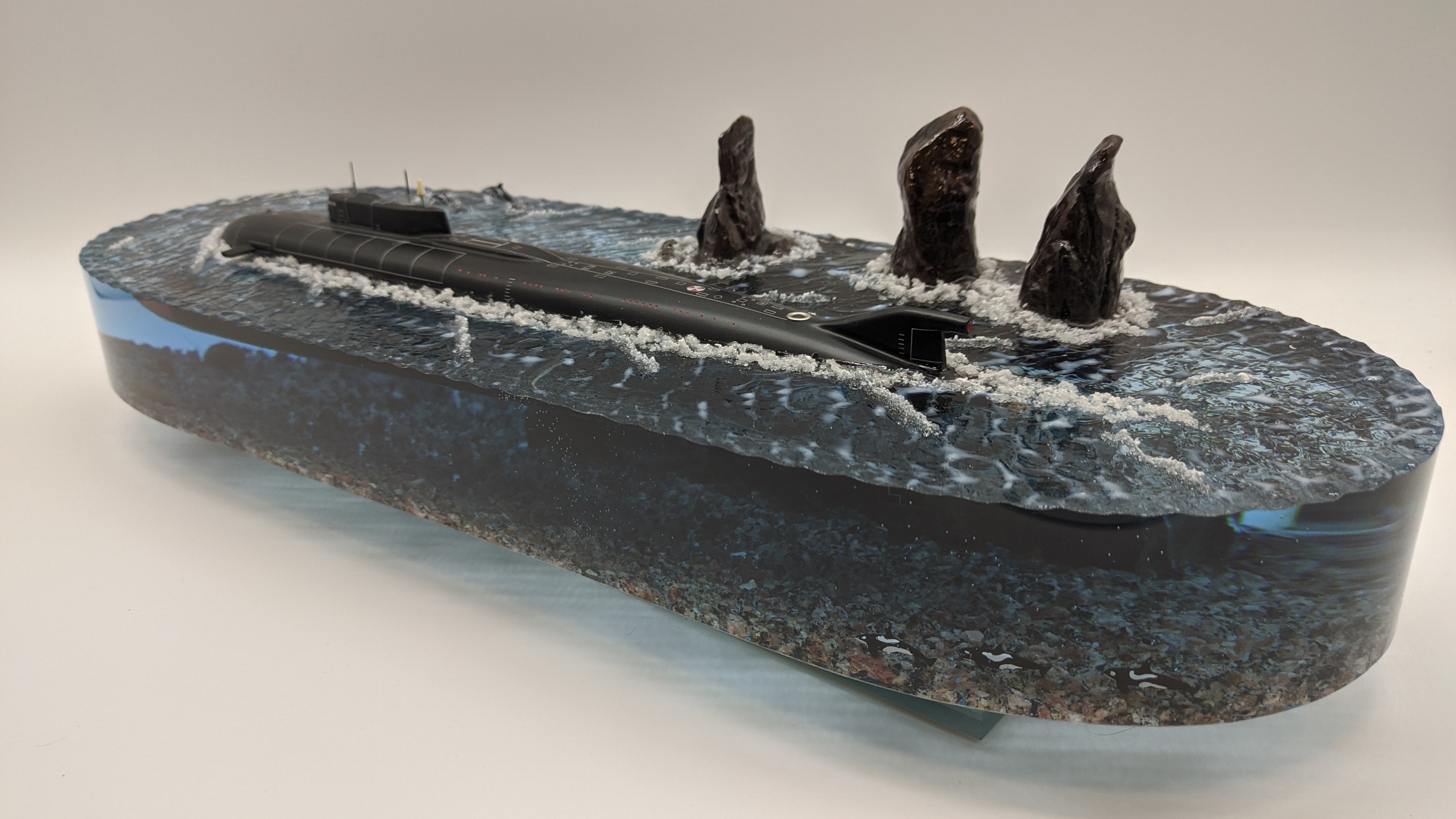 Модель Подводной лодки 949А "Антей" на фоне скал "Три брата" Авачинская бухта ТОФ. Высокая детализация моделей и разметки. Дно натуральная гранитная крошка. На диораме так же представлены касатки и дельфины. Всё выполнено в масштабе для сравнения размеров лодки с животными..