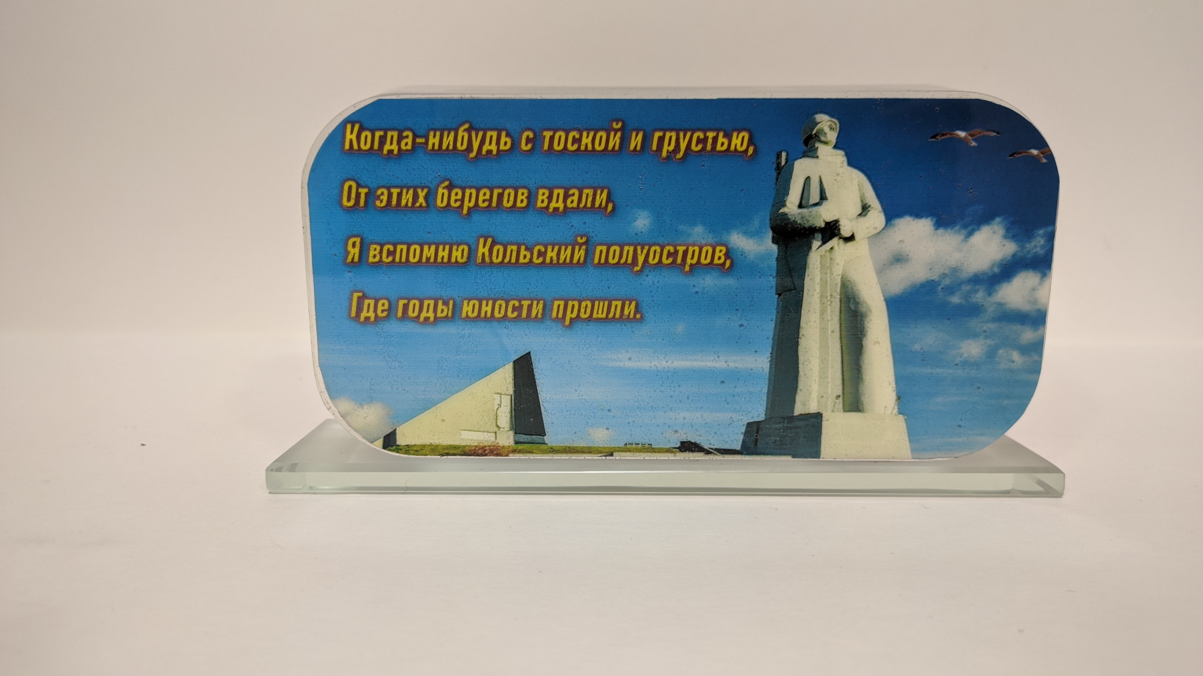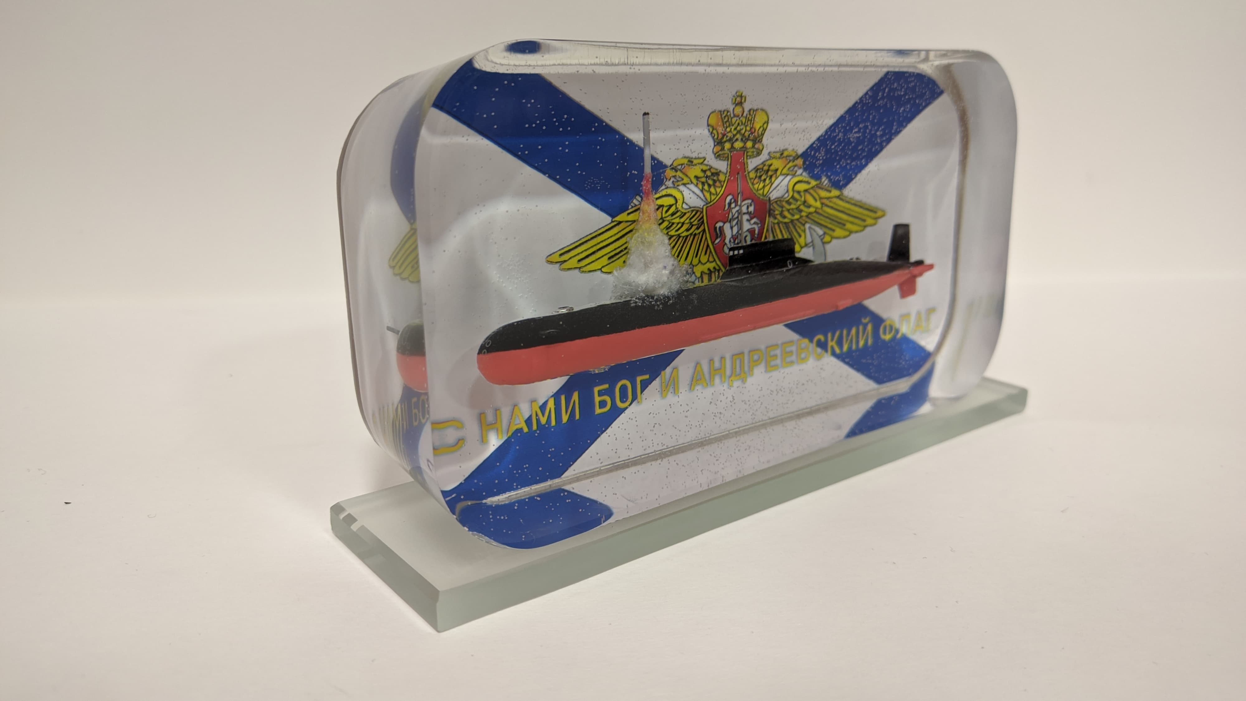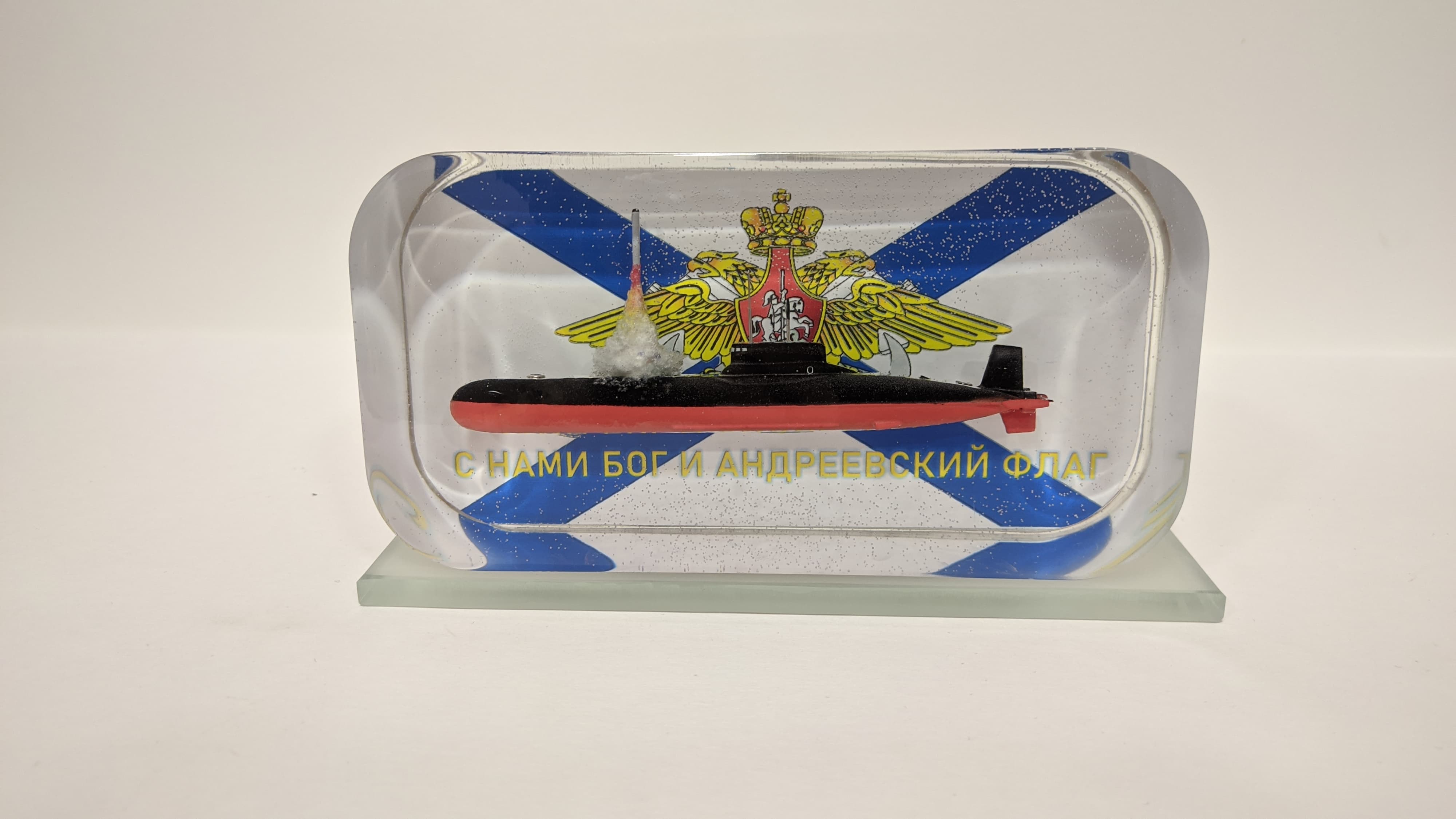 Сувенир ТАРПКСН проект 941 "Акула" с имитацией пуска МБР на фоне андреевского флага с эмблемой ВМФ. С тыльной стороны памятная надпись с фотографией памятника "Защитникам Заполярья". Подставка из стекла 8мм. Возможна добавление подсветки с аккумулятором и управлением с телефона (+3000Р)