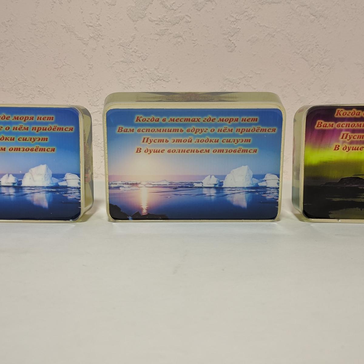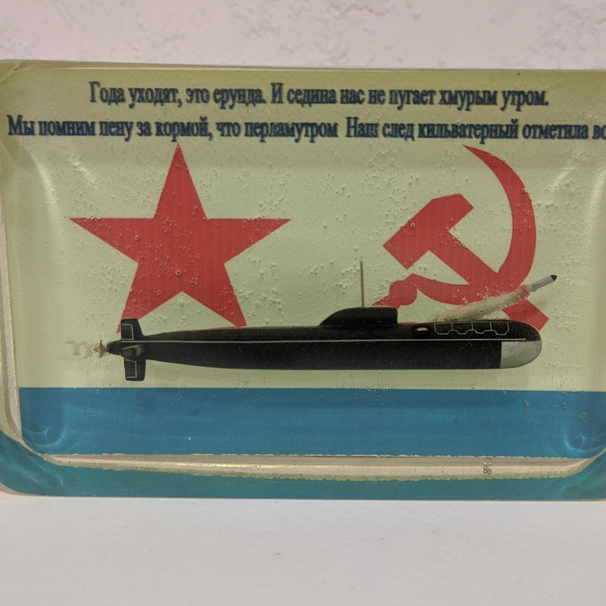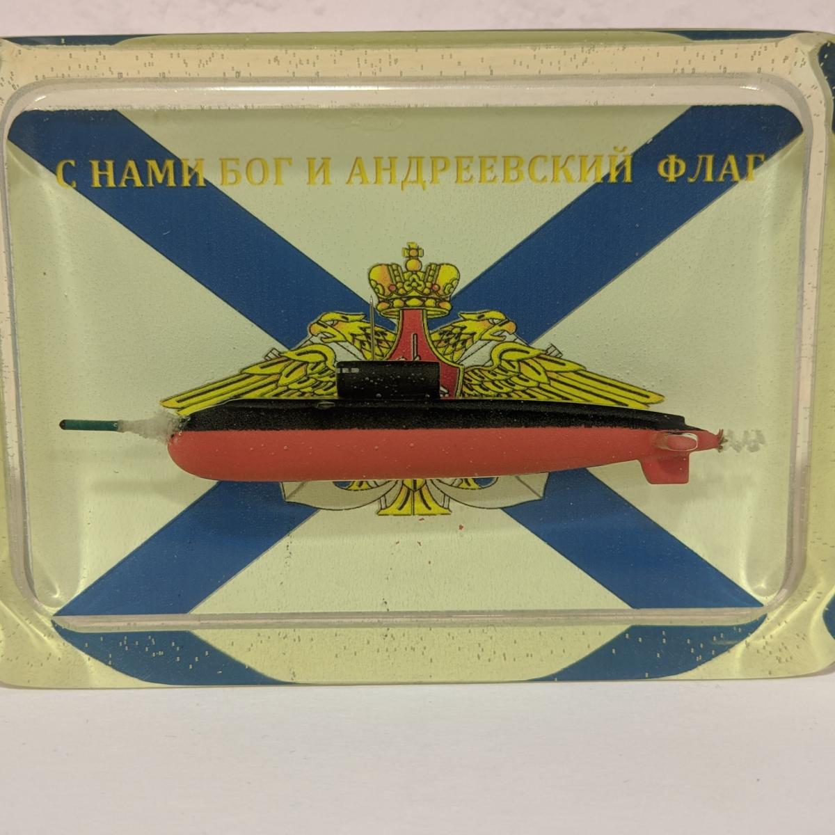 Сувенир на память. Подводная лодка на фоне андреевского флага. На реверсе памятная надпись на фоне морского пейзажа. Возможно докупить подставку с подсветкой (+500р).