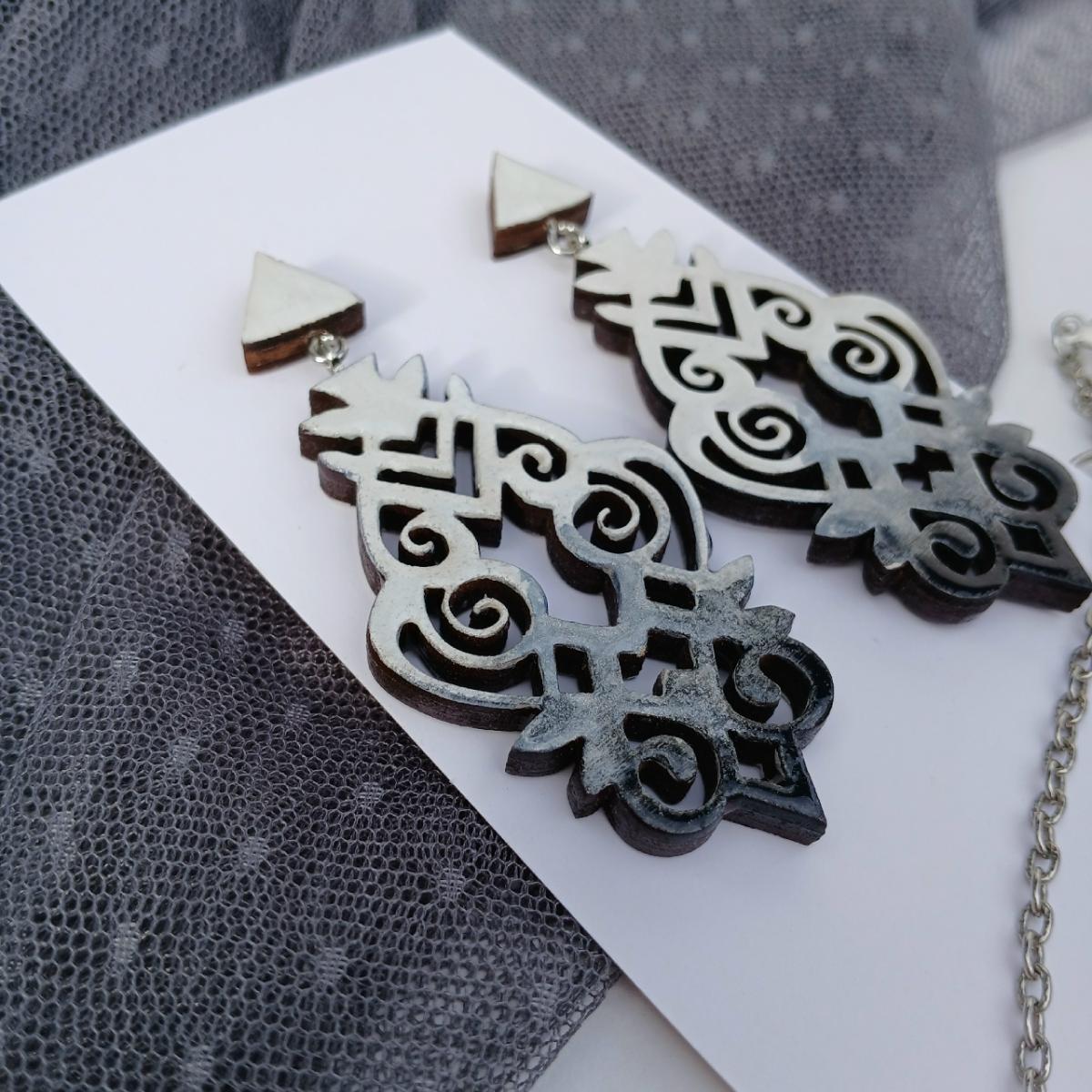 Серьги выполнены вручную из натурального дерева толщиной 0,4 мм. Каждый экземпляр имеет авторский дизайн, роспись, сделанную художником, и покрыт защитной ювелирной смолой, что создаёт иллюзию стеклянной поверхности