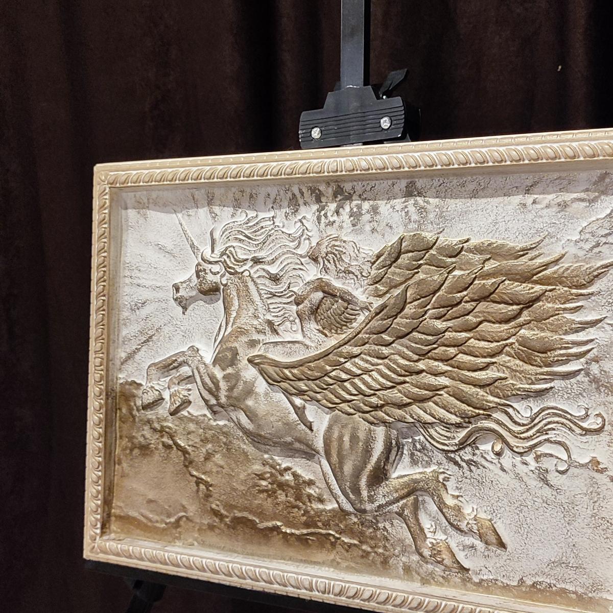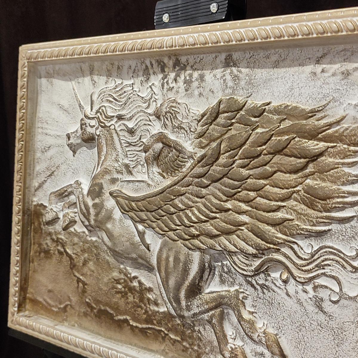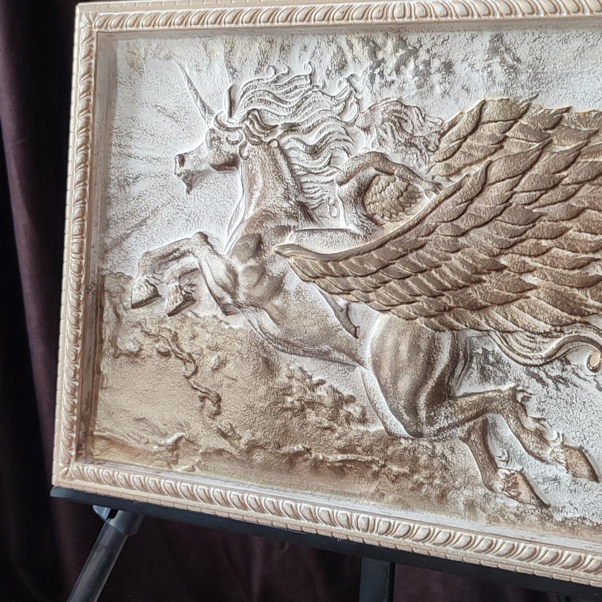 Панно с рельефным изображением "Полёт Пегаса" Размер: 45*32 см. Барельеф – цельнолитая композиция в раме толщиной 3.5 см, заключающая в себе гармонию формы и содержания.