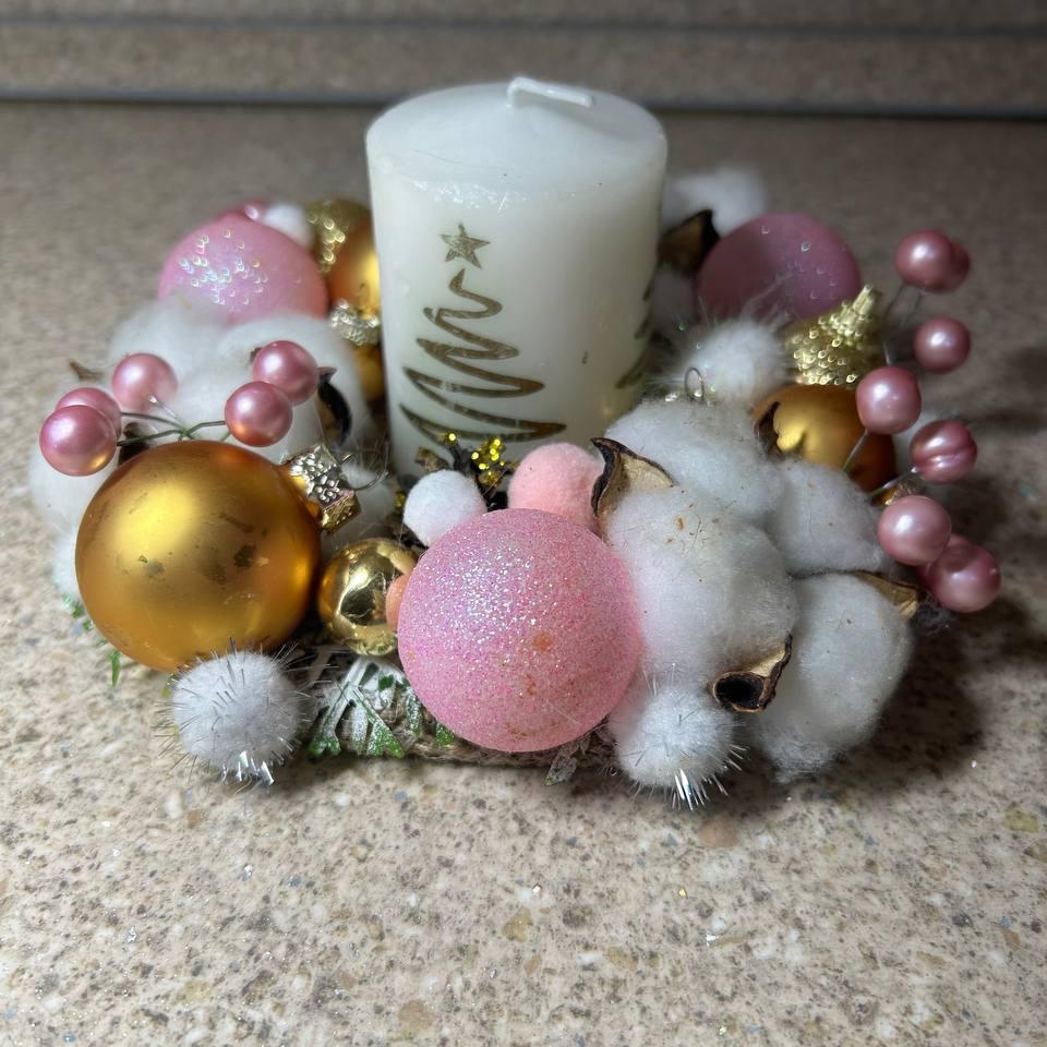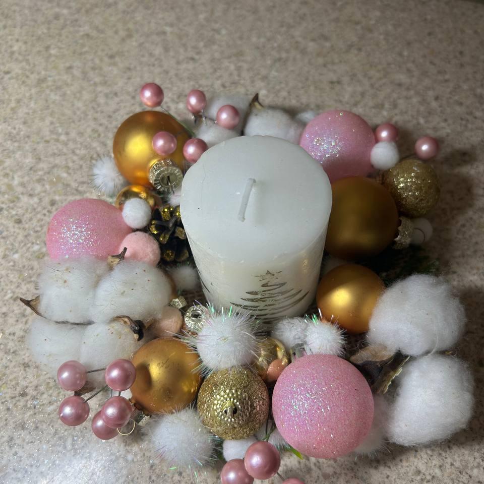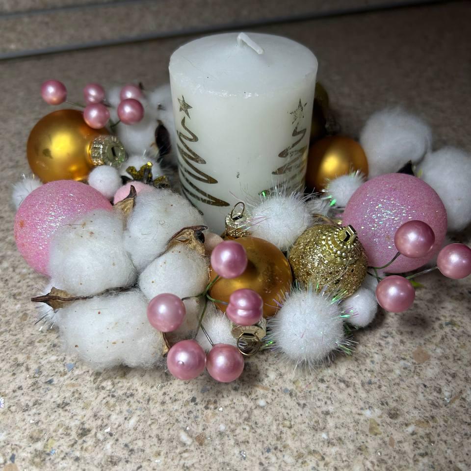Подсвечник, созданный из новогодних шаров, шишек и декоративных элементов, представляет собой яркий и оригинальный элемент праздничного декора. Его основа может быть выполнена в виде круглой или овальной формы, обеспечивая устойчивость и безопасность.