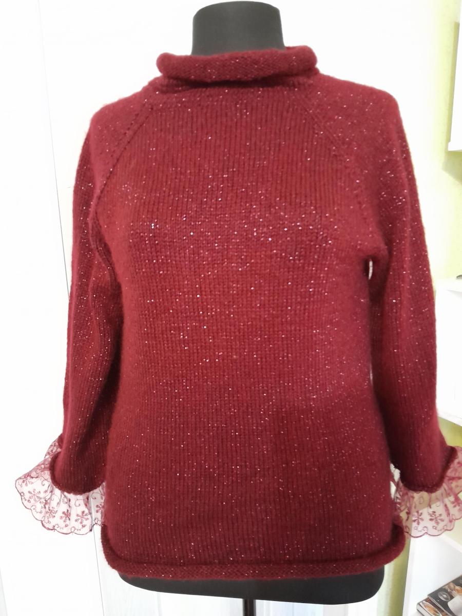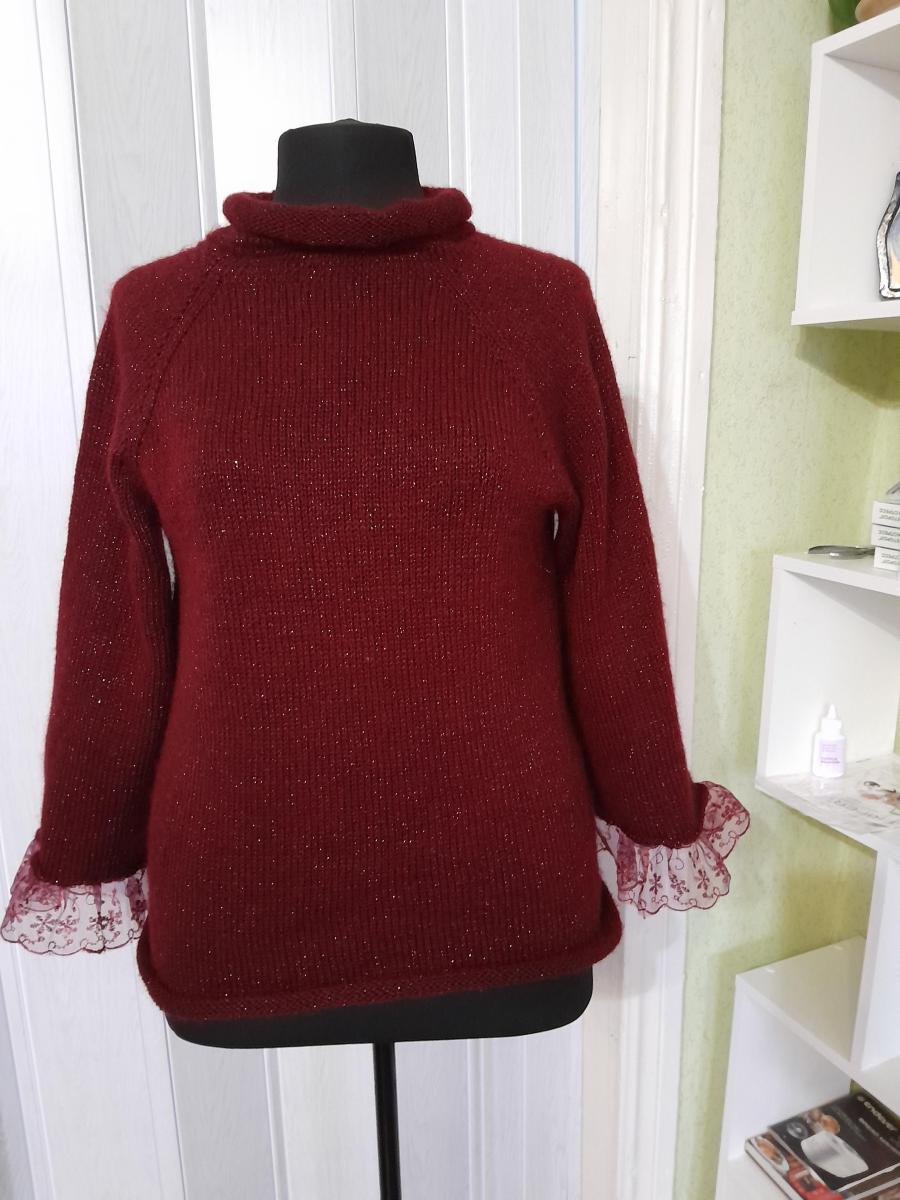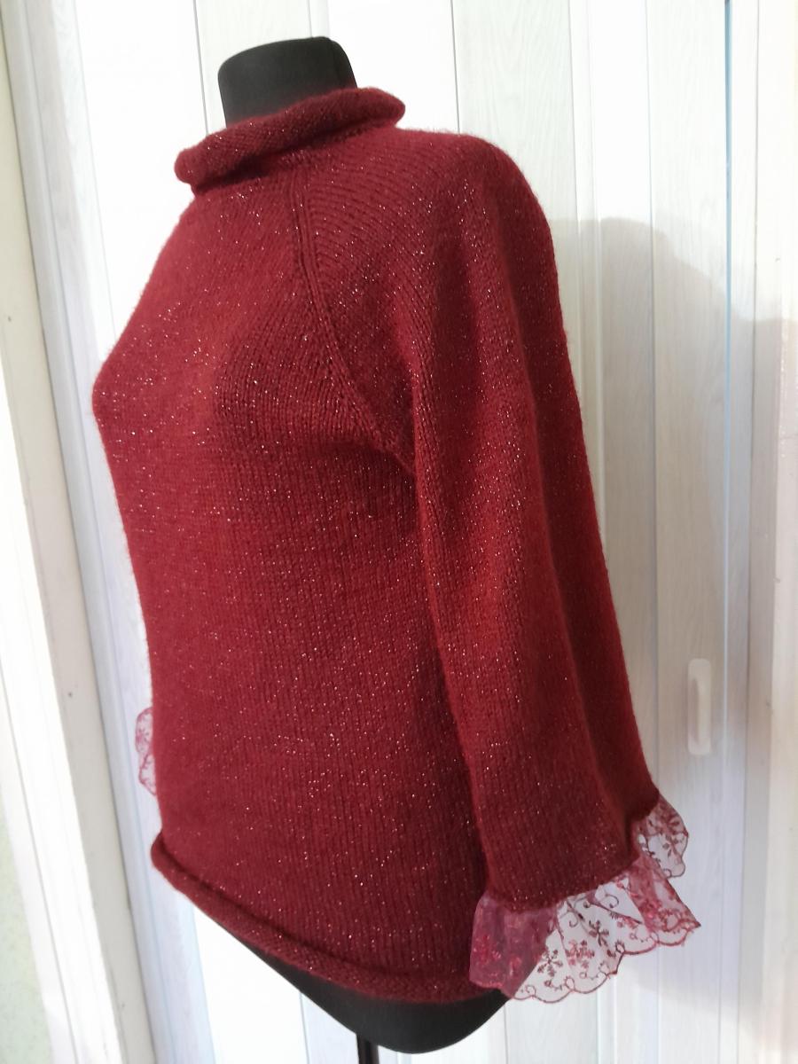 джемпер ручной работы, связан на спицах из немецкой пряжи,полушерсть с добавлением мохера и тонкой ниткой люрекса. Рукав 3/4 отделанкружевом,длина 57см,длина изделия по спинке 60см. Манекен на котором представленно изделие 48-50 размера