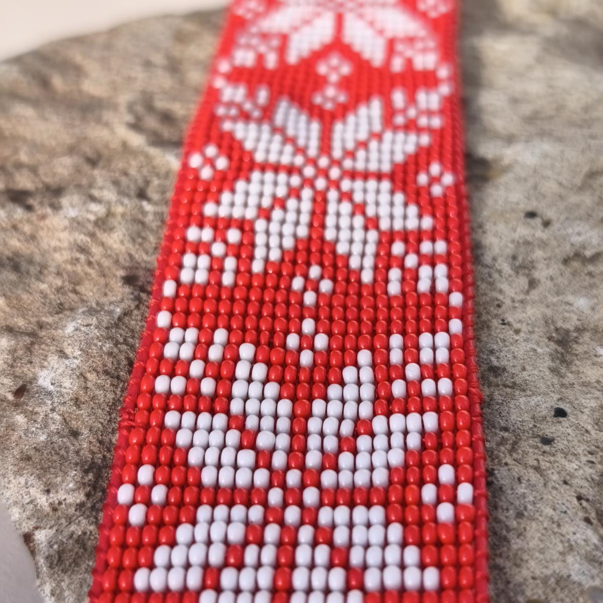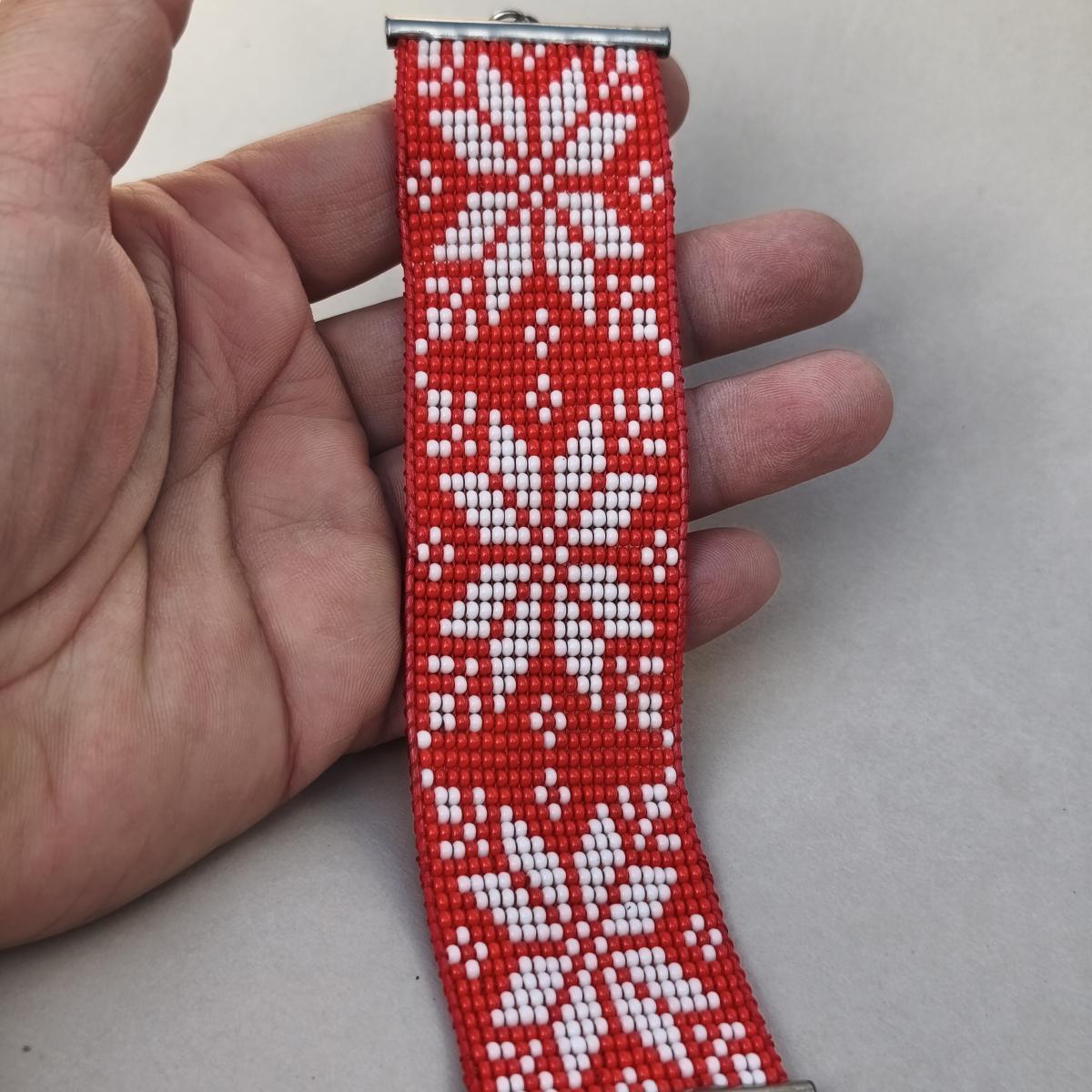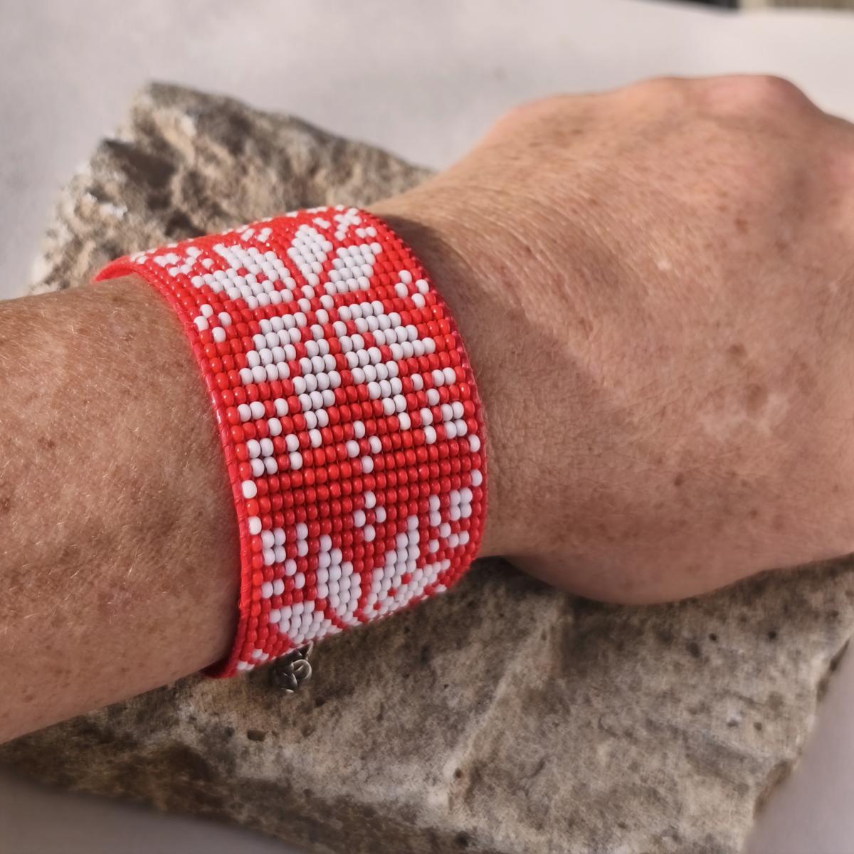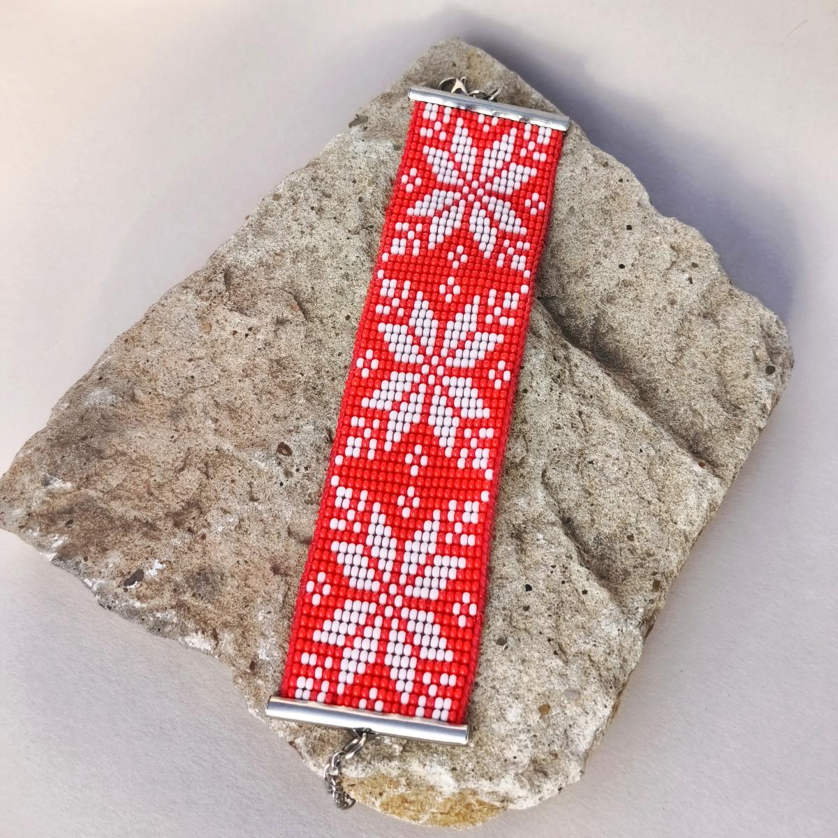 Браслет ручной работы. Выполнен из качественного чешского бисера. Крепления - металлическая фурнитура.Традиционный орнамент и цвет славянских оберегов. Яркий, броский, оригинальный и в тоже время практичный .