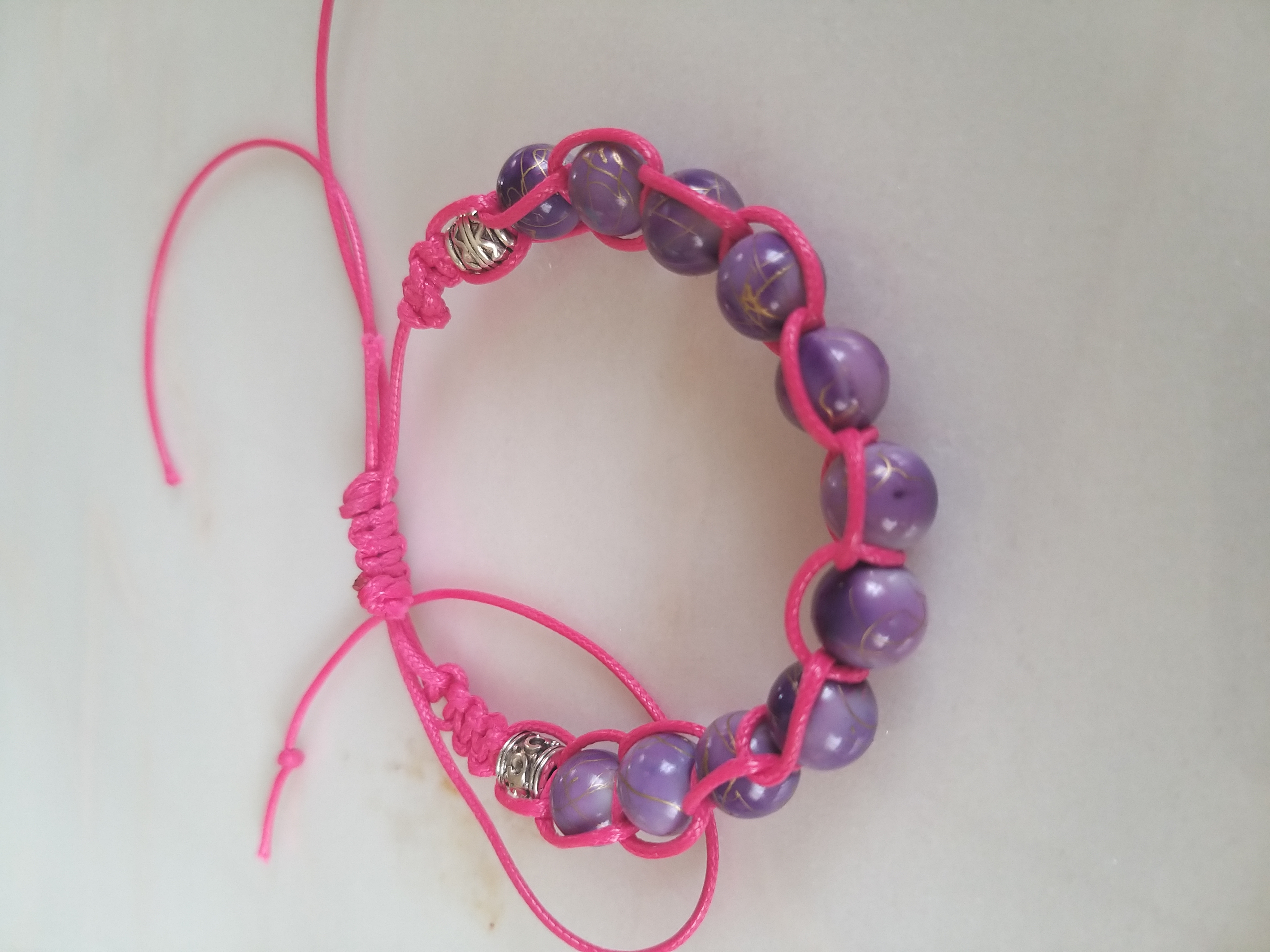 Отличный браслет с розовой яркой нитью и сиреневыми бусинами, подойдет как и озарной девчонке так и леди на пляже!
