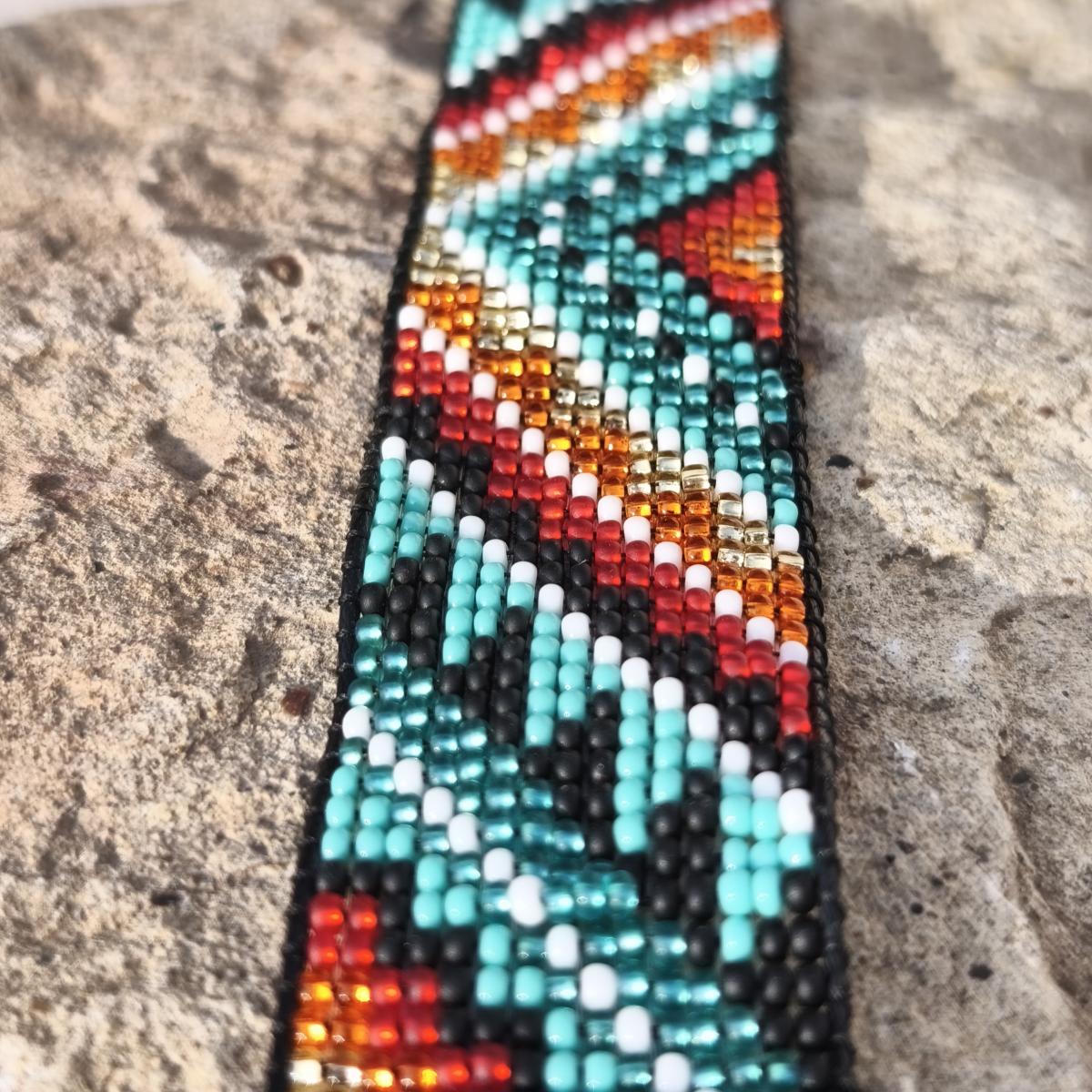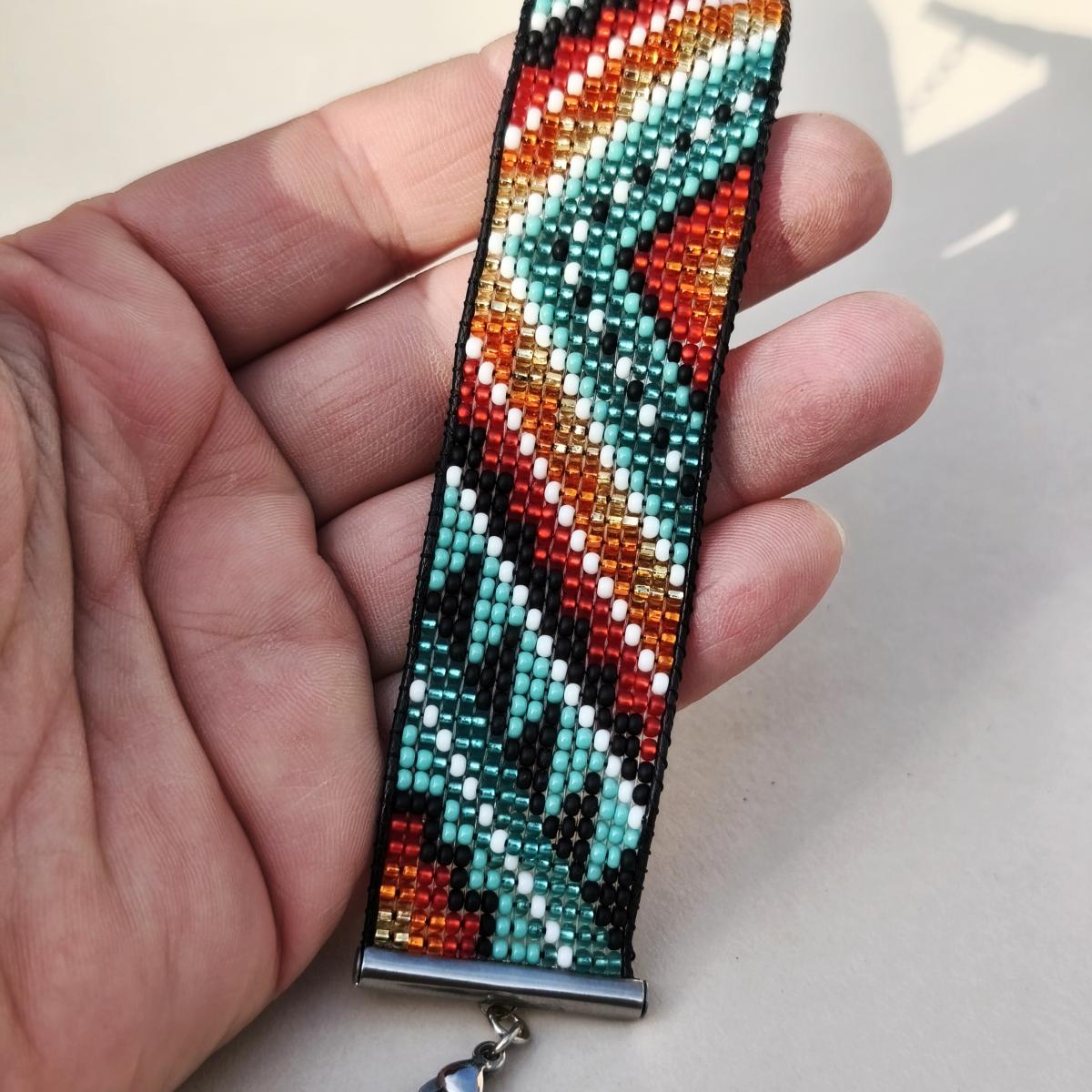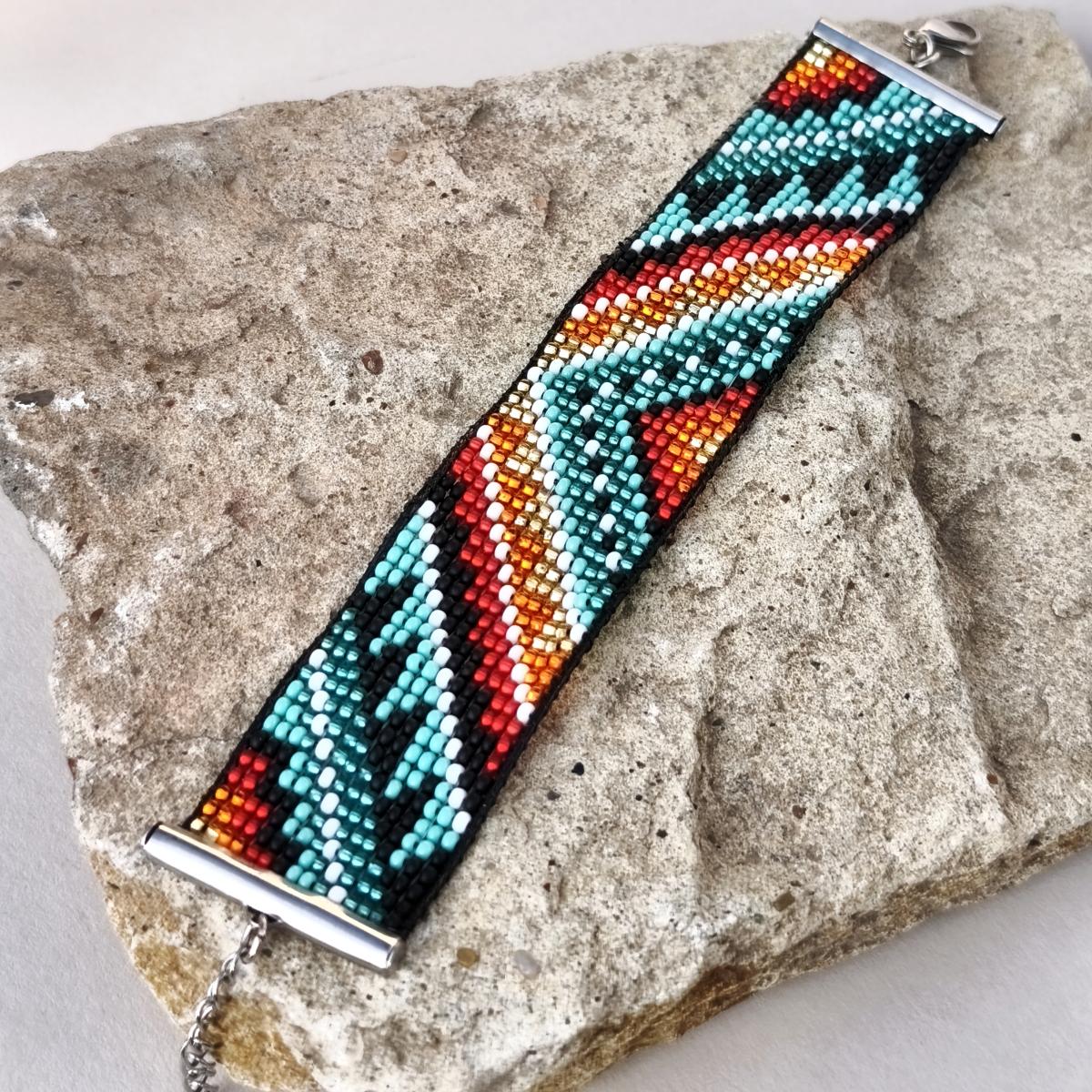 Этнический браслет из бисера ручной работы. Соткан из качественного чешского бисера на станке. Орнамент разработан на основе традиционных, национальных узоров индейцев айдахо.