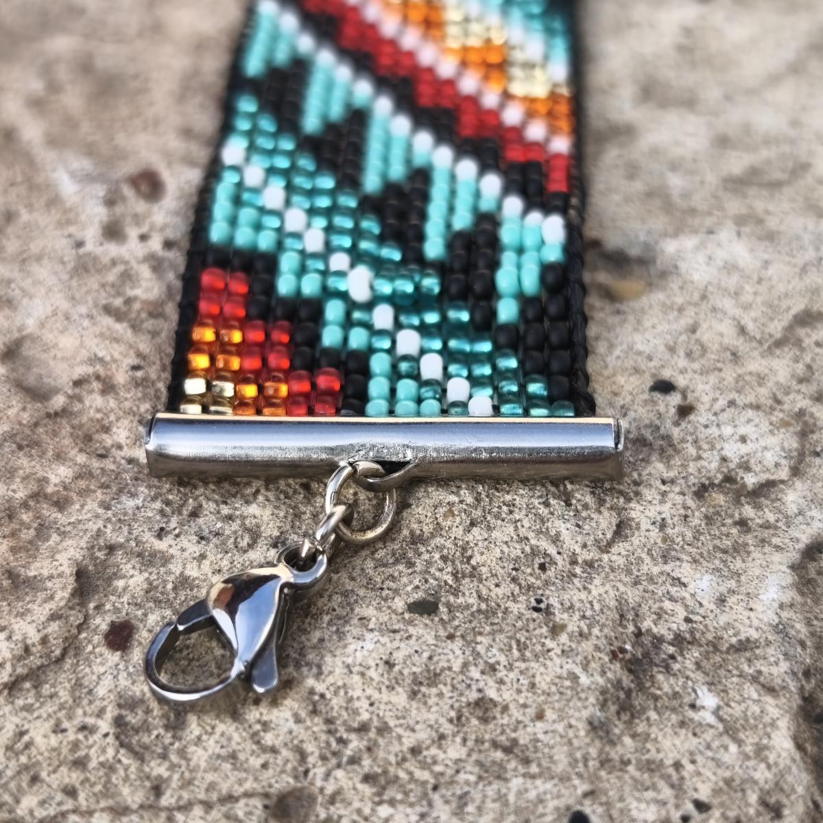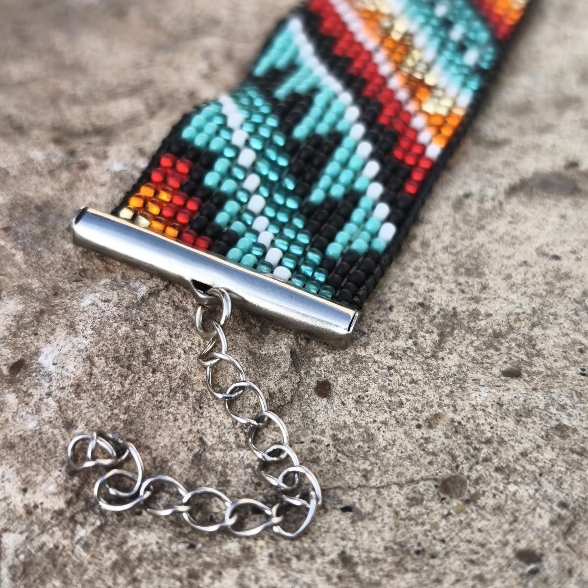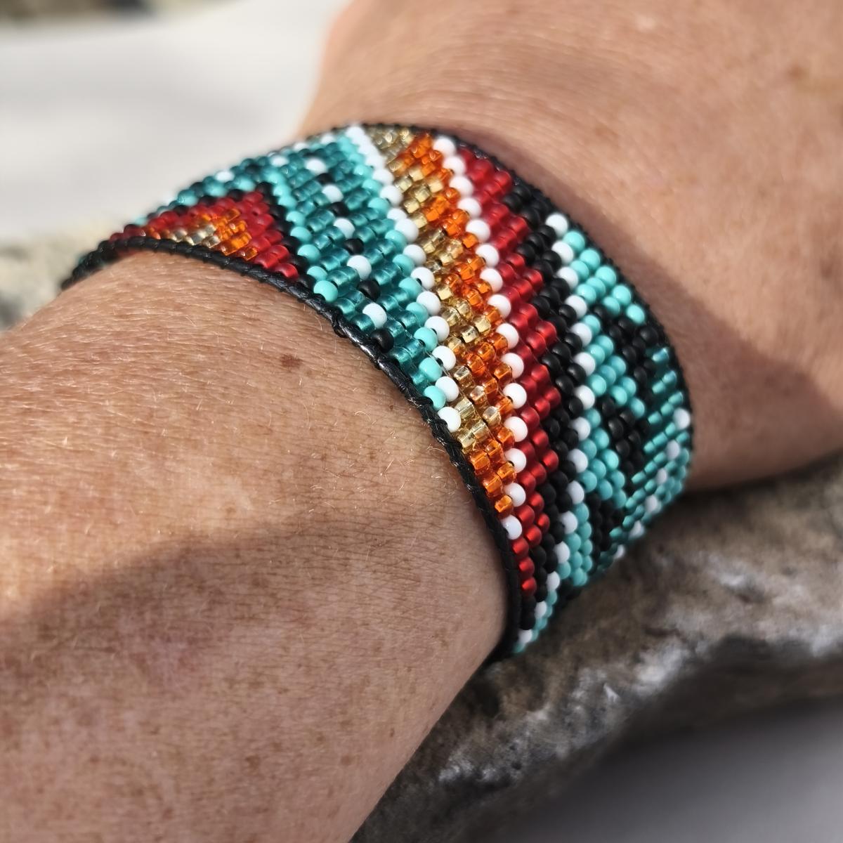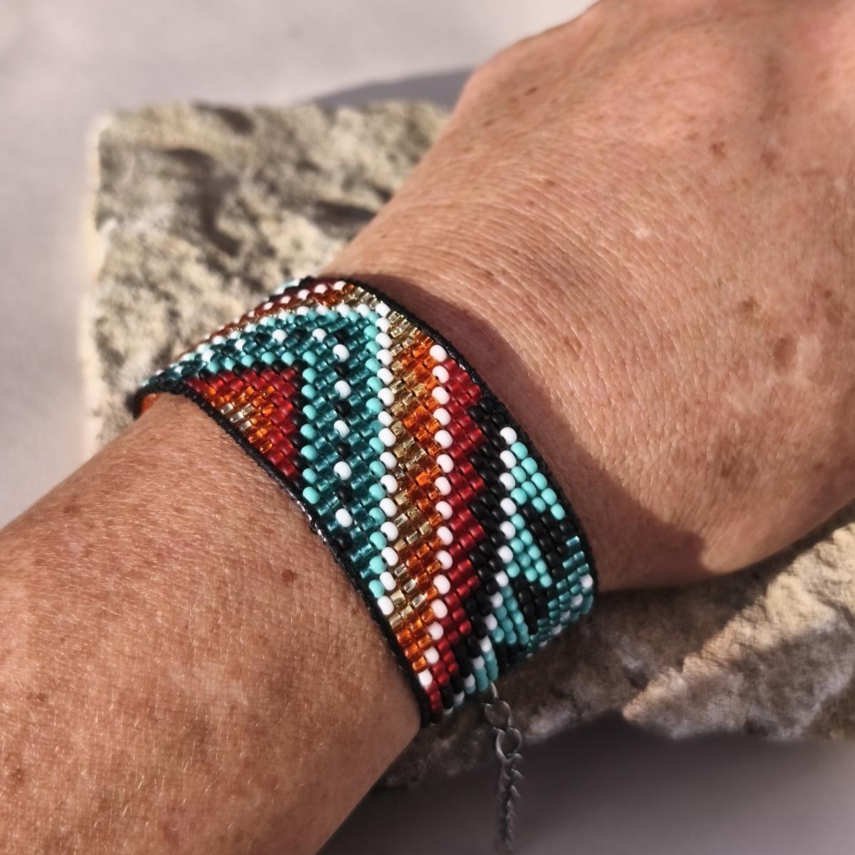 Этнический браслет из бисера ручной работы. Соткан из качественного чешского бисера на станке. Орнамент разработан на основе традиционных, национальных узоров индейцев айдахо.