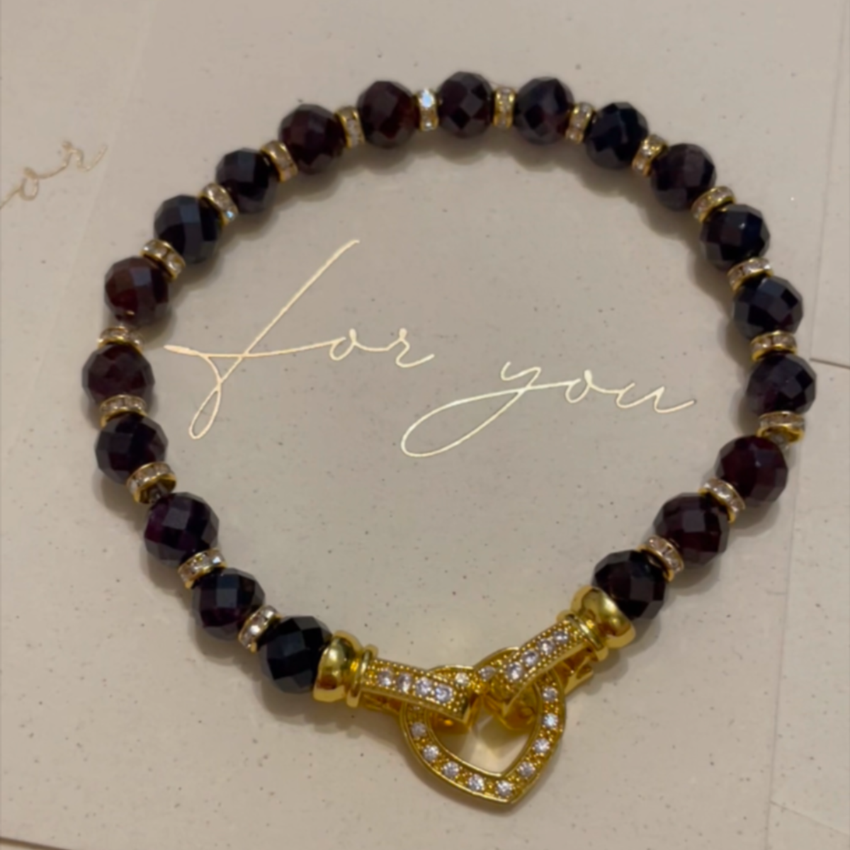 Этот браслет — не просто украшение, а настоящий символ глубоких чувств и искренней привязанности. Гранат, известный как камень страсти и энергии, в сочетании с благородной золотой оправой подчёркивает ценность и значимость отношений.
