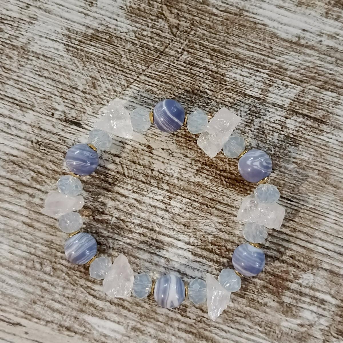 Комбинация голубого агата, кварца и опалита создает гармоничный баланс энергии, способствующий внутреннему покою, креативности и уверенности. Эта комбинация идеально подходит для тех, кто стремится обрести внутренний покой, повысить свою интуицию и развить творческие способности.