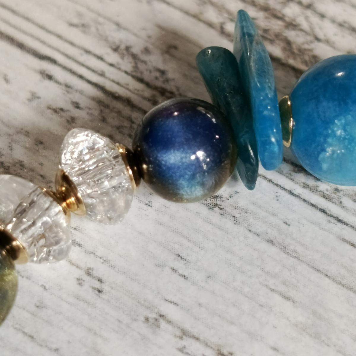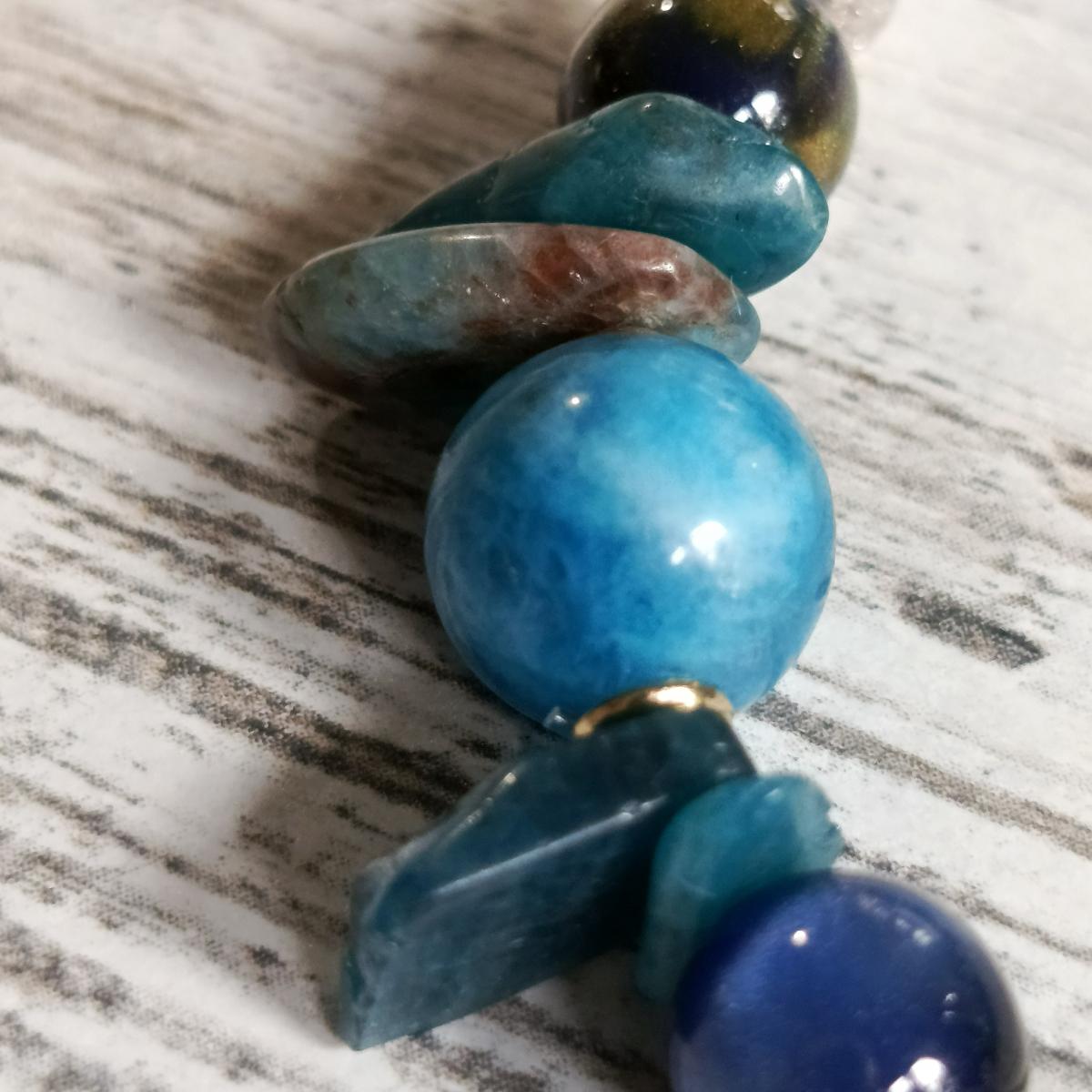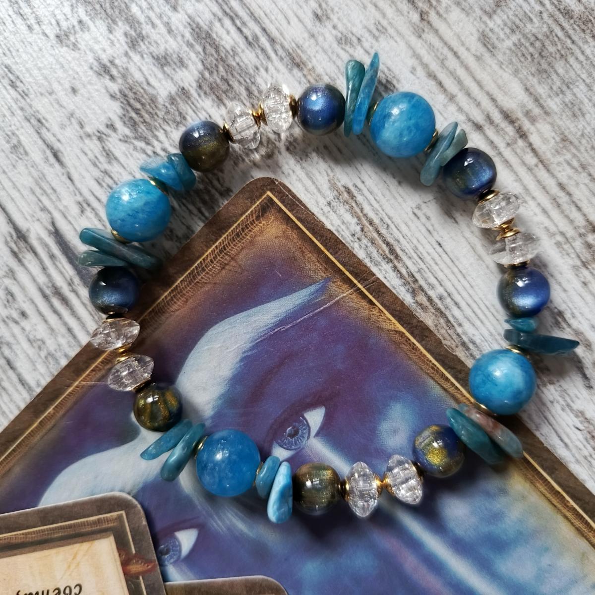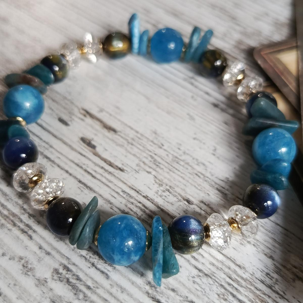 Сочетания голубого апатита, чёрного опалита и хрусталя кракле - обладает уникальными характеристиками: апатит способствует мотивации и ясности, опалит — трансформации и раскрытию подсознательных аспектов, а кракле — защитой и очищением энергии. В совокупности они создают цикл, включающий очистку пространства, диагностику внутренних блоков и их последующее выражение и преодоление.