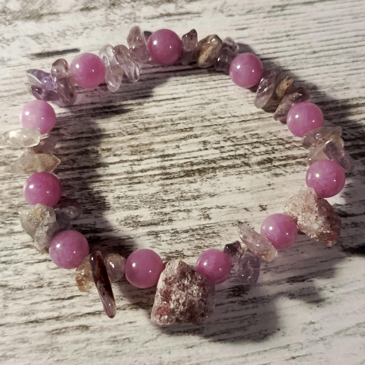 Розовый апатит, аметрин и клубничный кварц в сочетании создают мощный и сбалансированный энергетический поток, направленный на исцеление сердца, духовный рост и гармонизацию внутренних противоречий.