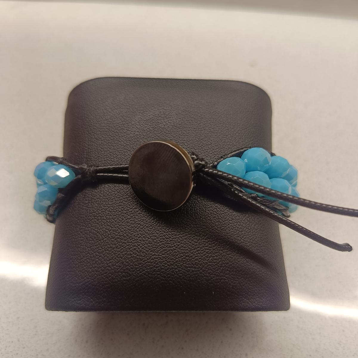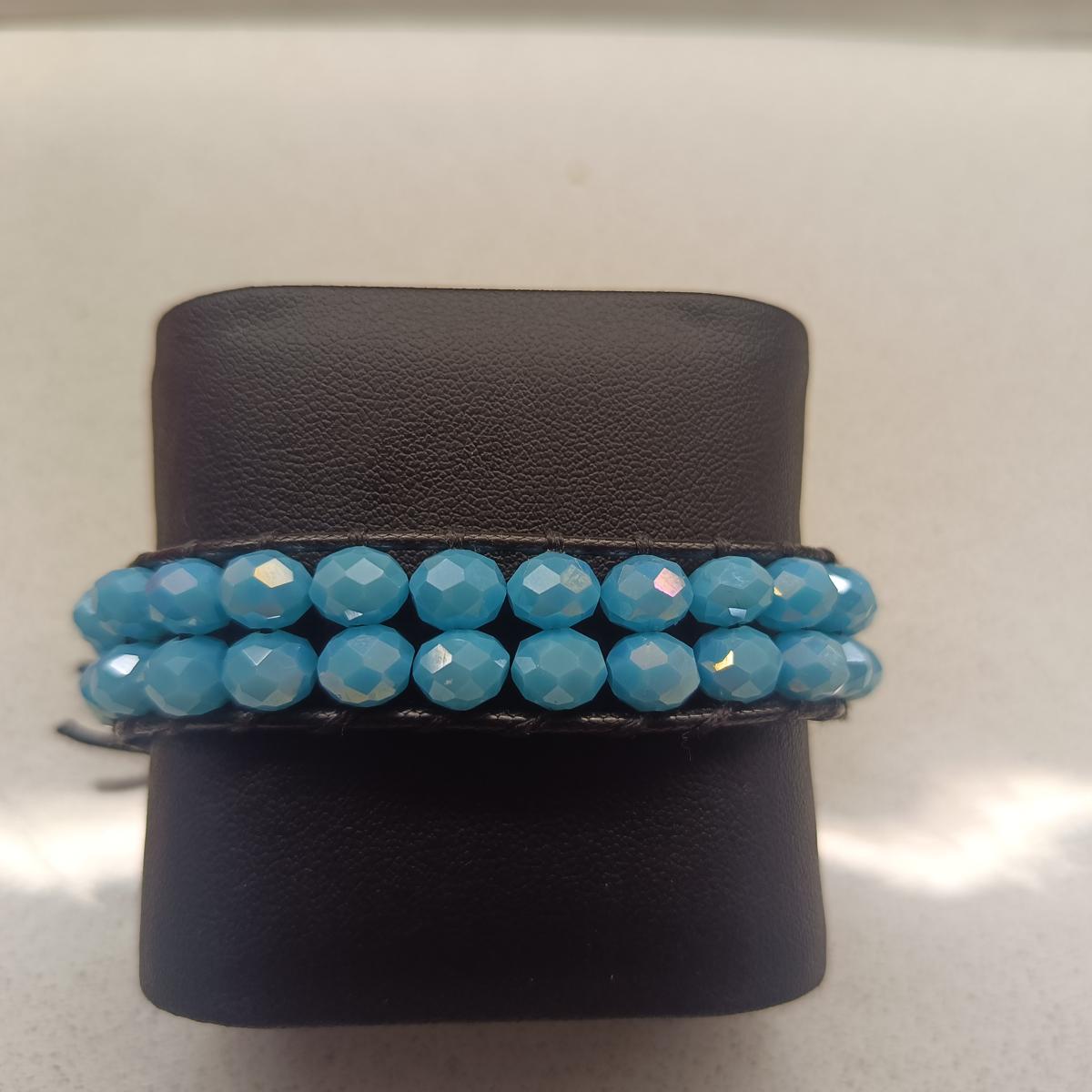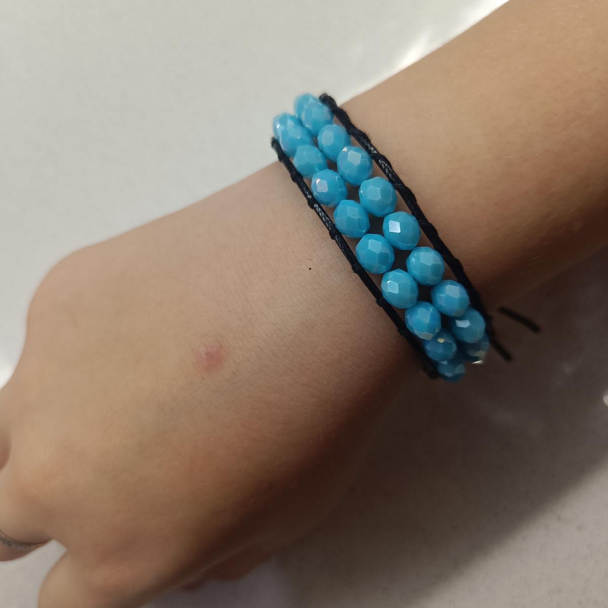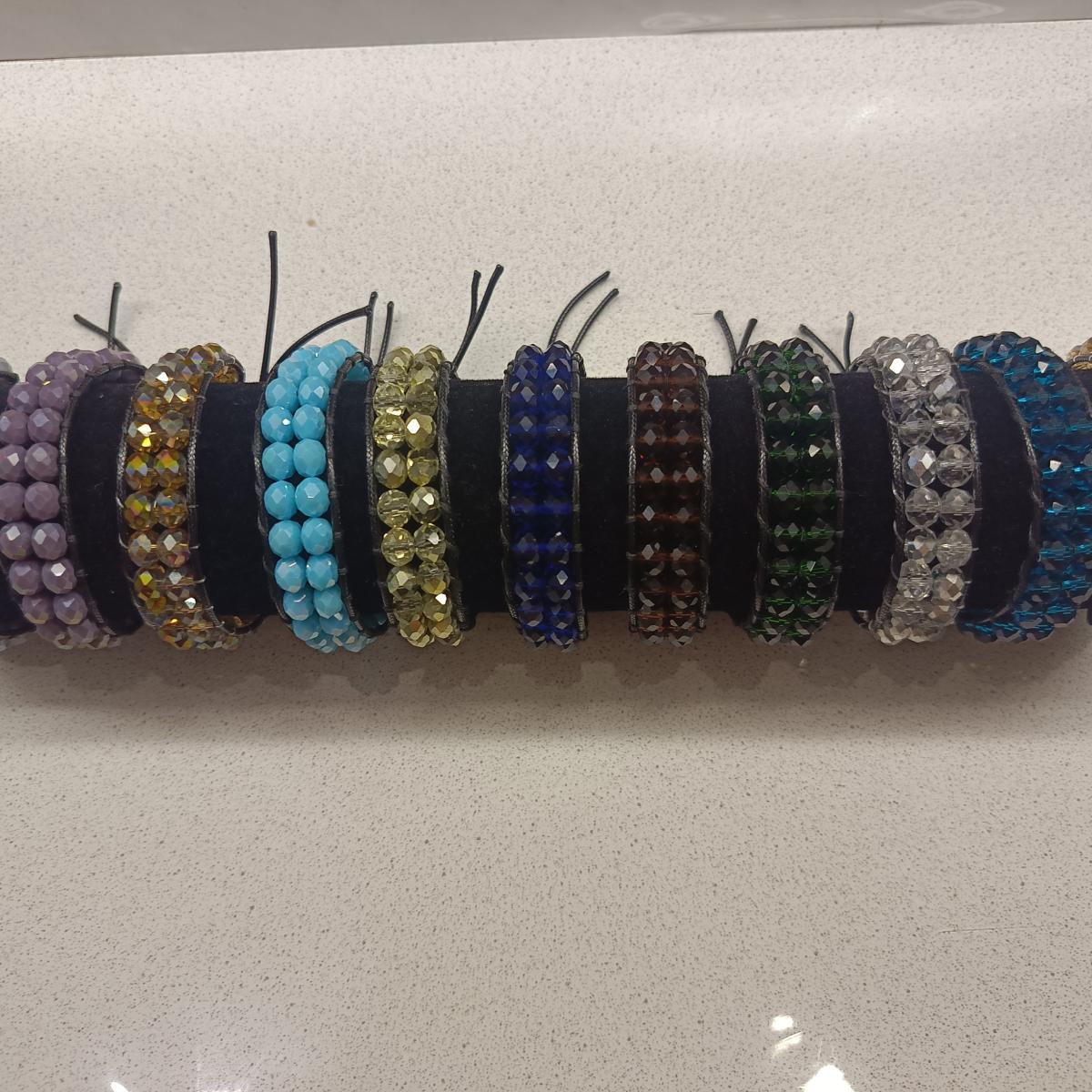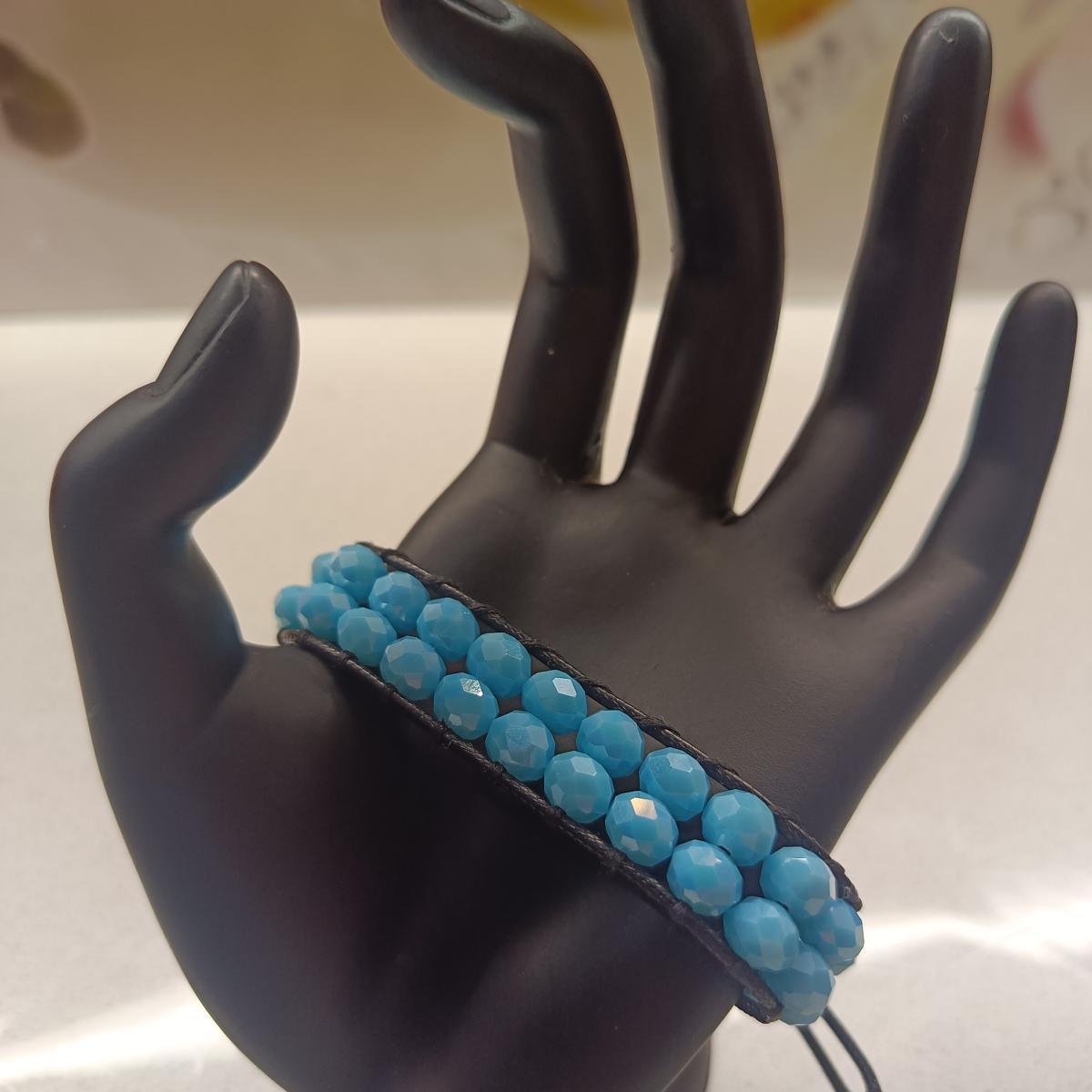 Браслеты сплетены в технике Чан Лу в два ряда из хрустальных бусин. В основе браслета вощеный шнур 1,5 мм, вощеные нити или леска. Хрустальные бусины размеров 8 мм. Застежка - металлическая пуговица и петелька. Размер для запястья 15-17 см.