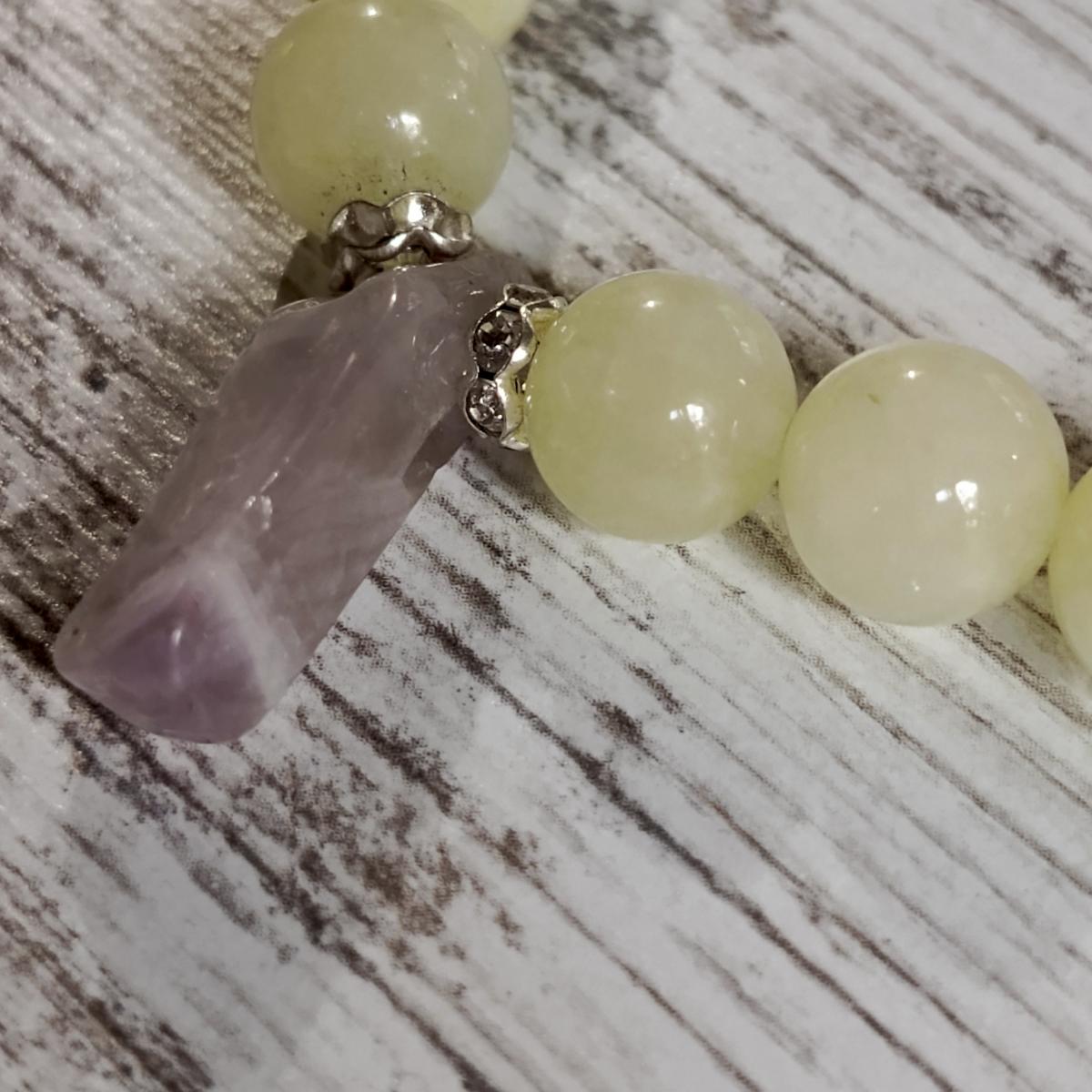 Сочетание пренита и аметиста представляет собой гармоничный и мощный дуэт, сочетающий их индивидуальные свойства и создающий синергию. Аметист, связанный со стихиями воздух и вода, обладает успокаивающей, духовной энергией, способствует трансформации, защите и медитации, а также связан с верхними чакрами. Пренит, связанный с землей и водой, обладает мягкой, умиротворяющей энергией, способствует принятию, внутреннему спокойствию и связи с ангельскими сферами, работая с сердечной чакрой.